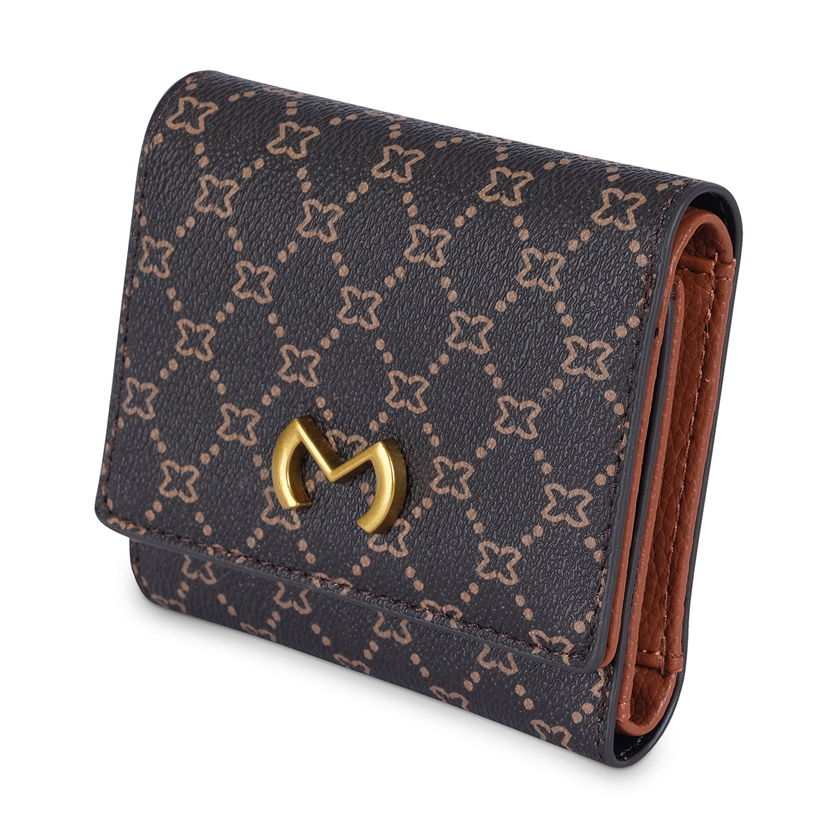 Brown monogram trifold wallet featuring M branded plate, with ample card slots and internal money compartment