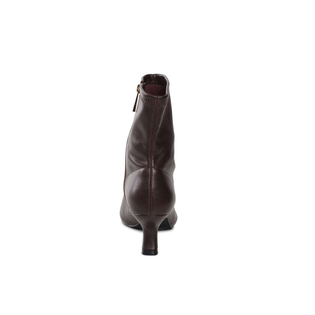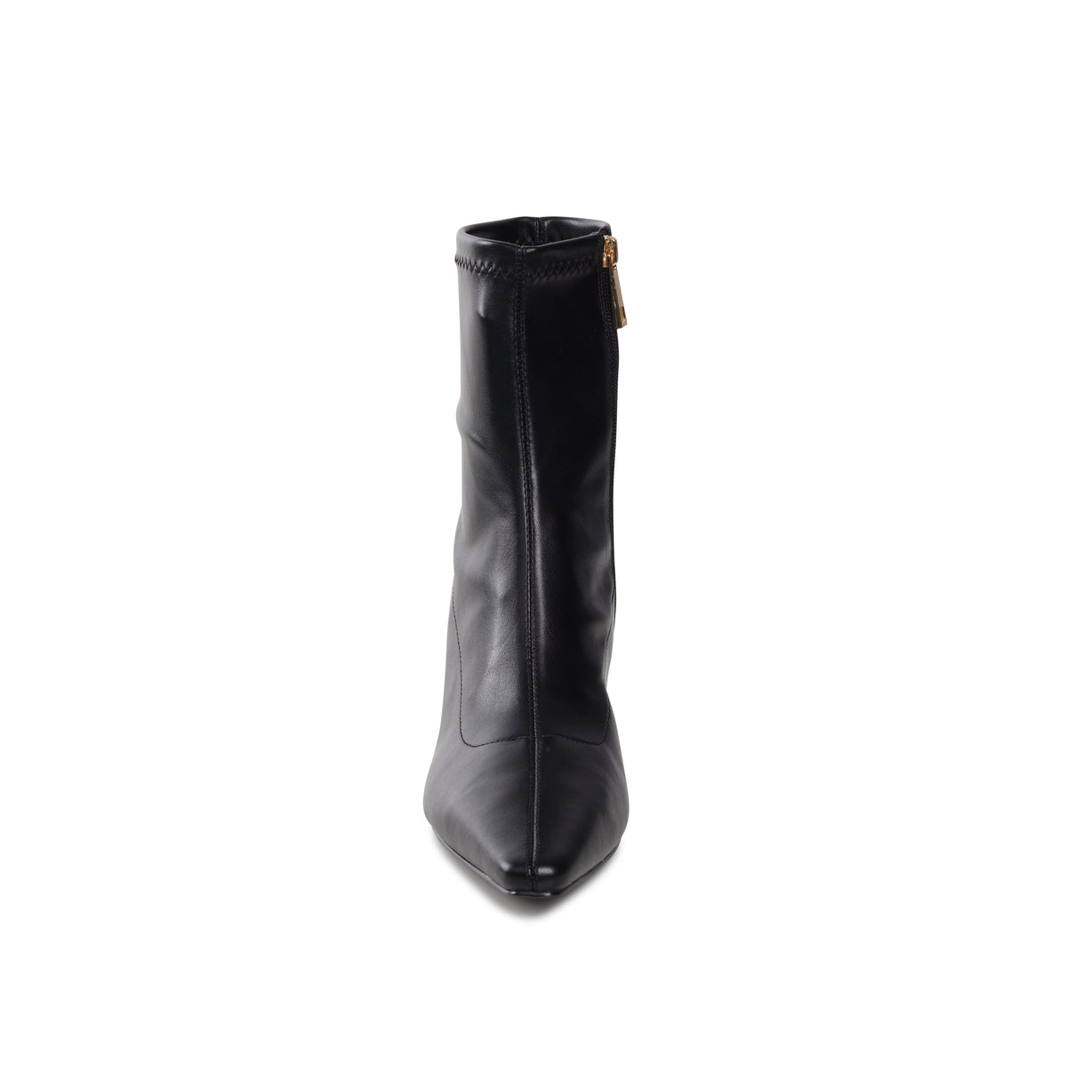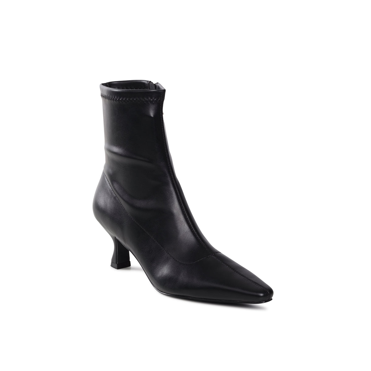 Annushka, a sleek, black ankle boot with a pointed toe with akitten heel. The boot is made from leather-like stretchy smooth material that hugs the ankle for a refined and elegant look. This boot has a minimalist streamlined design, making it a versatile option for both formal and casual wear, offering a sophisticated touch to any outfit.