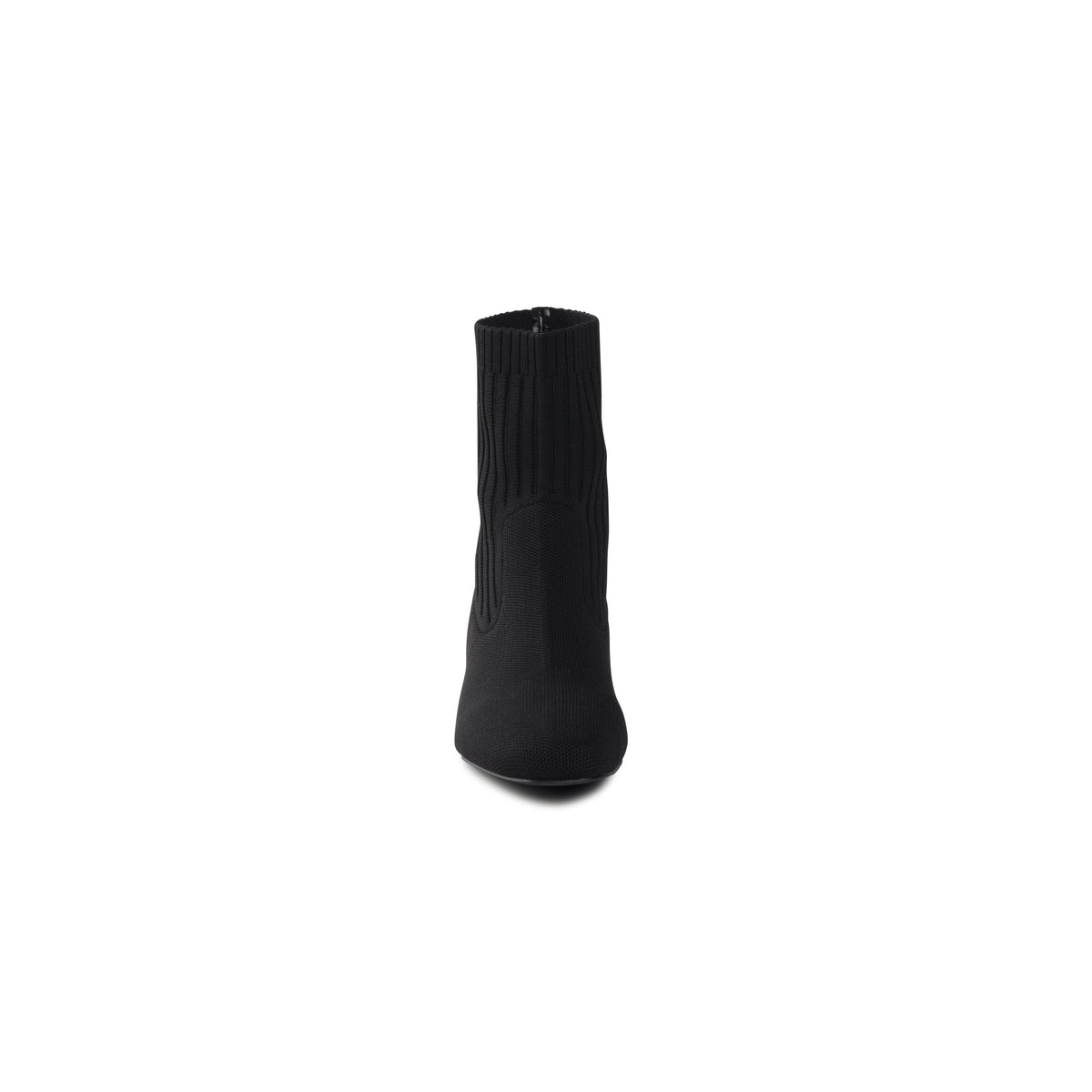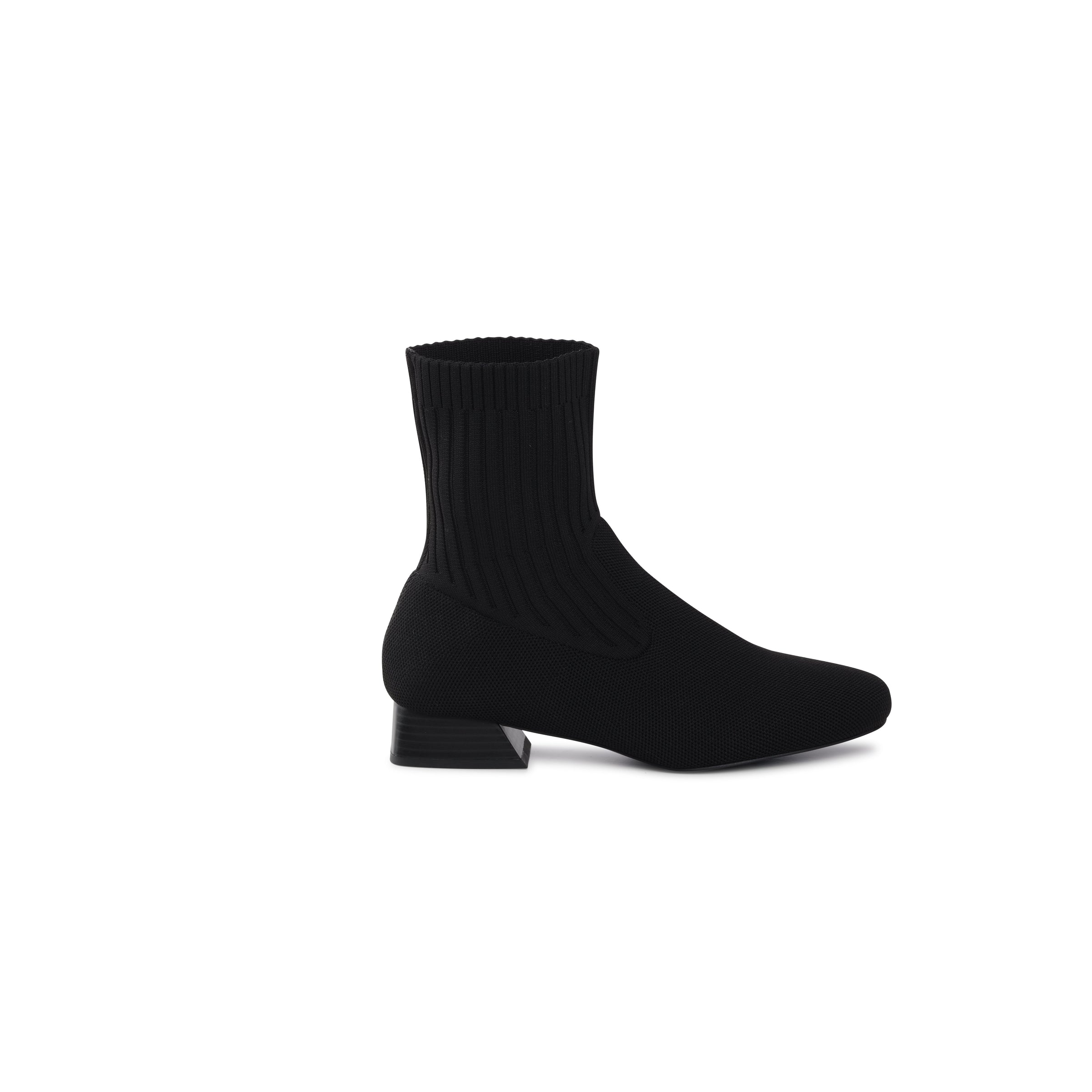 The image shows a sleek, modern black ankle boot with a minimalist design. The boot has a pointed toe and a low, angular heel, giving it a contemporary, streamlined appearance. The shaft appears to be made from a ribbed, sock-like material, which provides a snug, fitted look, and adds a subtle