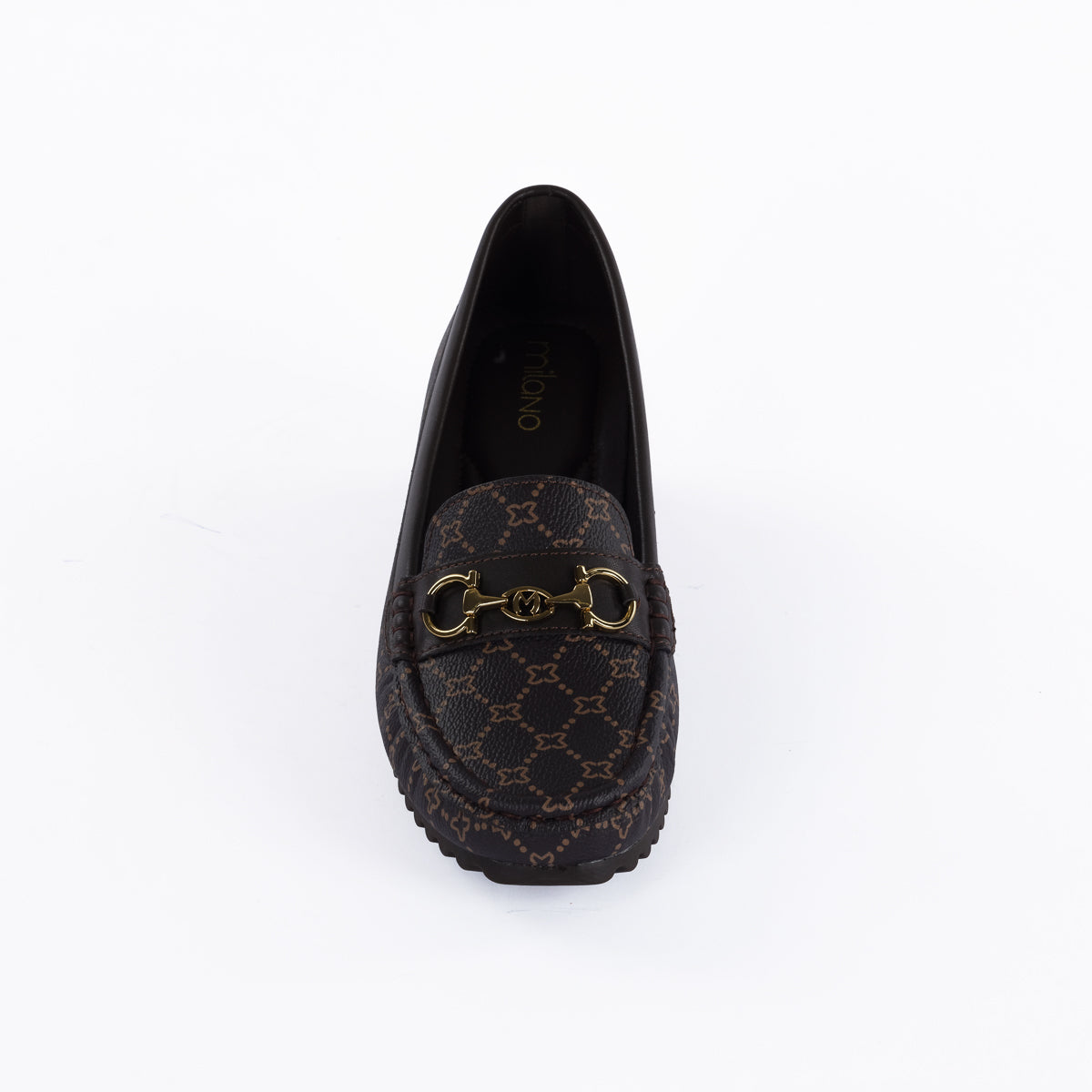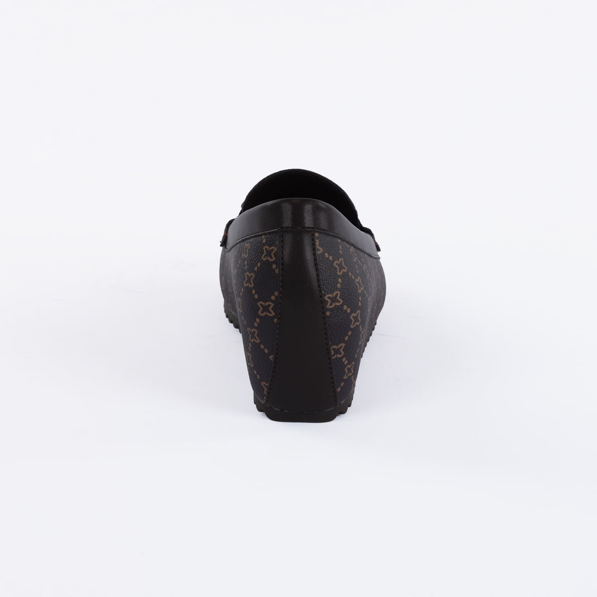 Stylish Monogram Wedge Loafer, featuring a sophisticated all-over monogram pattern in a rich brown colorway, these shoes add a touch of luxury to any outfit. The classic moc-toe design and gold-toned horsebit hardware on the vamp provide timeless elegance, while the concealed wedge heel offers a subtle lift and all-day comfort.