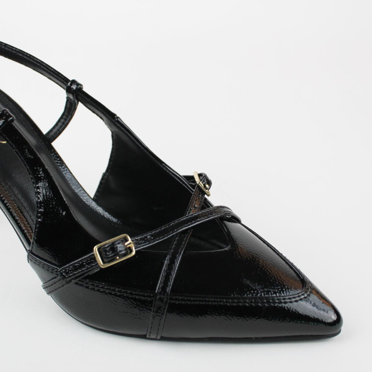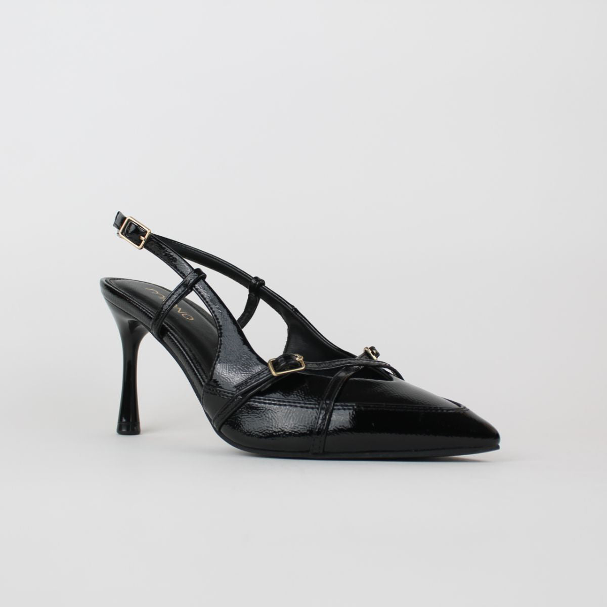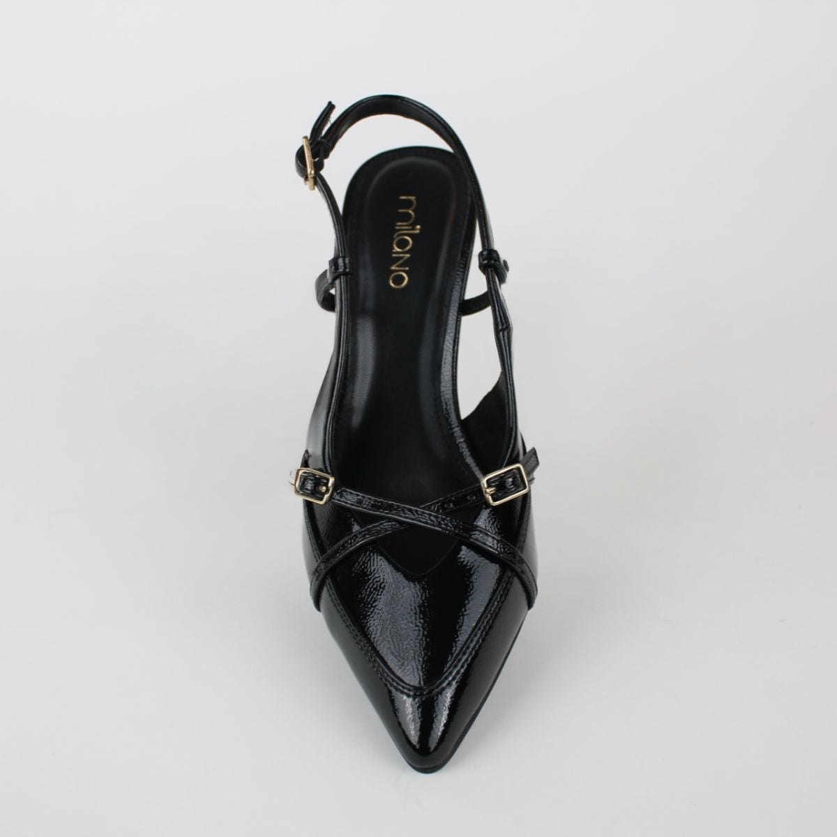 An elegant slingback heel in a rich patent finish. It features a pointed toe, a unique sculptural heel, and a straps detail, making it perfect for adding a sophisticated touch to any formal or evening outfit.