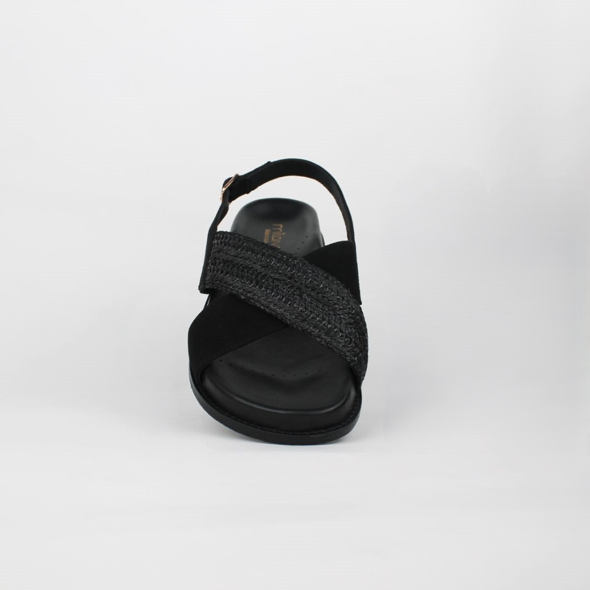 Modern criss-cross strap upper, combining smooth and textured suede panels.It has an adjustable slingback strap with a sleek metallic buckle for a secure fit. Durable black platform sole for enhanced comfort and support. This sandal is designed for all-day wearability.