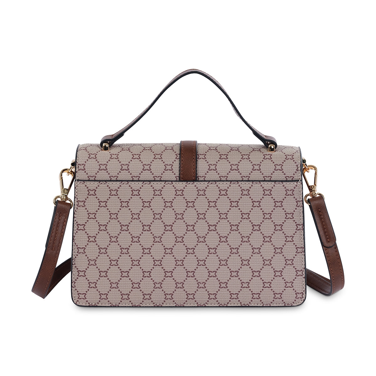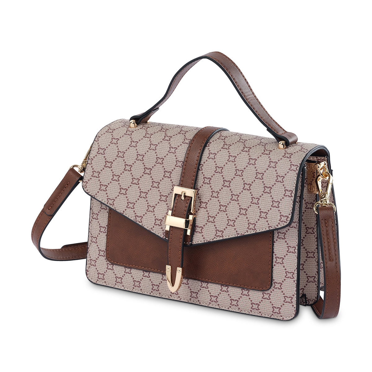 Classic and chic, the 'Milano' monogram satchel is an essential for any collection. Crafted from a durable material with a distinctive monogram print, this bag is complemented by a rich brown front panel and polished gold-tone hardware. The secure flap and structured design ensure both style and functionality.