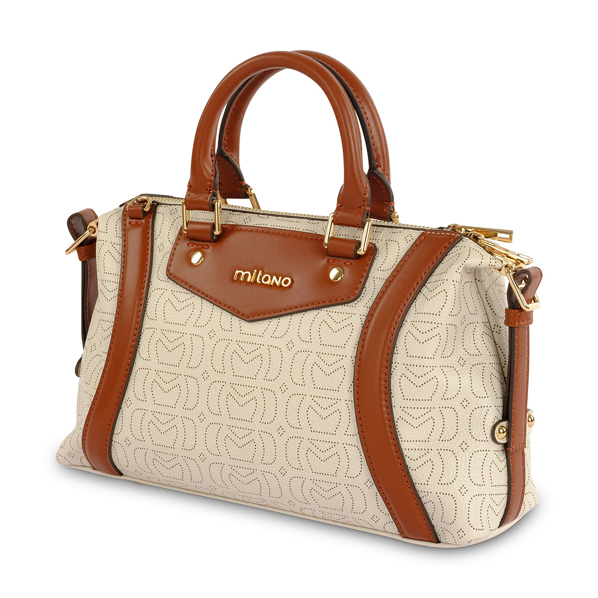 A premium ivory printed monogram barrel bag featuring contrast brown faux leather, detachable luggage tag and gold Milano branding. With phone pockets and an adjustable long strap for dual styling.