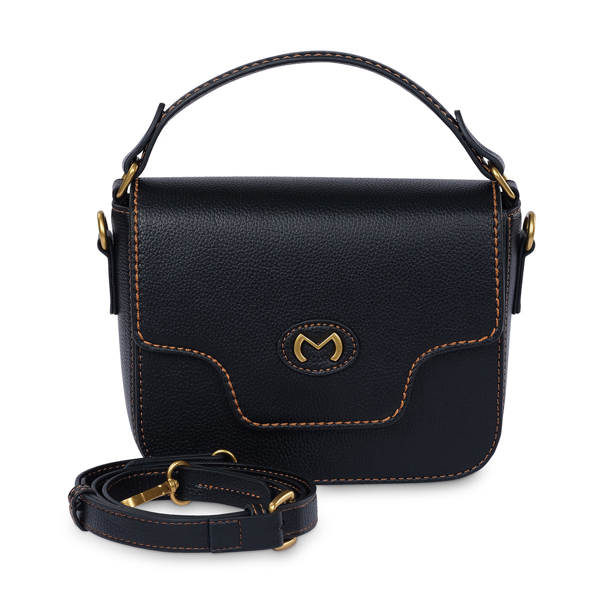 Black grainy faux leather crossbody with sophisticated contrast detail, branded with our signature M plate. Featuring a grab handle in additional detachable long strap
