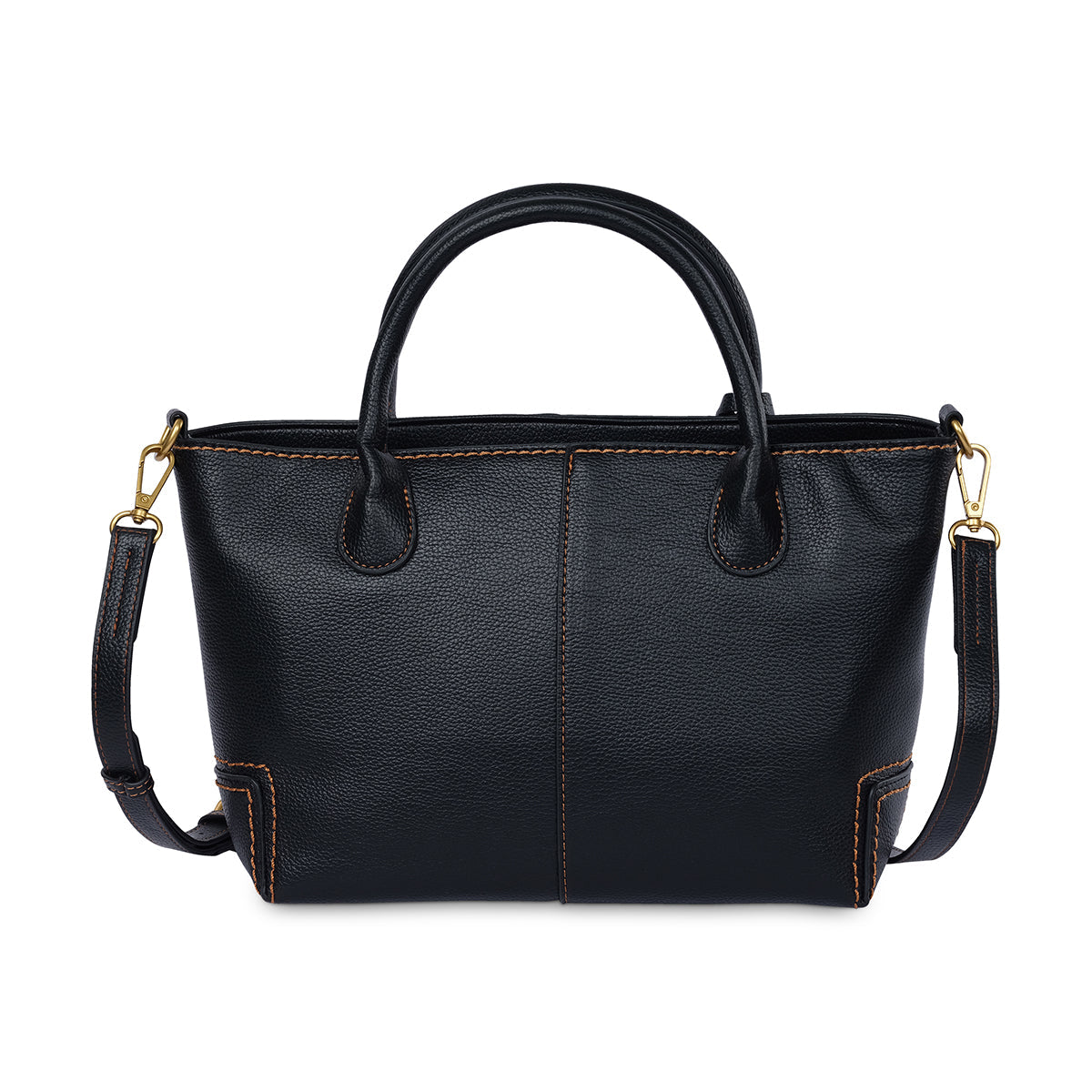 Black grainy faux leather premium tote with sophisticated contrast detail, branded with our signature M plate and detachable luggage tag. Featuring internal phone pockets and detachable, adjustable long strap