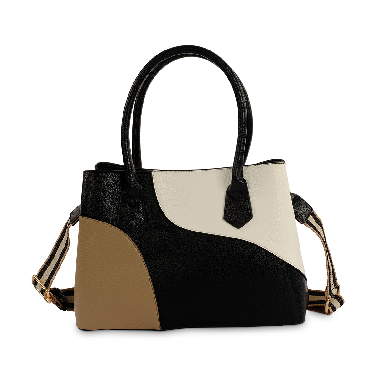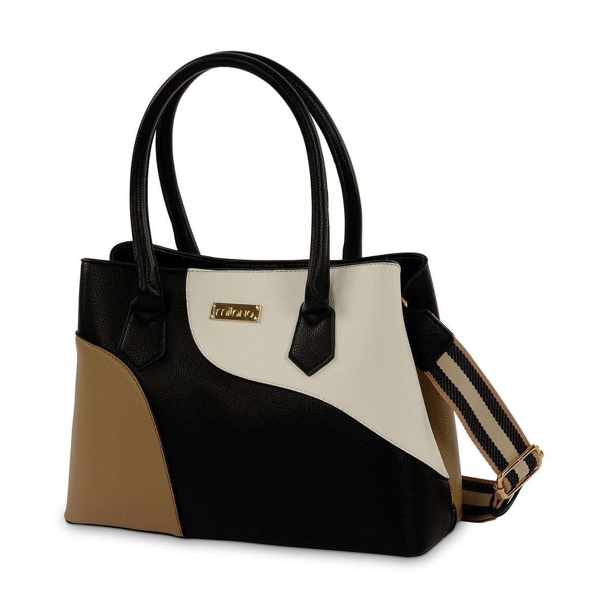 A premium colour blocked tote bag with twin handles, contrast stripe adjustable webbing strap and Milano branded hardware. Featuring a zip closure and internal phone pockets for added security.