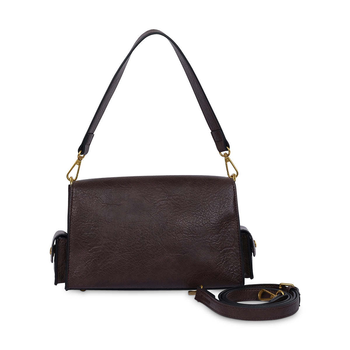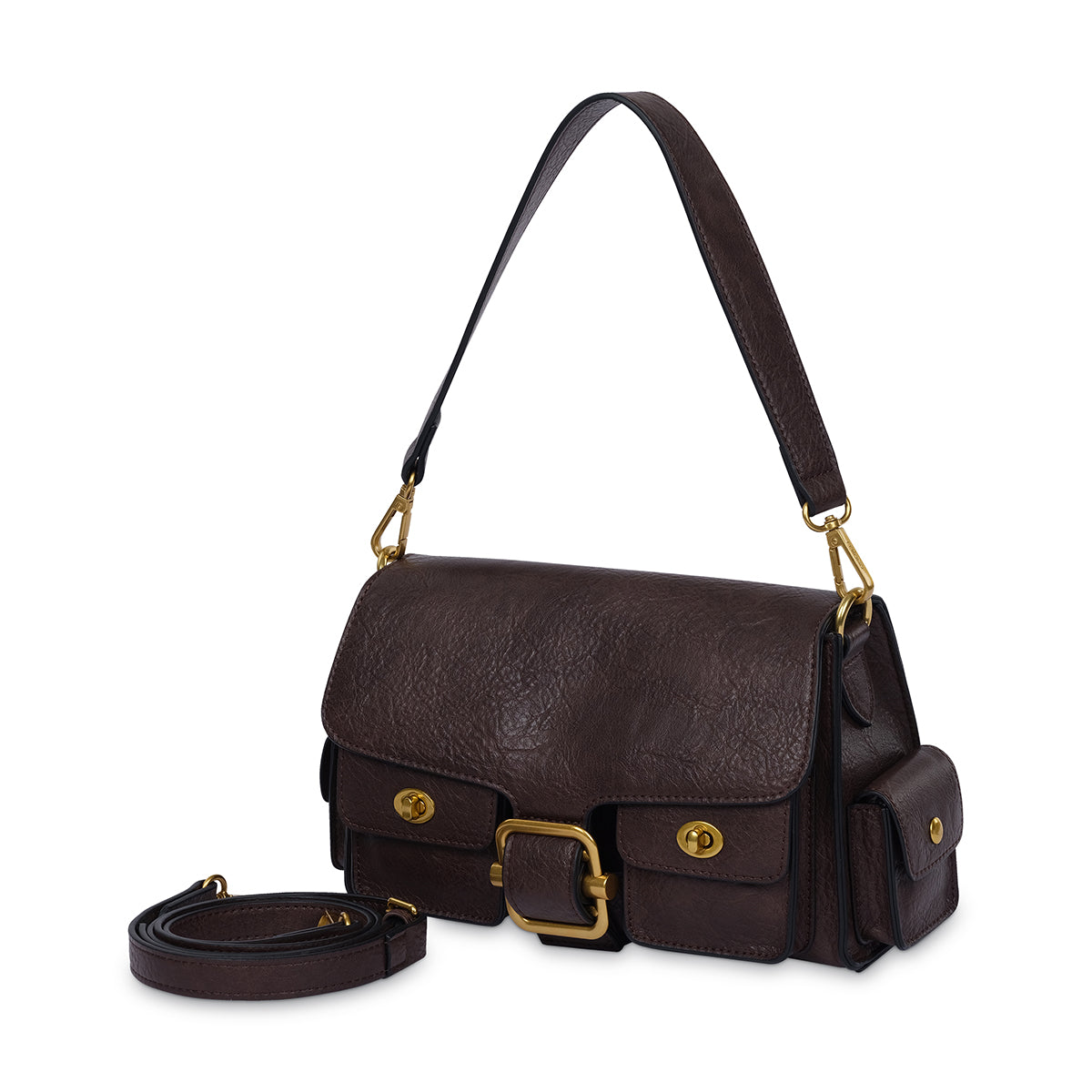 The rich dark brown 'Danielle' satchel is a timeless accessory that blends classic style with functional design. This bag showcases a structured silhouette with a sophisticated front flap, a prominent central buckle, and two stylish front pockets with turn-lock closures. It’s a chic and versatile piece that’s perfect for both daily use and special occasions.