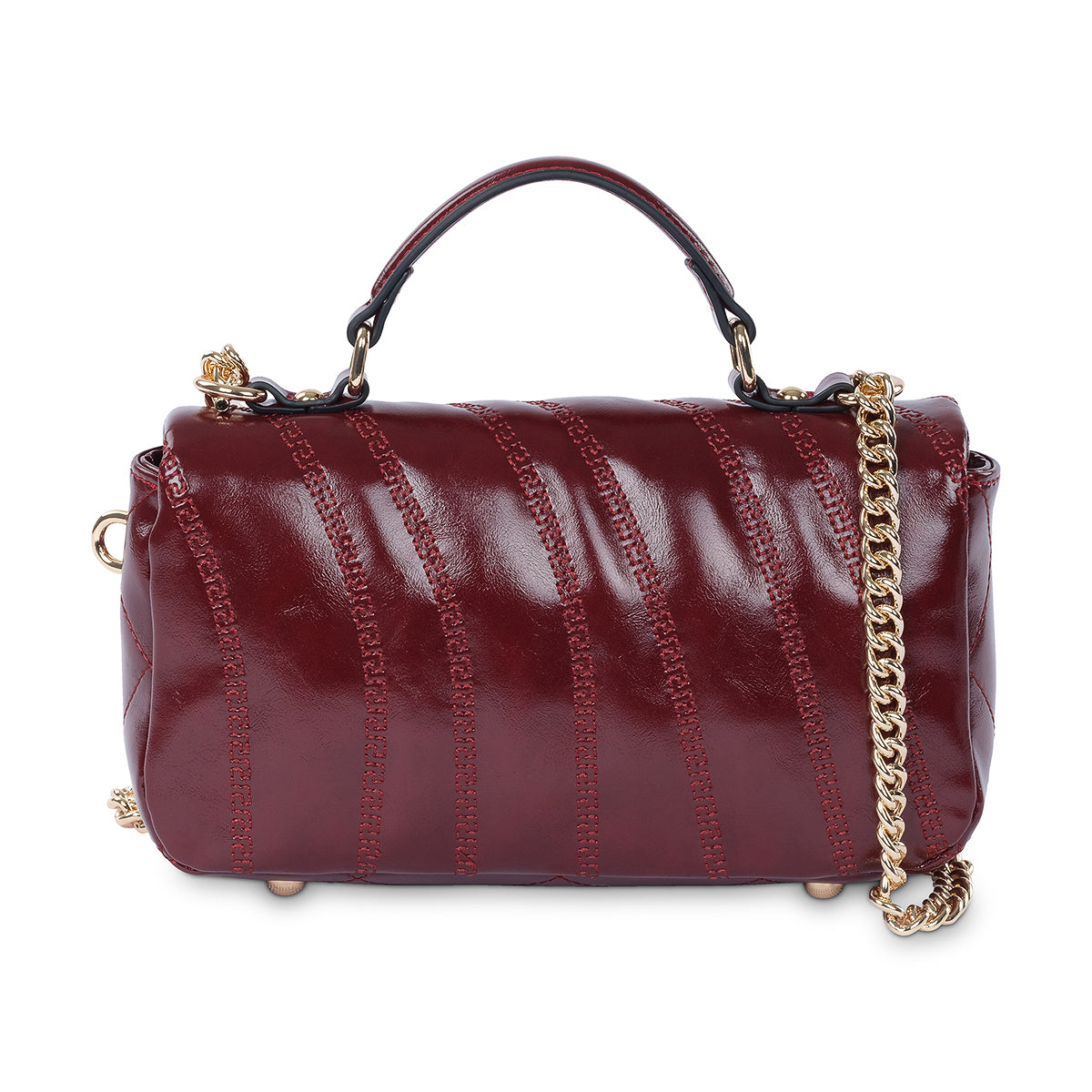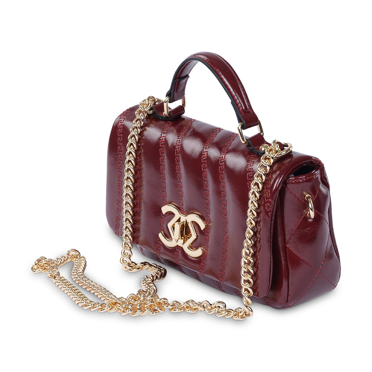 Make a bold statement with the 'Taylor' quilted handbag. This striking piece features a rich burgundy-red hue, a classic quilted texture, and a high-shine finish. The elegant gold-tone chain strap and prominent front logo clasp add a luxurious touch, making it perfect for an evening out or adding a pop of color to your daytime look.