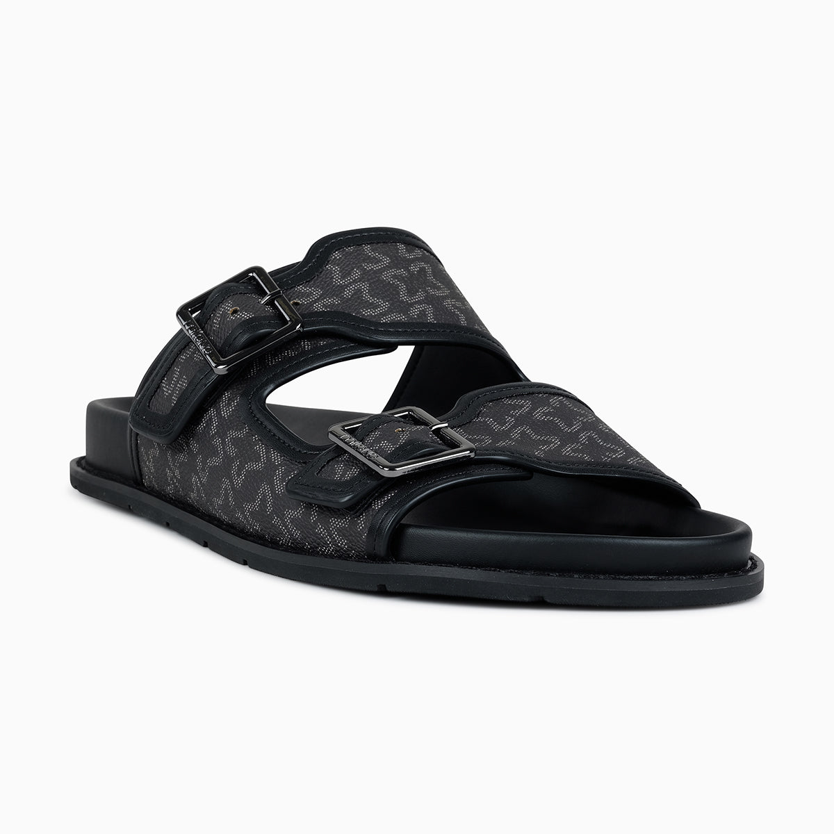 The Rebelo slide sandal can add a touch of contemporary feel to your entire collection. The style has been fashioned with our signature monogram material which gives a very luxurious feel and look. Designed to elevate your styling options, it also adds on a comfort and versatility element as it features a dual strap design with adjustable metallic buckles, ensuring a secured and personalized fit. The sandal is crafted with a soft cushioned footbed for all-day comfort and a durable, slip-resistant sole for stability and long-lasting wear. Perfect for relaxed weekends, travel, or upscale casual outings, this sandal combines functionality with refined aesthetics. This style can be easily worn to match with joggers and a lightweight jacket for comfort on the go as well as it can be paired with slim-fit jeans and a crisp tee for a sleek city look.
