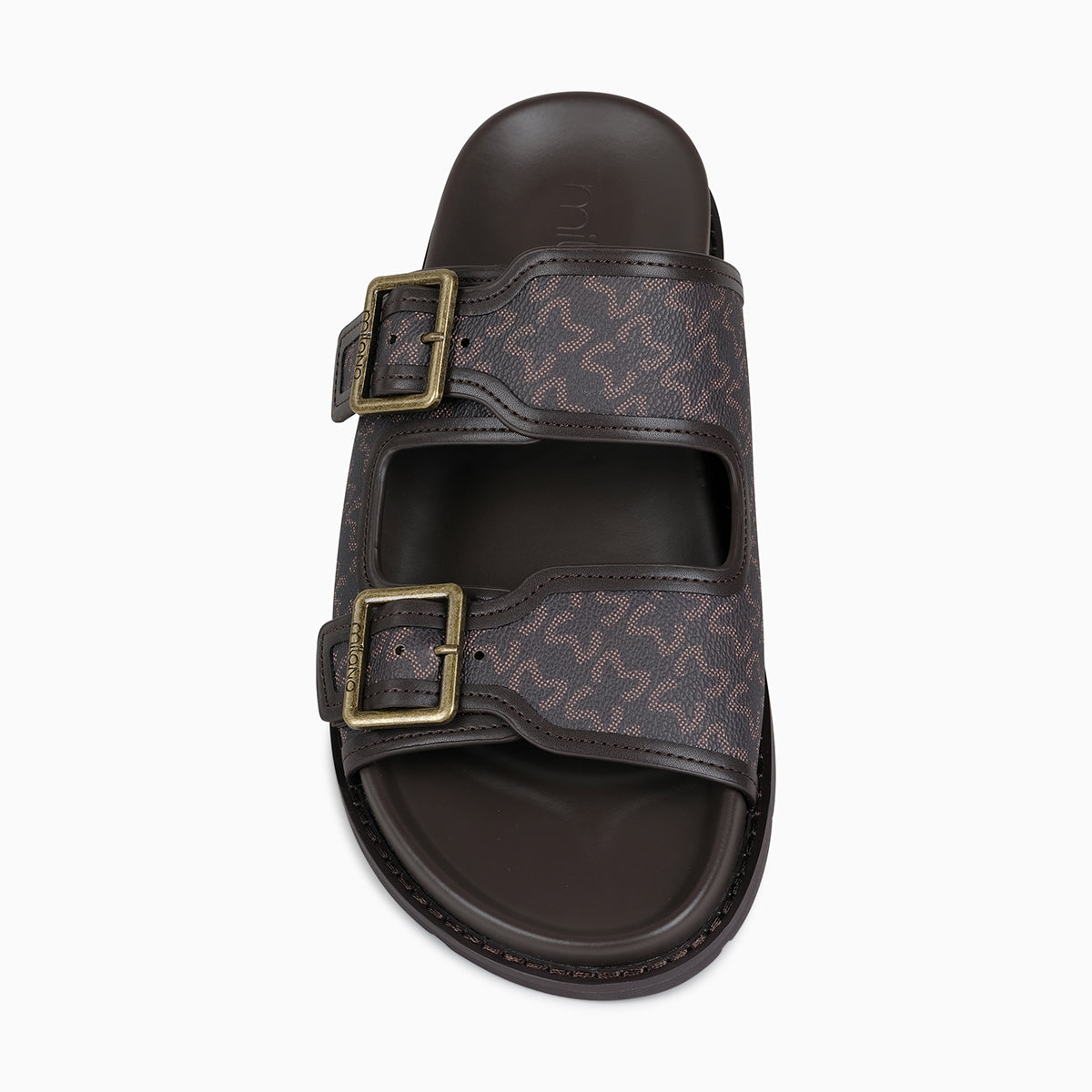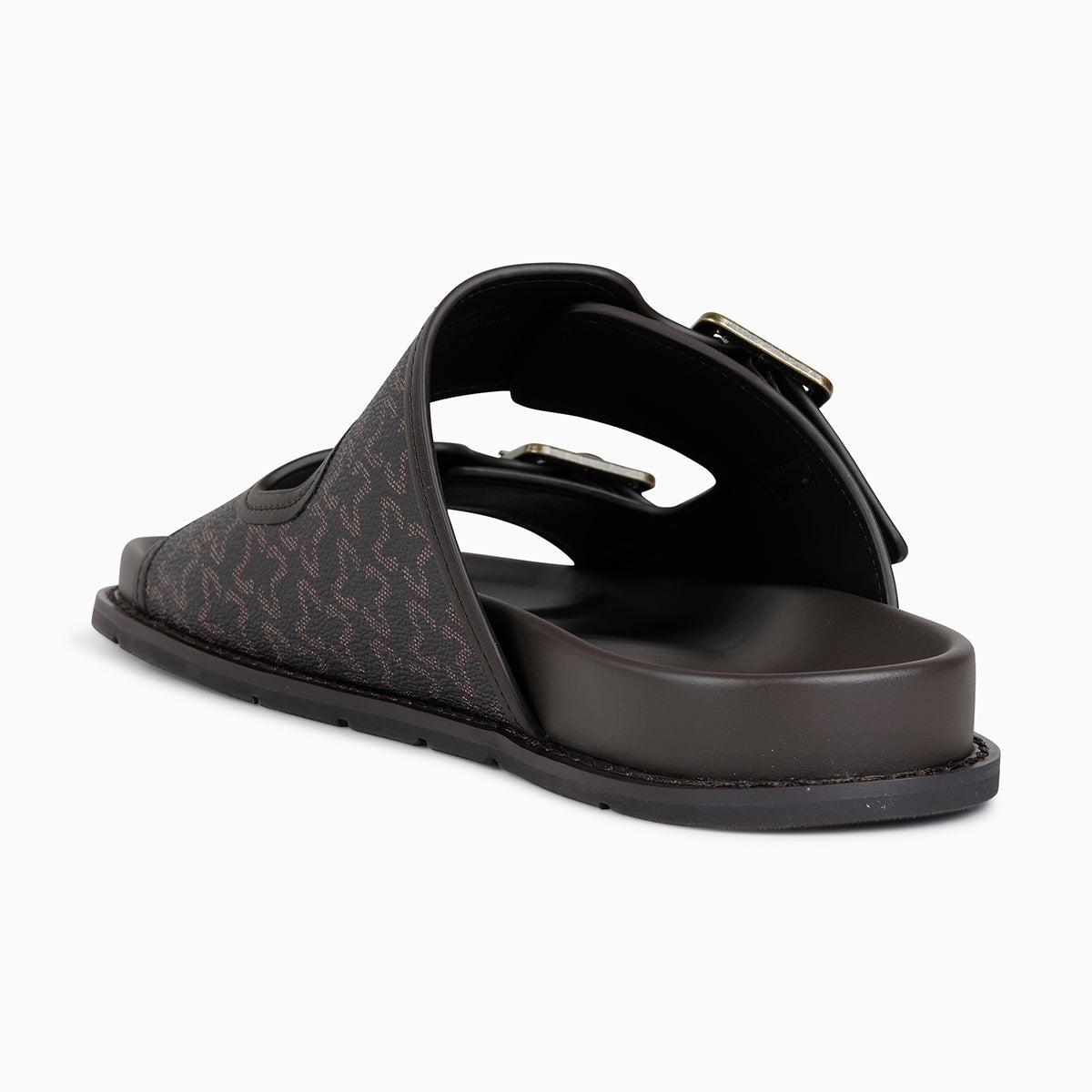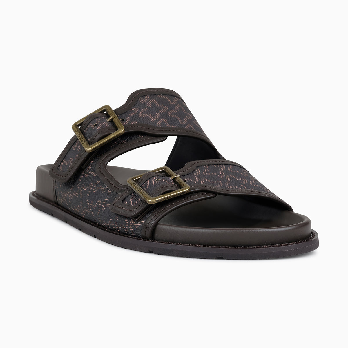 The Rebelo slide sandal can add a touch of contemporary feel to your entire collection. The style has been fashioned with our signature monogram material which gives a very luxurious feel and look. Designed to elevate your styling options, it also adds on a comfort and versatility element as it features a dual strap design with adjustable metallic buckles, ensuring a secured and personalized fit. The sandal is crafted with a soft cushioned footbed for all-day comfort and a durable, slip-resistant sole for stability and long-lasting wear. Perfect for relaxed weekends, travel, or upscale casual outings, this sandal combines functionality with refined aesthetics. This style can be easily worn to match with joggers and a lightweight jacket for comfort on the go as well as it can be paired with slim-fit jeans and a crisp tee for a sleek city look.