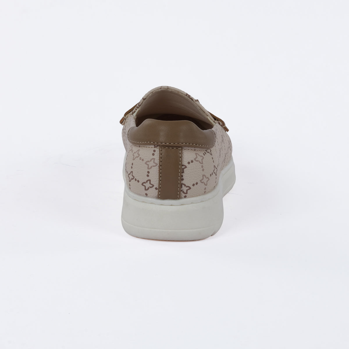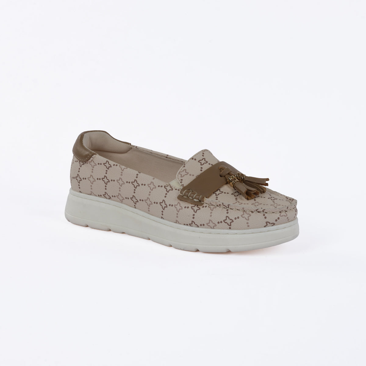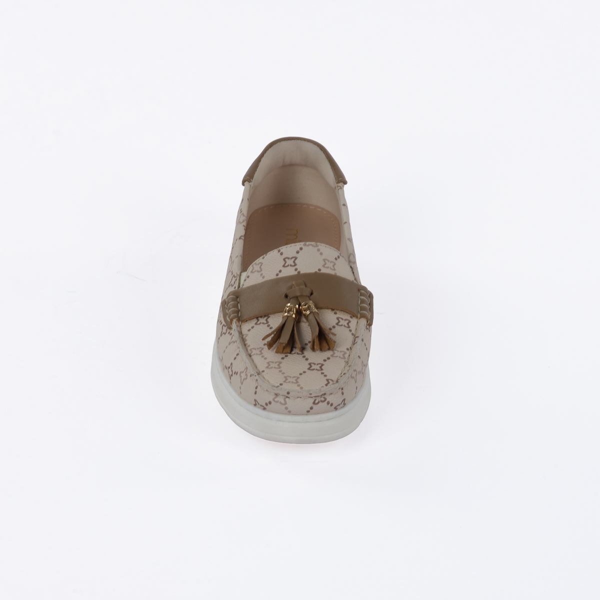 Step up your style with these fashionable sporty loafers. Featuring a sophisticated light-colored monogram print, these shoes add a touch of luxury to your everyday look. The classic loafer design is elevated by a modern platform/sporty sole, providing a stylish lift while ensuring all-day comfort. A chic tassel with gold-toned hardware and a coordinating strap across the vamp complete the look, adding a polished and playful detail.