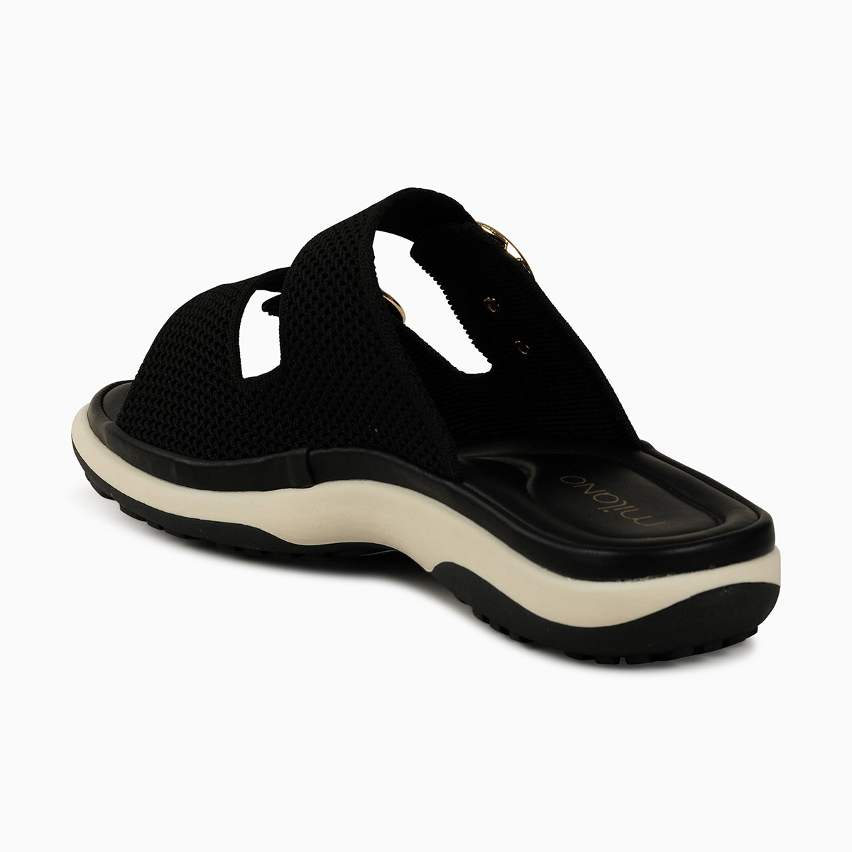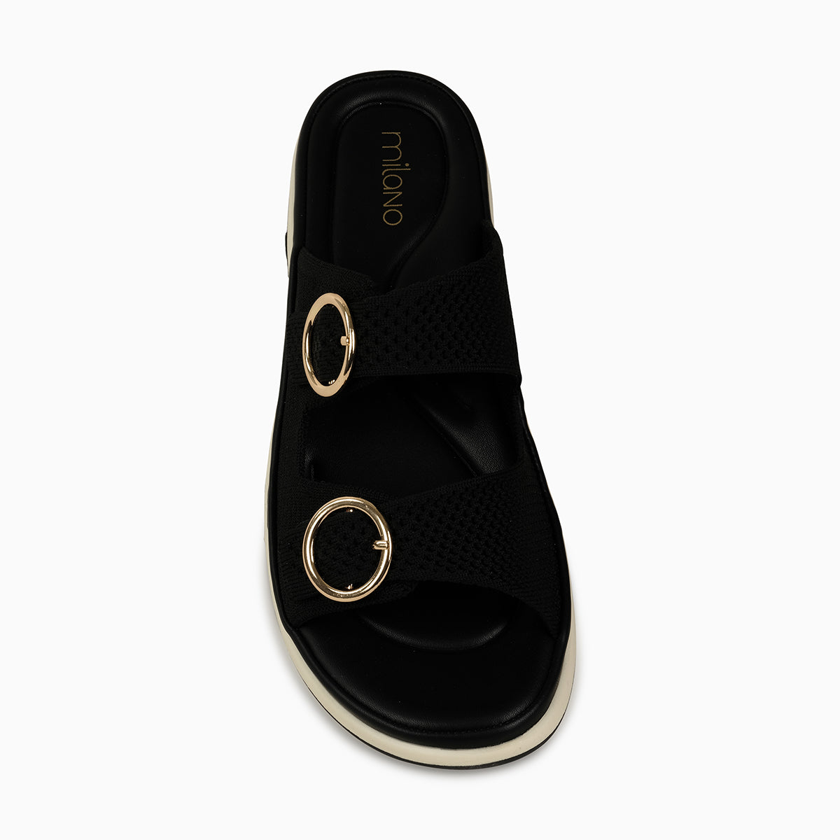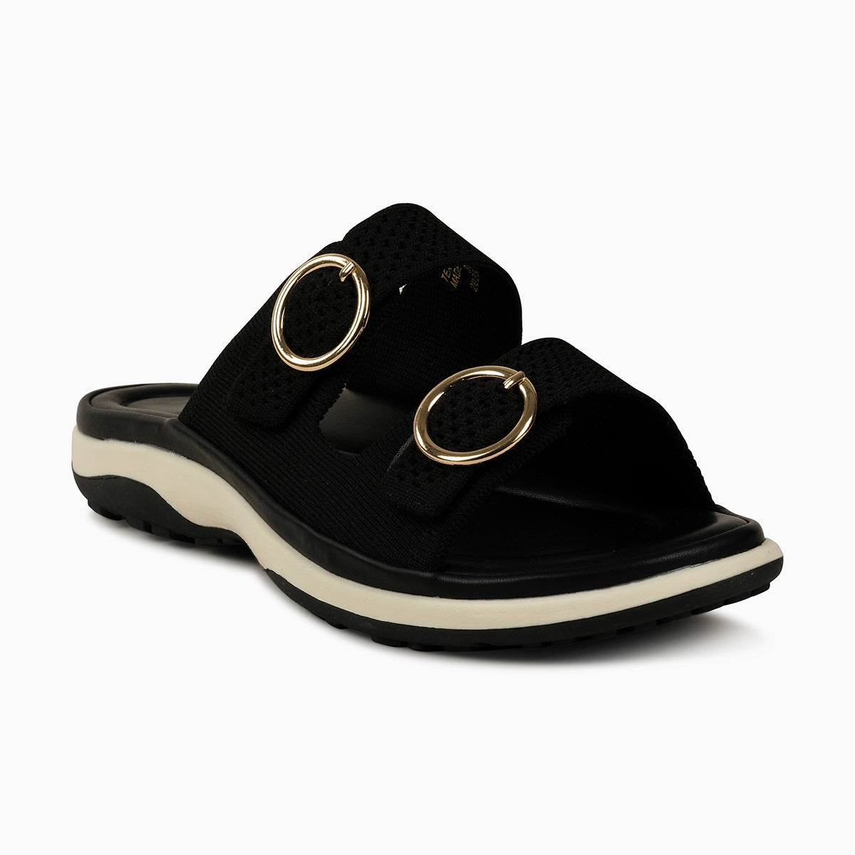 A casual everyday slide featuring two textured straps accented with bold circular buckles. Designed with a cushioned footbed and lightweight sole for all day comfort, perfect for relaxed, on the go style.