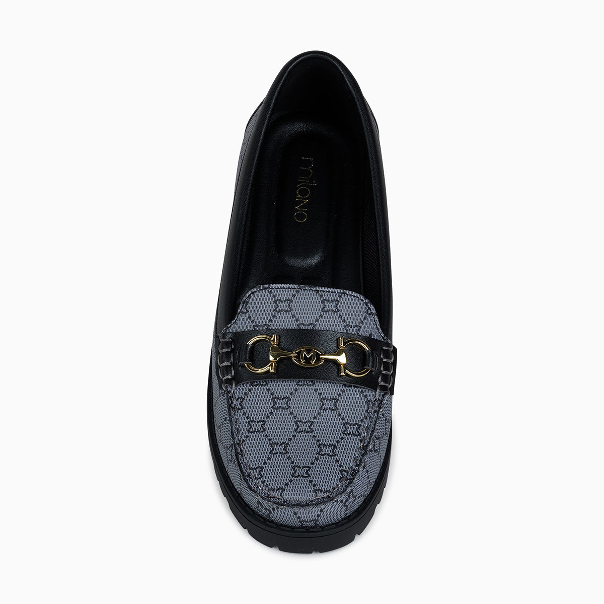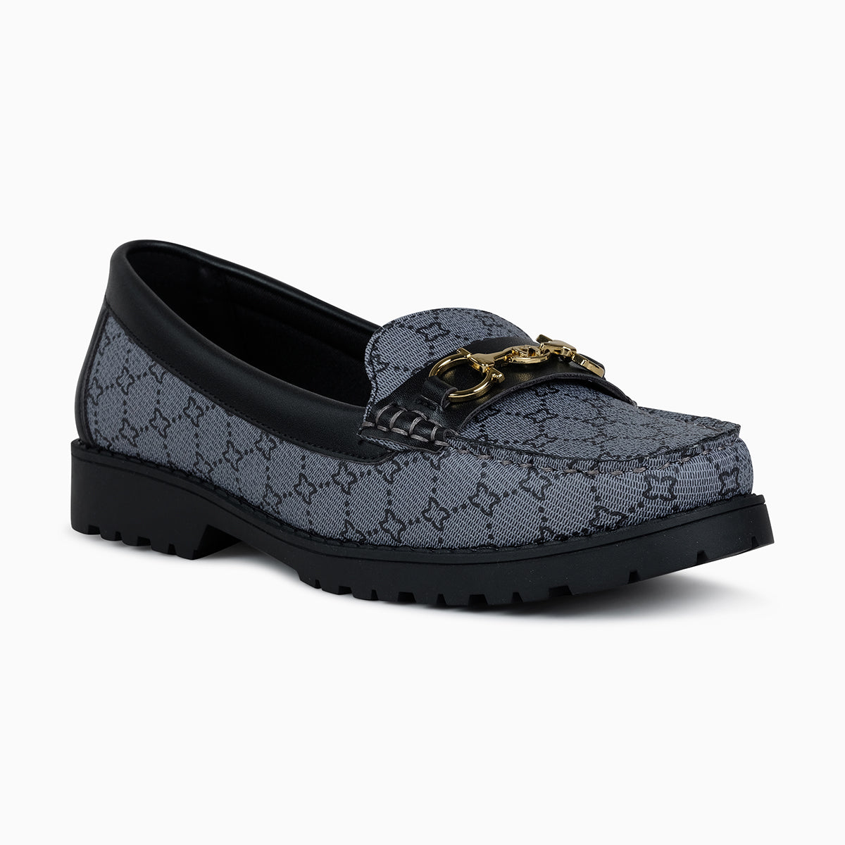 Stylish loafers featuring an all-over monogram pattern, gold-tone bit detail, and colorful accents on the vamp. Designed with a cushioned insole and chunky white sole for comfort and a modern look.