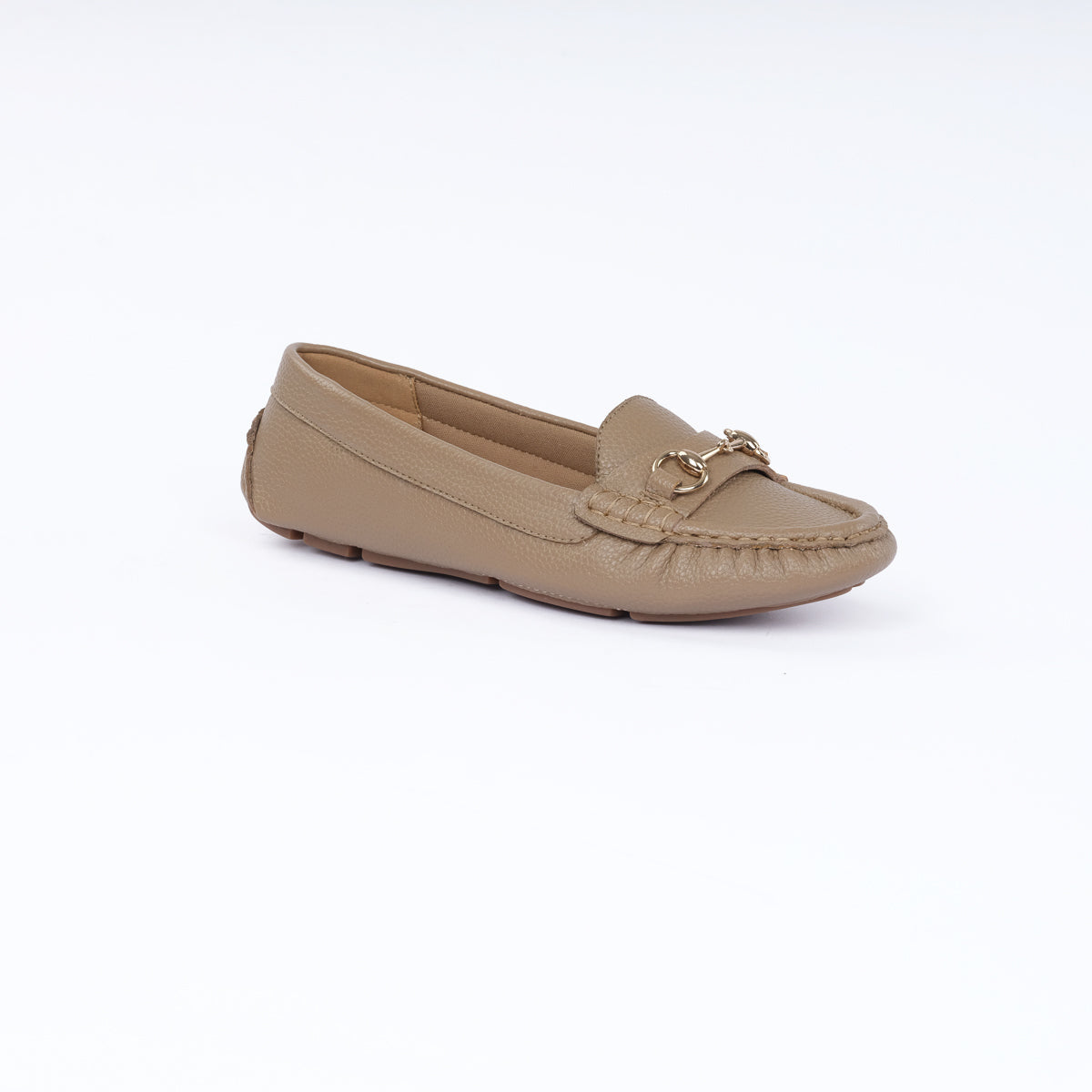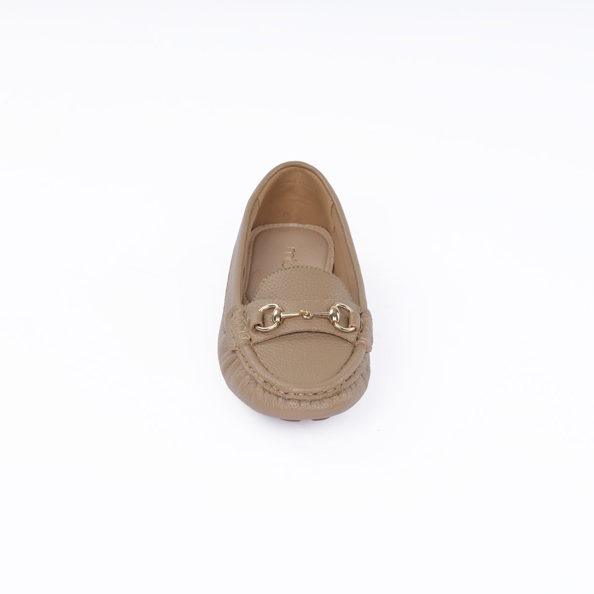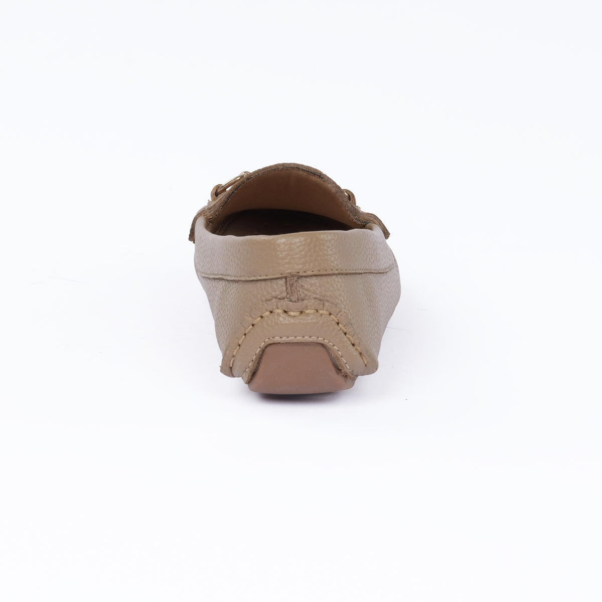 Classic elegance meets comfort,beige moccasins with a sleek finish and metallic detail for a timeless, versatile look.