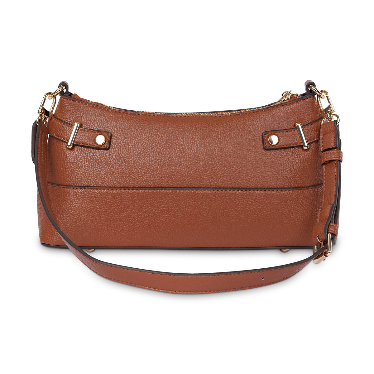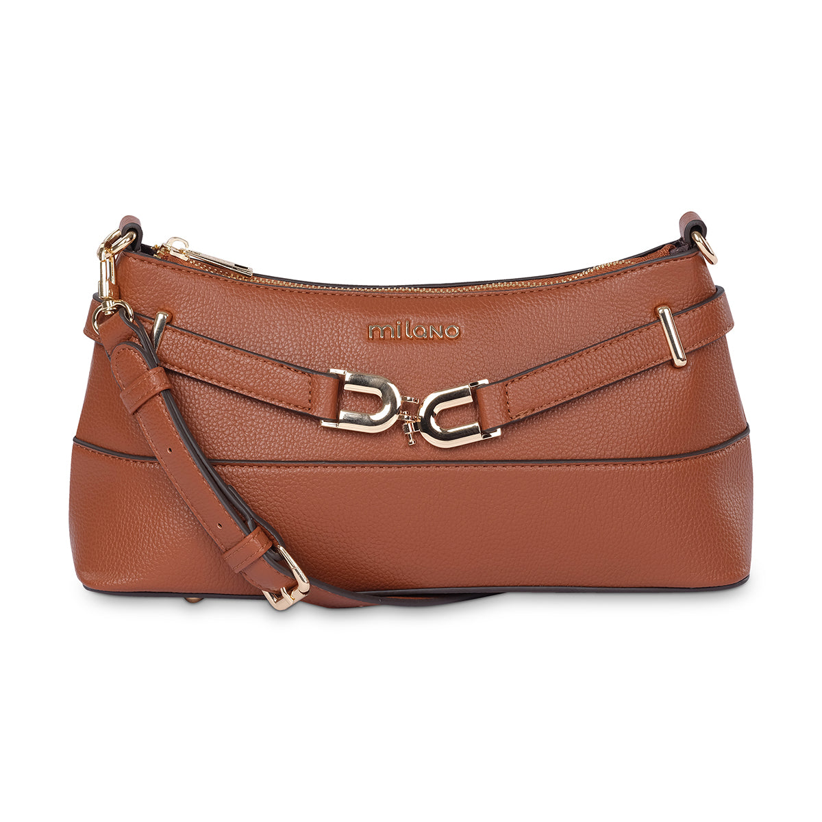 A stylish tan shoulder bag tote with premium buckle detail, Milano logo plate and detachable, adjustable strap. With internal pockets for maximum organisation