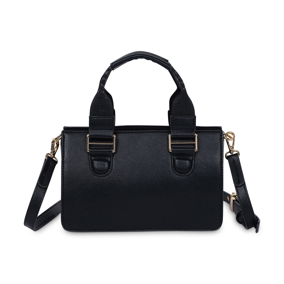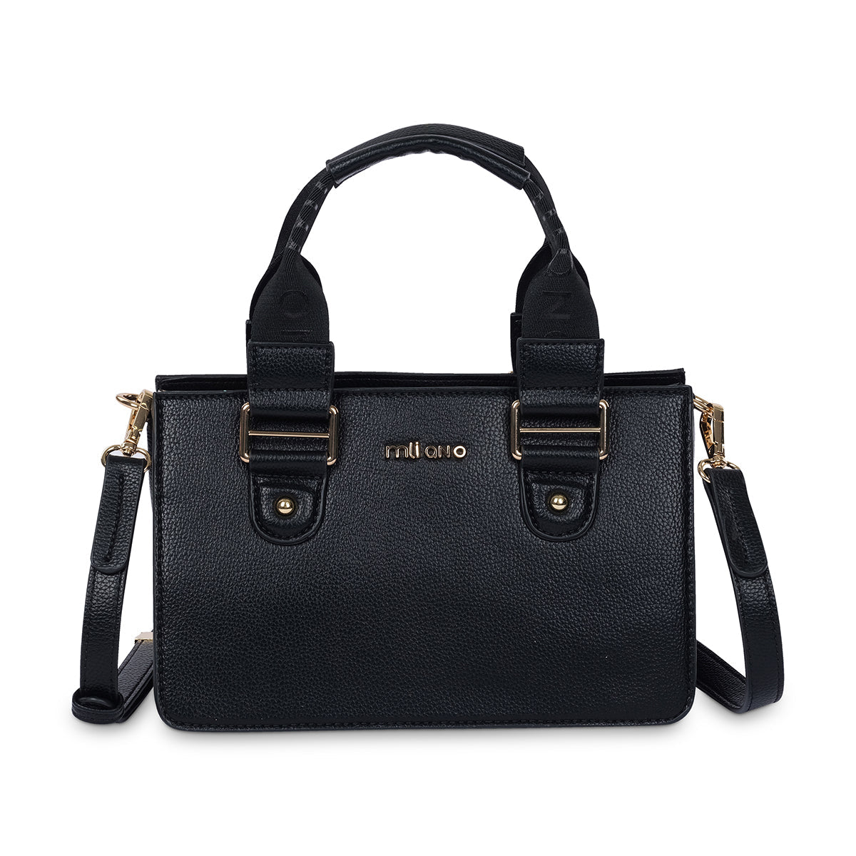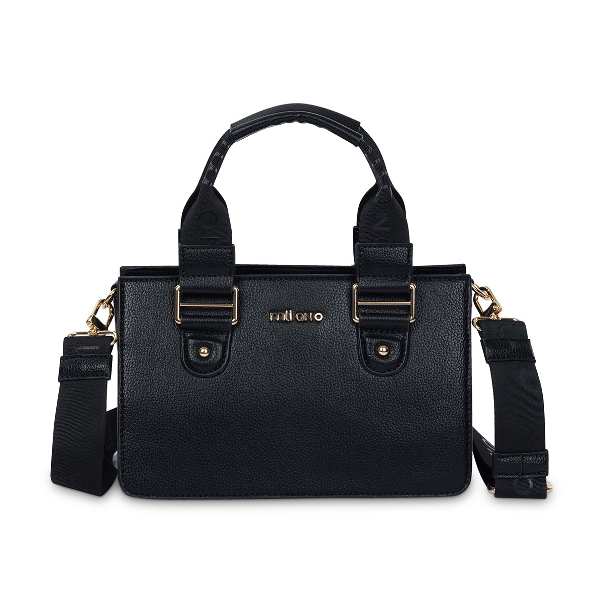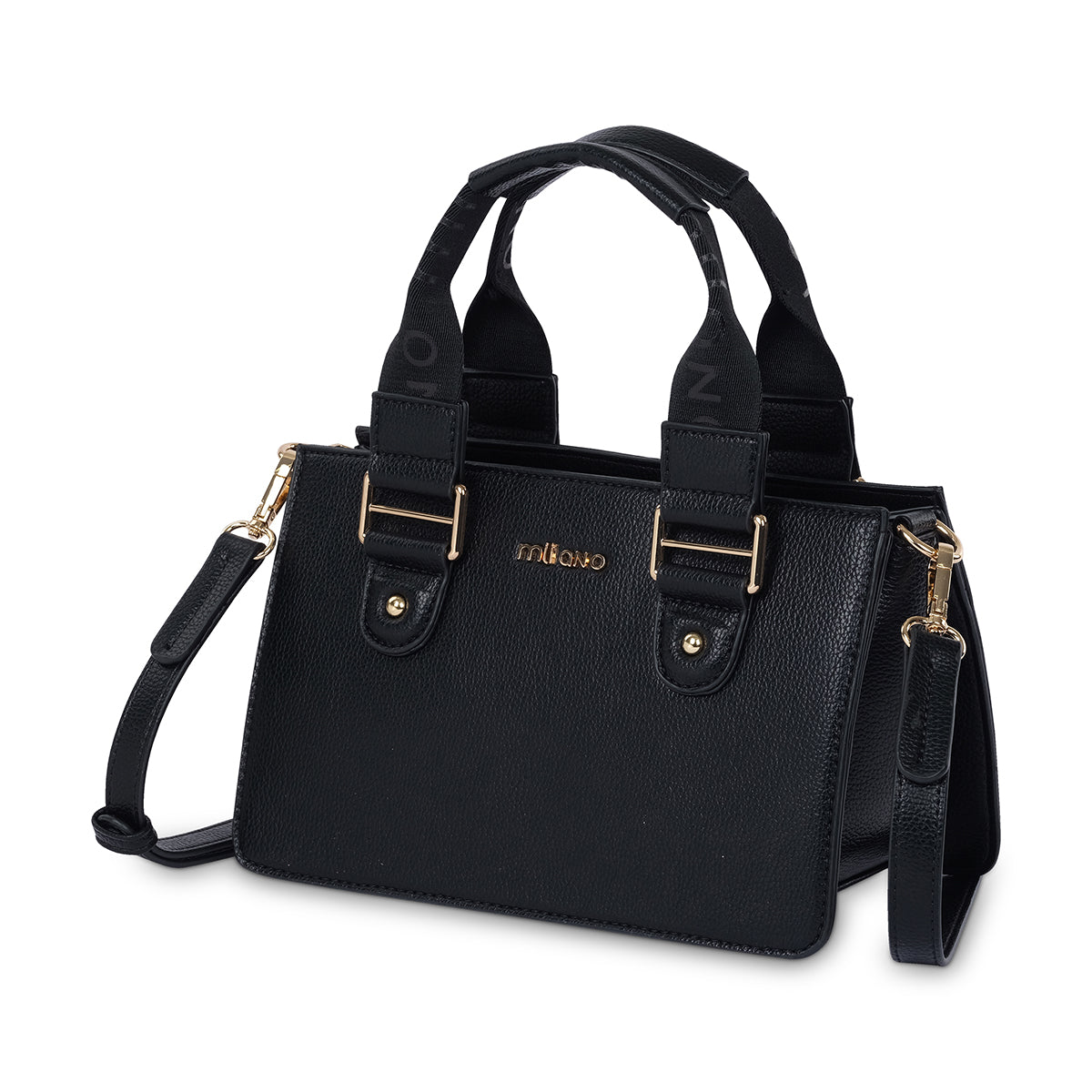 Black mini crossbody bag with twin webbing handles and Milano logo branding. Featuring a zip closure for added security and a detachable, adjustable long strap