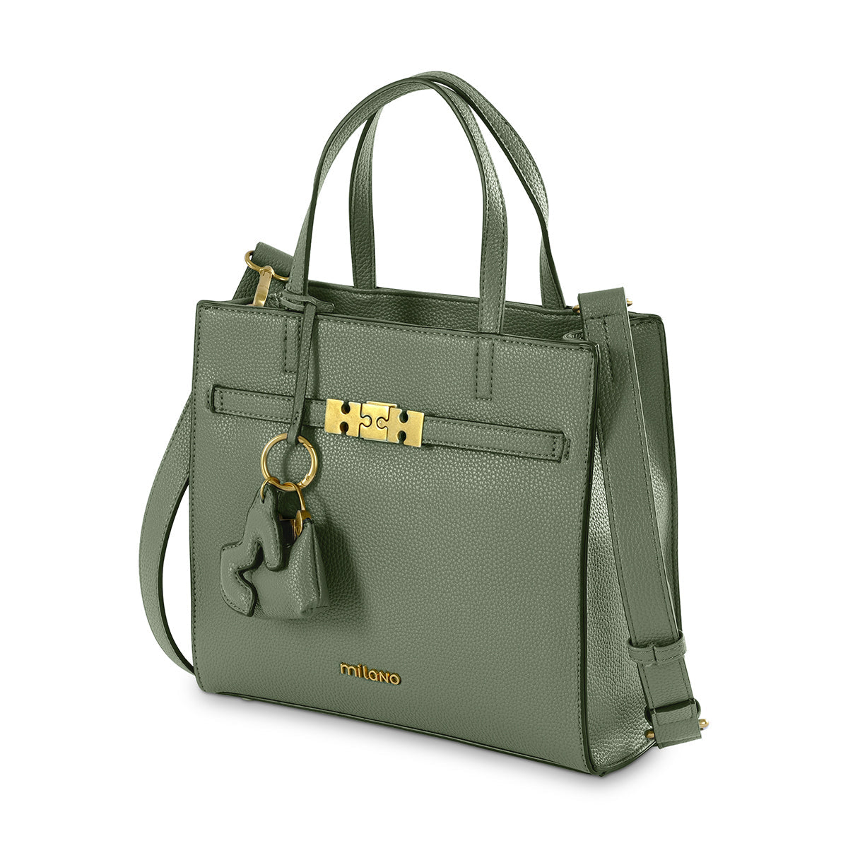 The 'Kennedy' tote in a rich khaki hue is a versatile statement piece. Designed with a structured body and twin top handles, this bag features a secure front clasp and a signature charm that adds a stylish detail. It's the perfect blend of modern elegance and functional design.