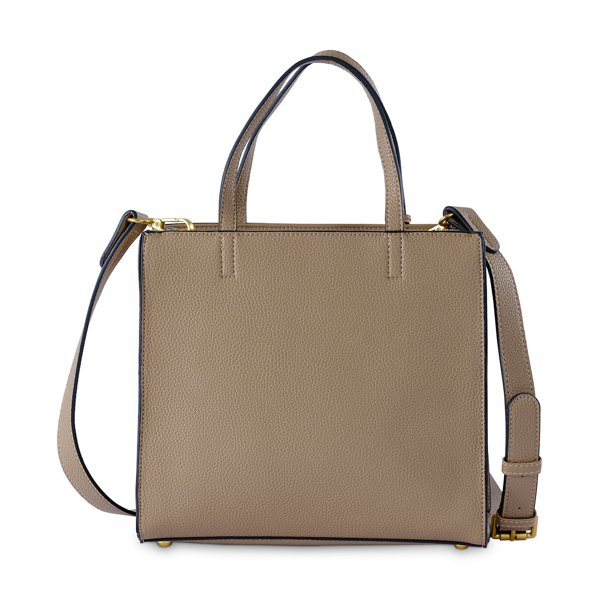 The 'Kennedy' tote in taupe is a sophisticated and playful accessory. Its structured silhouette and smooth finish give it a polished look, while the unique gold-toned lock and charming bunny-shaped key holder add a whimsical touch. This bag is a chic and spacious choice for your everyday needs.