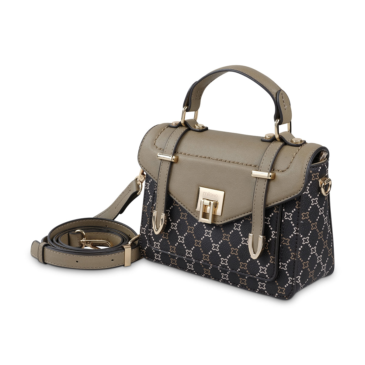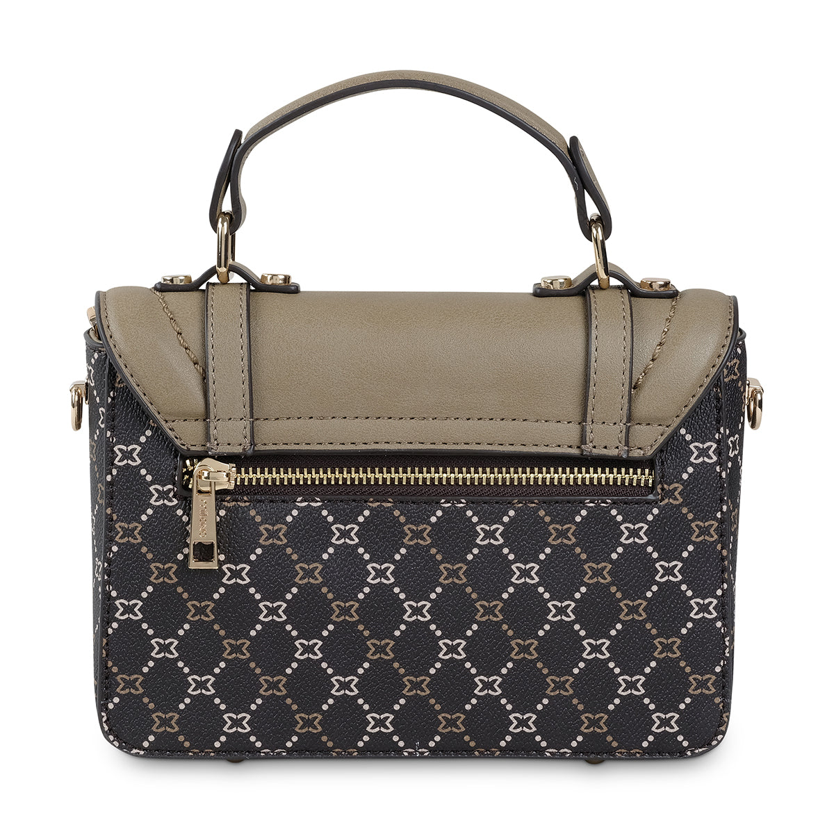 This elegant handbag features a sophisticated monogram pattern with beige and dark brown accents. Designed with a structured silhouette and a convenient top handle, it combines style and practicality. Matching accessories are available to create a coordinated look.