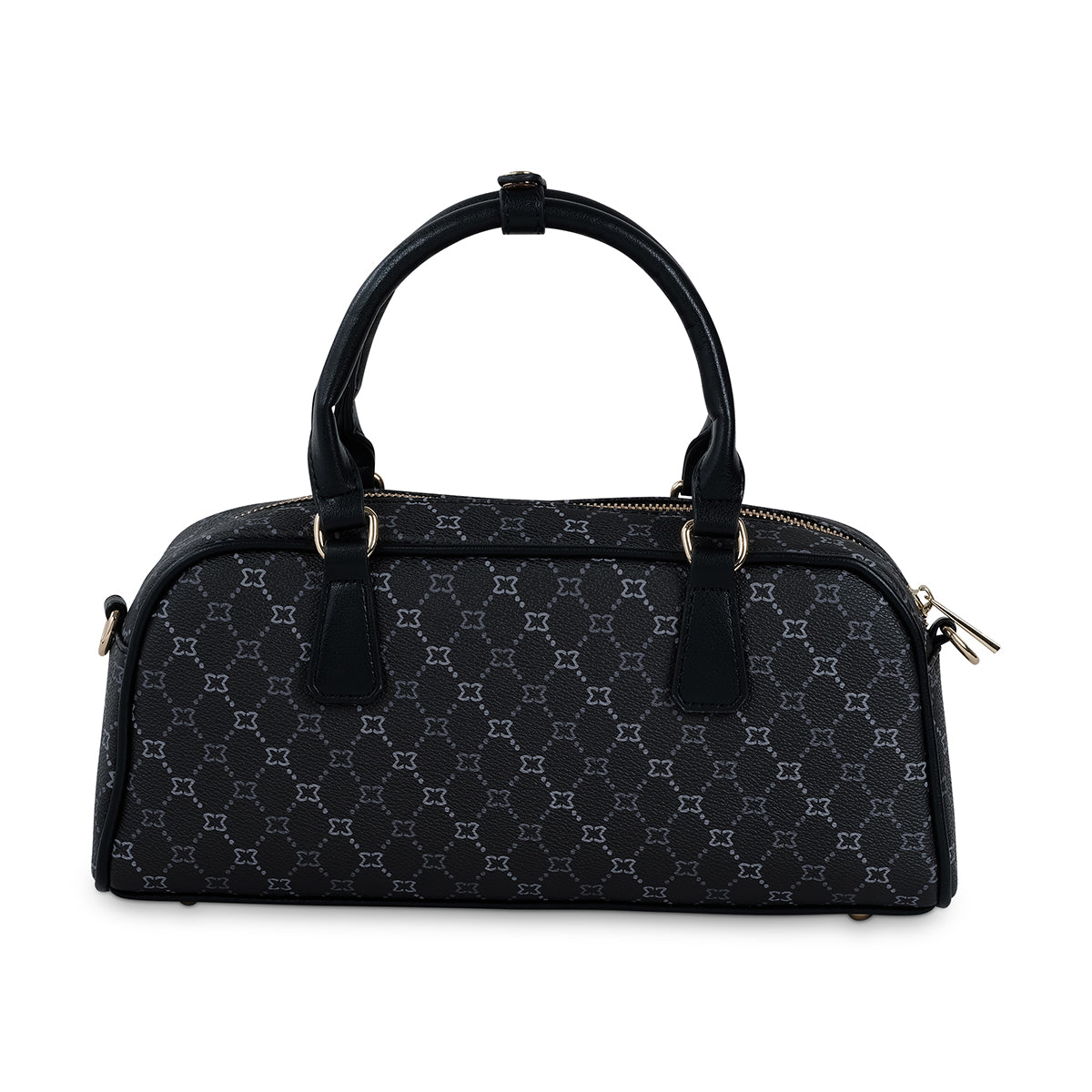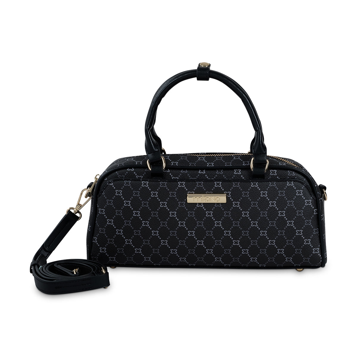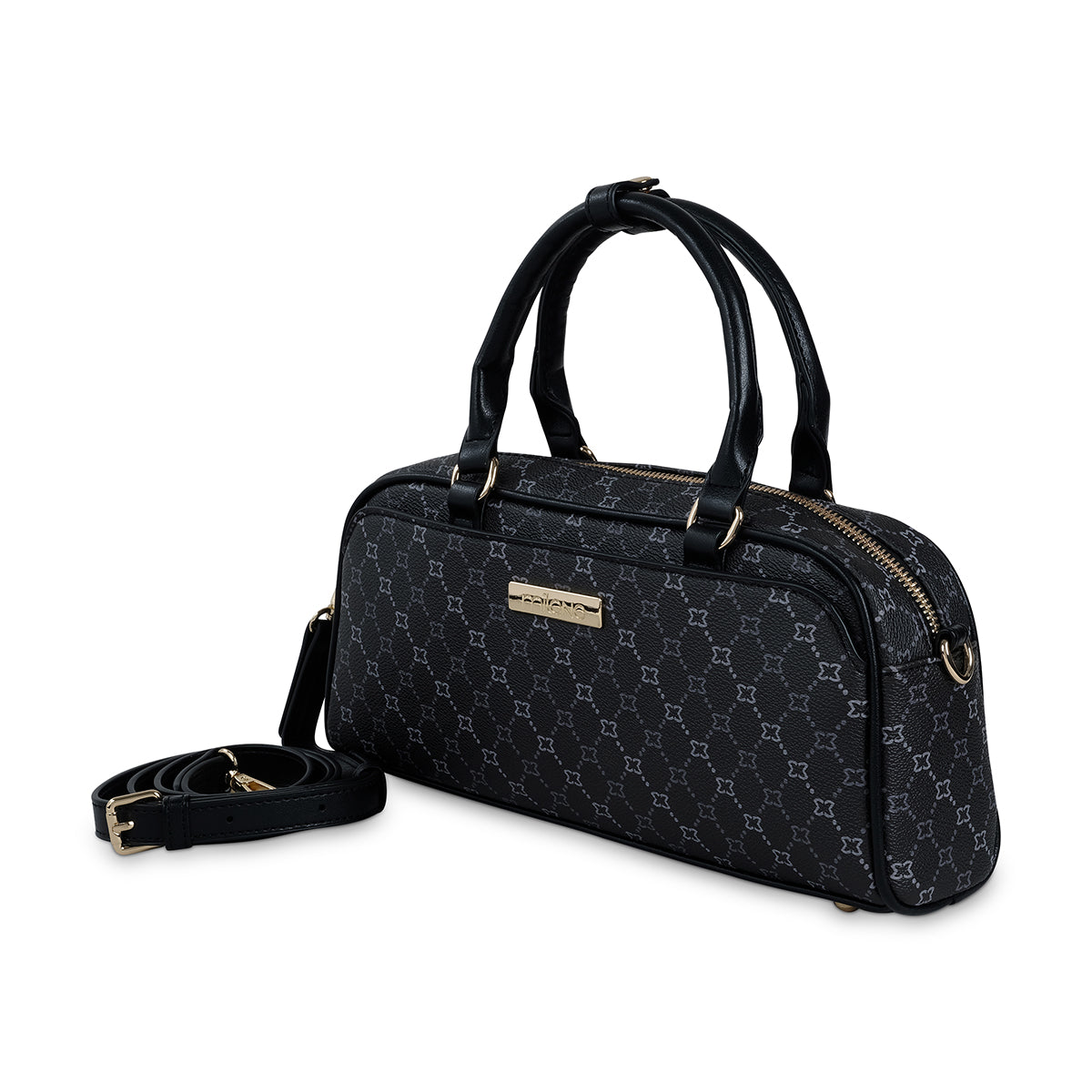 Beige monogram top handle satchel bag, contrast tan front strap closure with striking contrast stitch and hardware, long detachable shoulder strap and internal pockets
