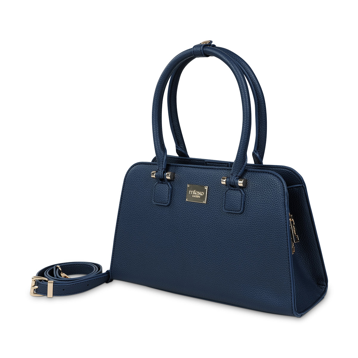 This classic navy handbag boasts a sleek and sophisticated design with a smooth finish and sturdy top handles. Its spacious interior makes it ideal for carrying your essentials in style. Featuring an adjustable long strap for dual purpose.