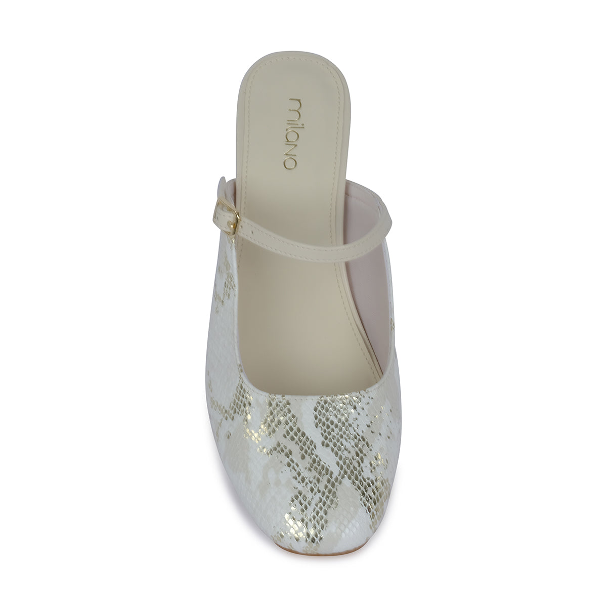 Elegant heeled mule in a soft cream tone, featuring a shimmering textured upper, adjustable strap, and sturdy block heel. Perfect for dressy occasions and effortless chic styling.