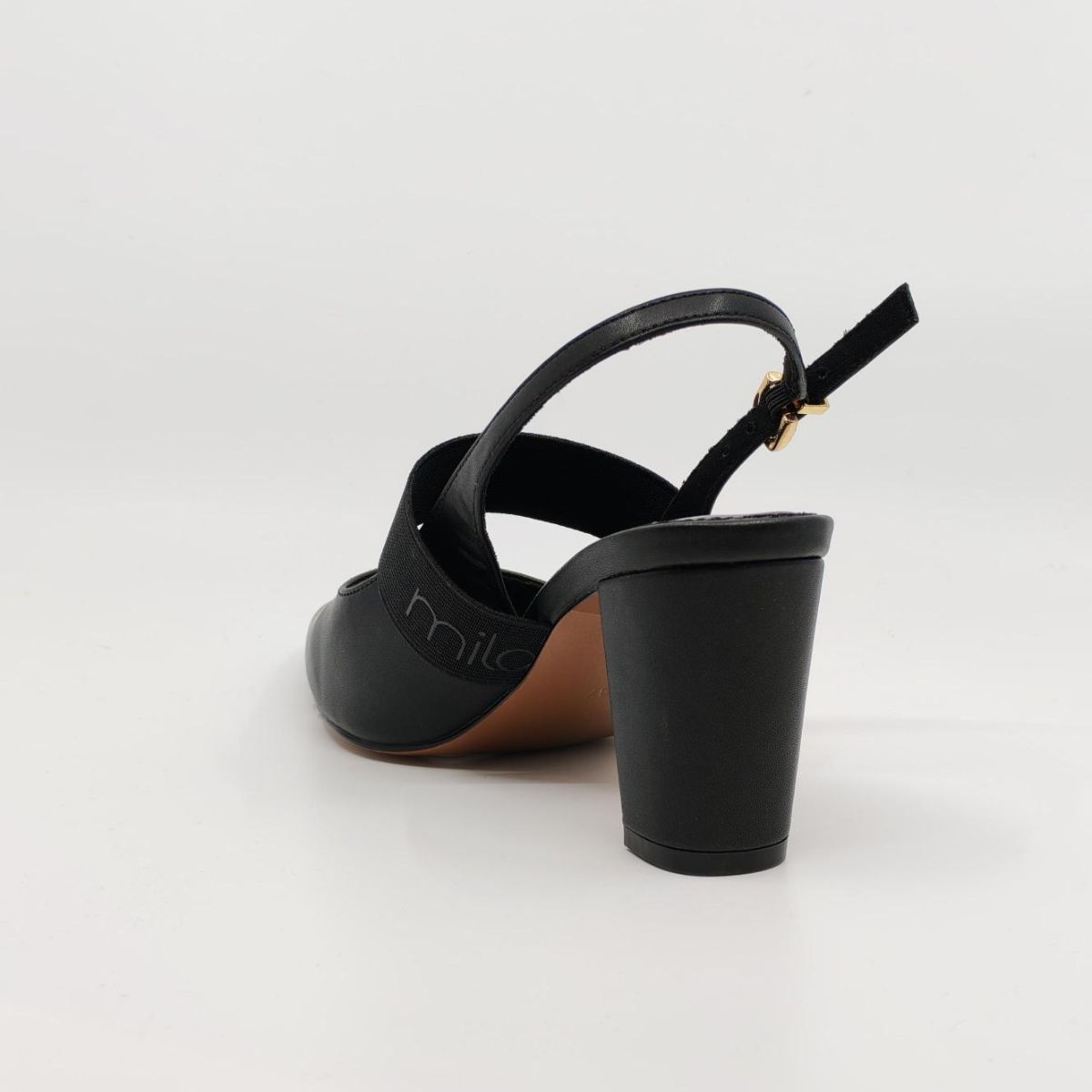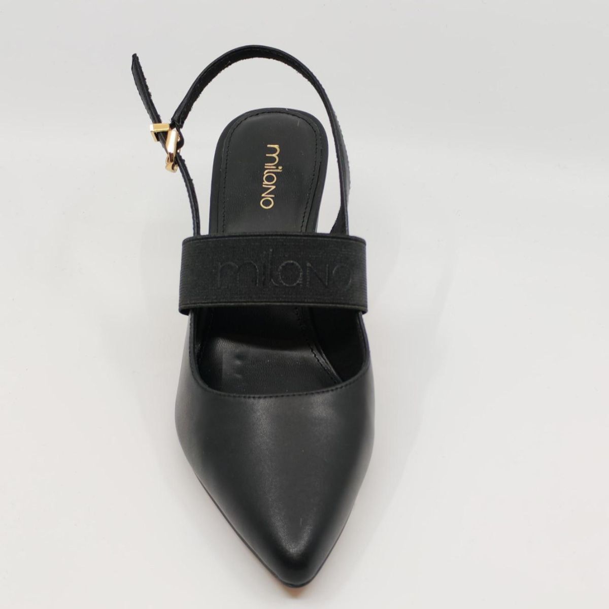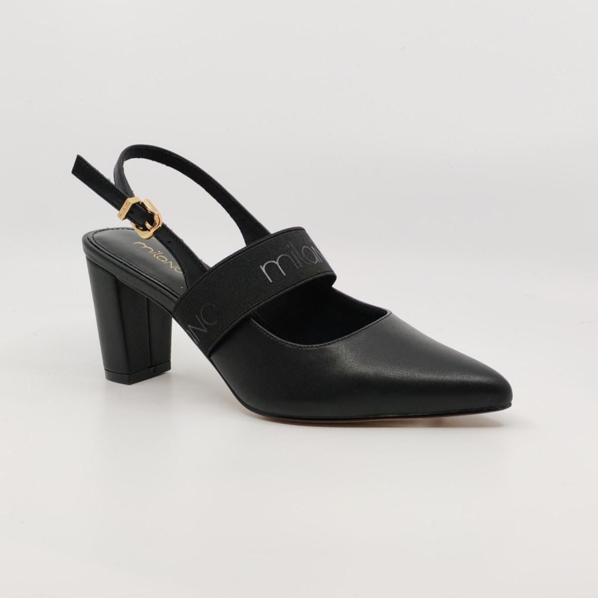 Sophisticated black slingback pumps crafted in smooth faux leather, featuring a sleek pointed toe and a sturdy mid-block heel for effortless elegance. Enhanced with a wide elastic strap for a secure fit and a polished gold-tone buckle for a refined finish—perfect for day-to-night styling.