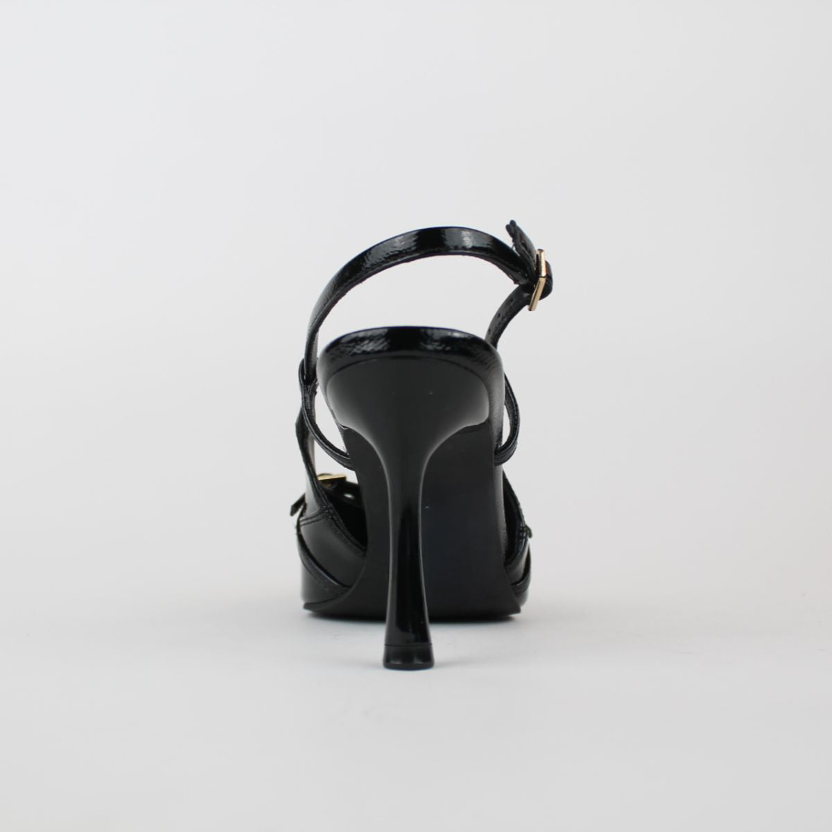 An elegant slingback heel in a rich patent finish. It features a pointed toe, a unique sculptural heel, and a straps detail, making it perfect for adding a sophisticated touch to any formal or evening outfit.