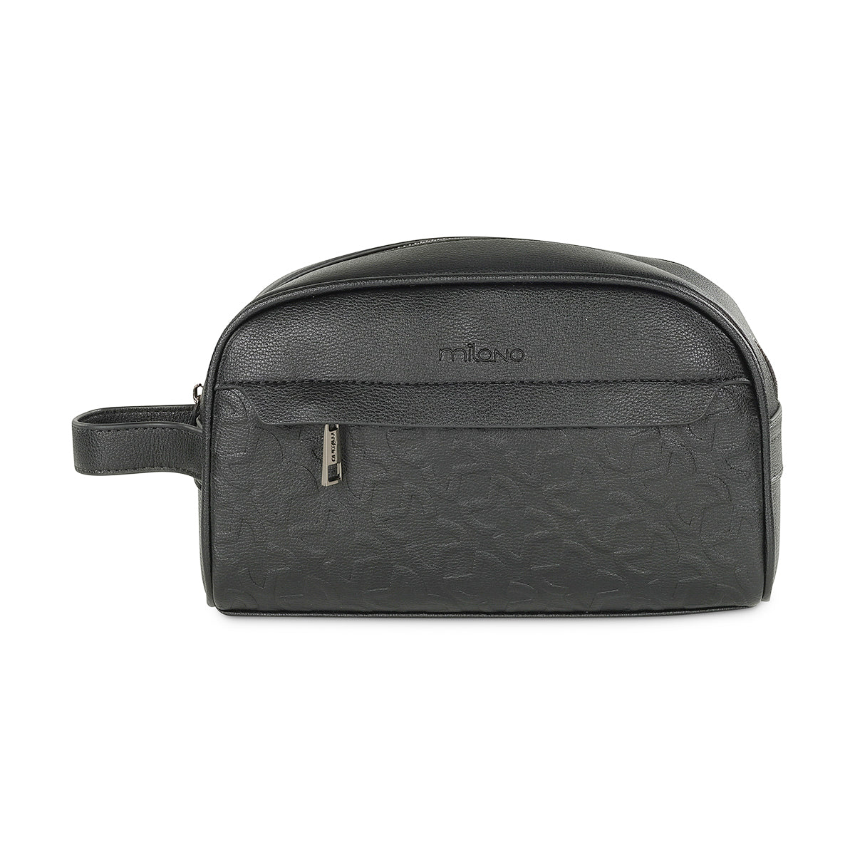 Our sleek black washbag combines sophistication with practicality, featuring an elegant debossed Milano monogram design. It includes a convenient wrist strap for easy hand carrying and ample internal pockets to keep all your essentials neatly organized.