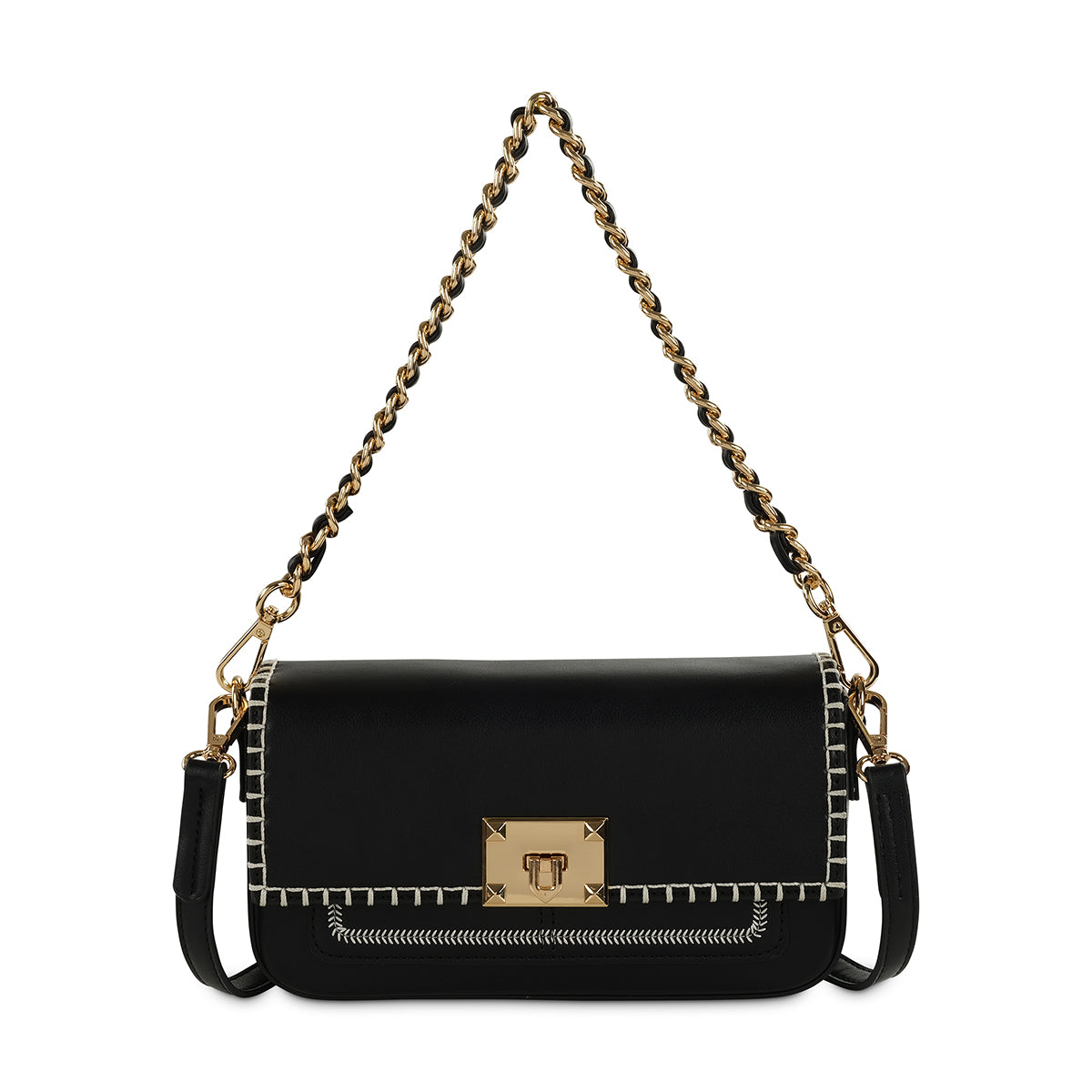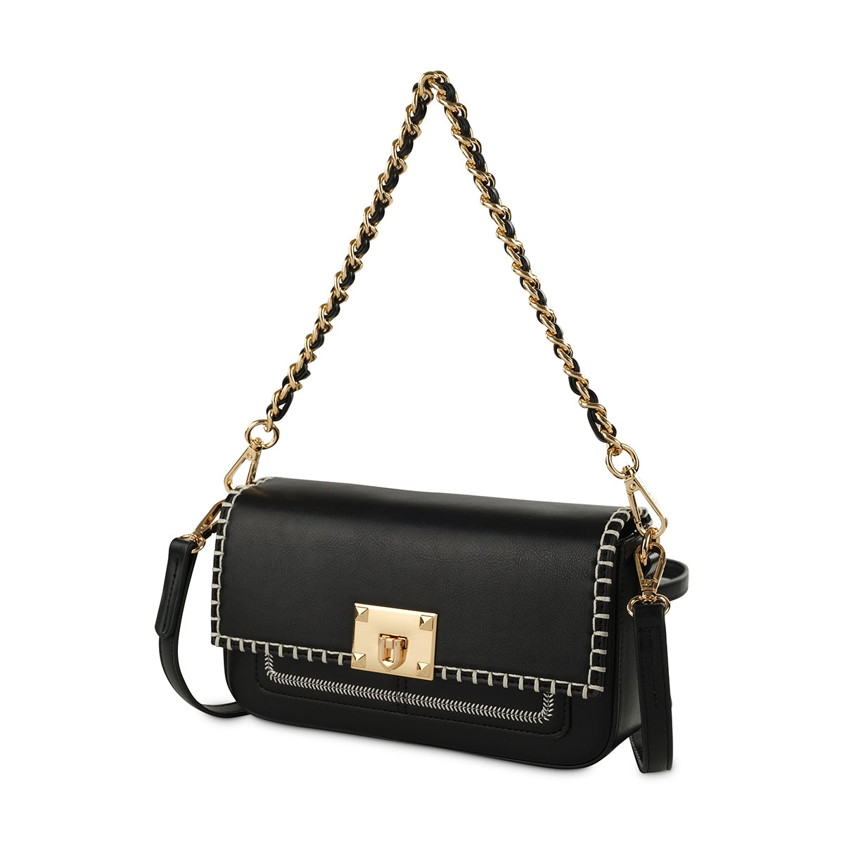 This black shoulder bag is the perfect blend of classic style and modern details. The striking white stitching creates a bold contrast against the sleek black faux leather, while the gold lock adds a touch of elegance. Internal pockets keep your everyday essentials organized.