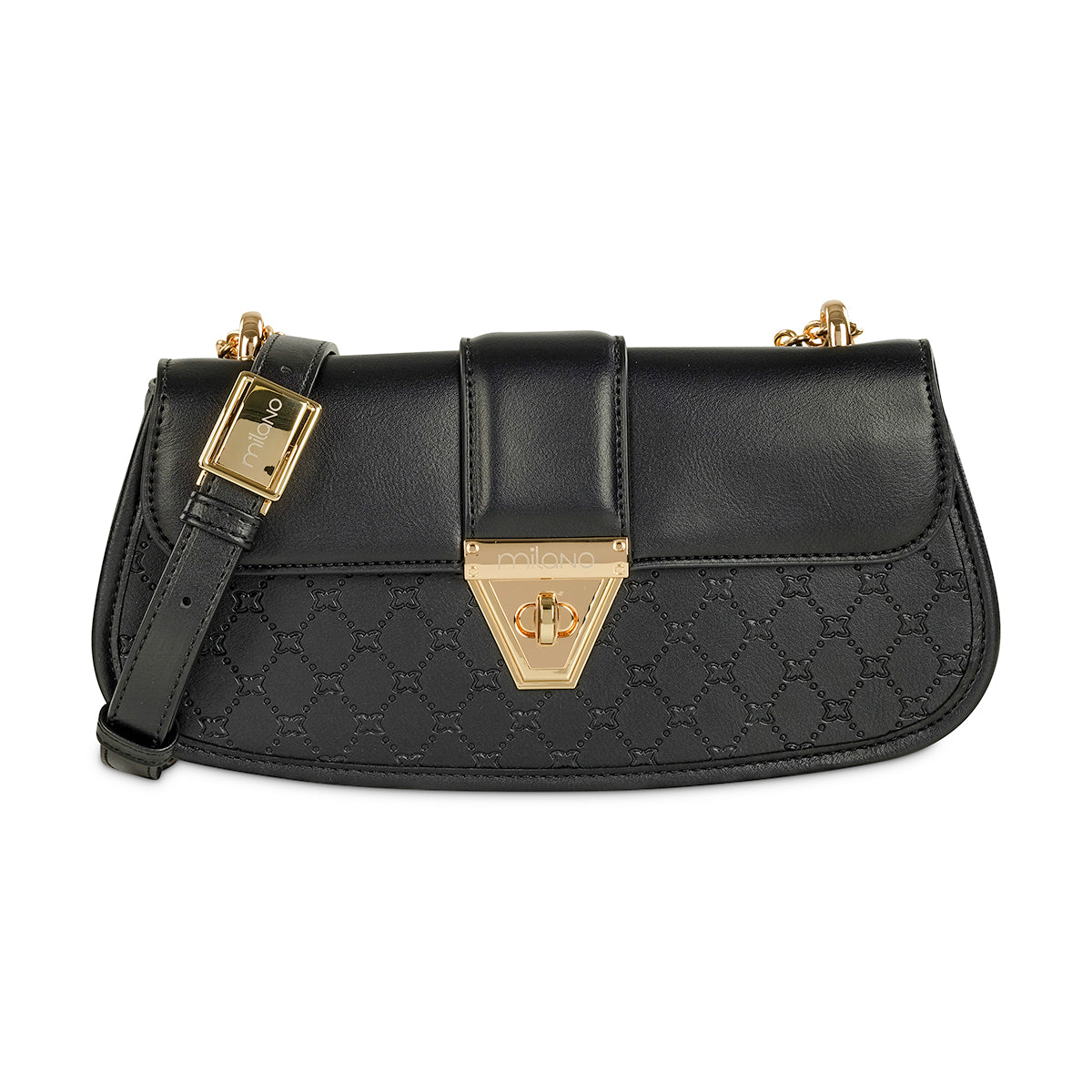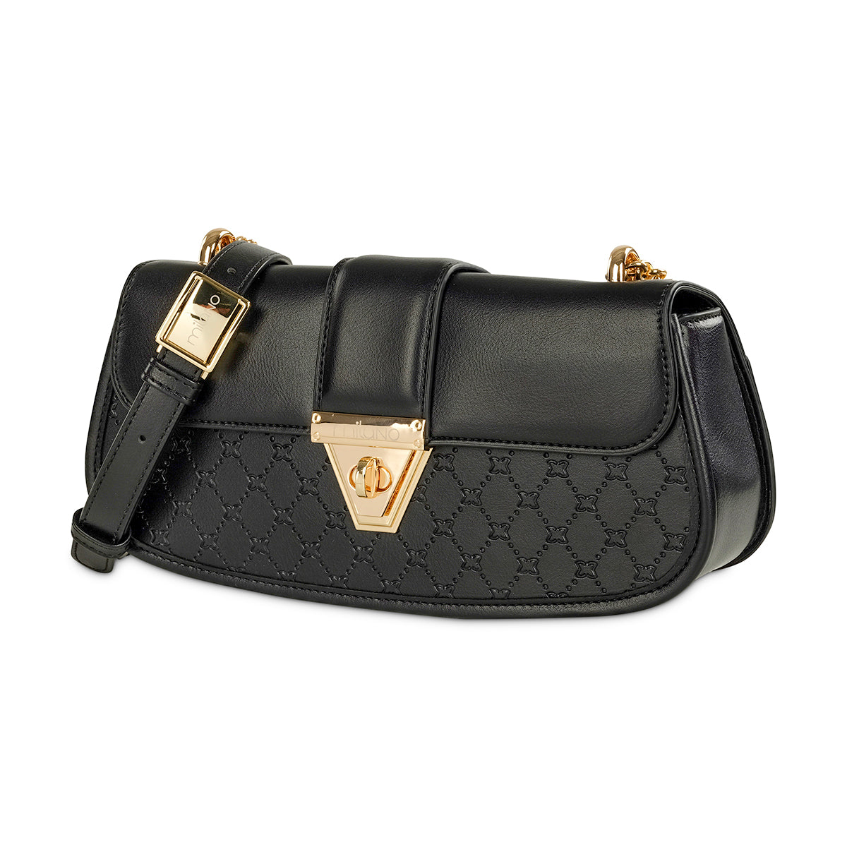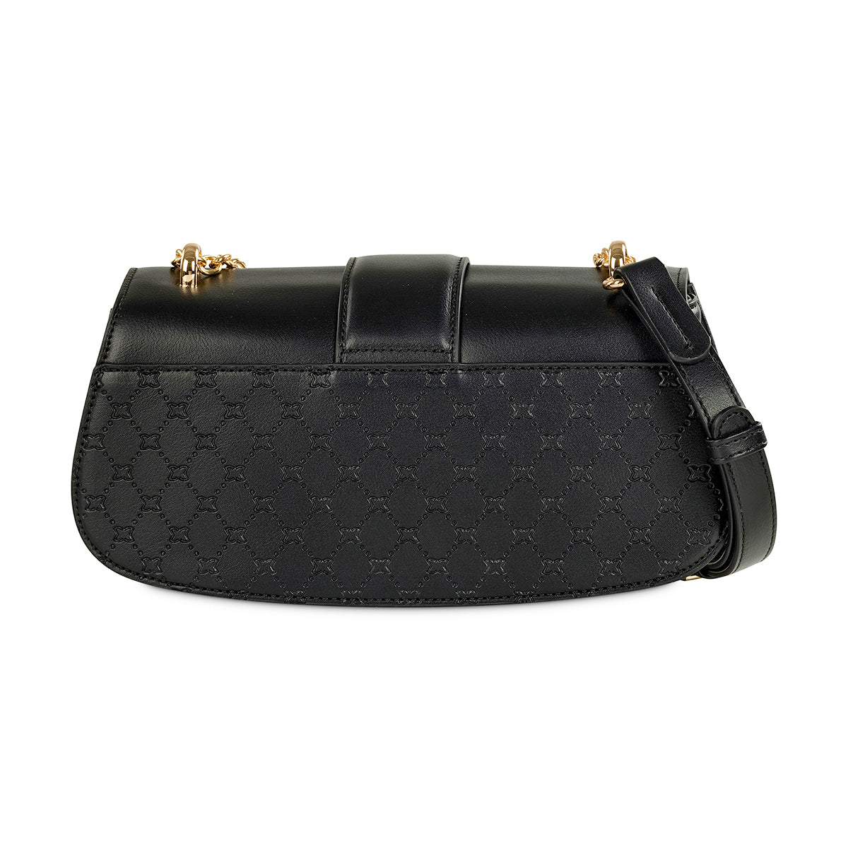Elevate your style with our chic black shoulder bag, a perfect blend of classic and contemporary. It features a sleek top flap, secured by a distinctive gold-tone clasp, beautifully contrasted by a luxurious quilted lower body. Complete with a sophisticated gold-tone chain strap, this bag is an essential for refined everyday elegance.