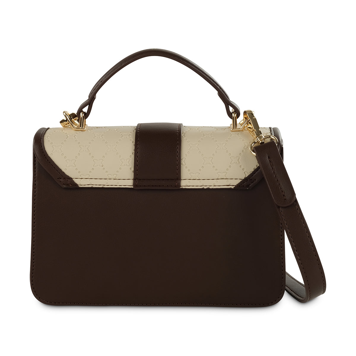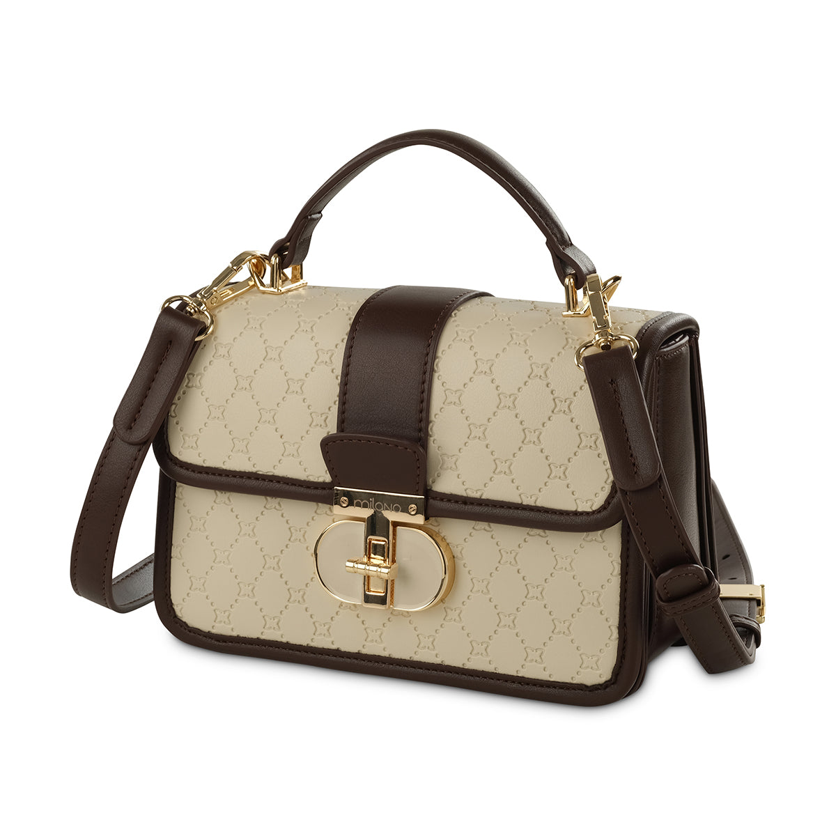 Elevate your style with our sophisticated two-tone top-handle bag. This structured piece features an elegant embossed monogram print in cream, beautifully contrasted by rich dark brown accents and a prominent gold-tone circular clasp. With its comfortable top handle and detachable shoulder strap, it's a versatile choice for any refined occasion.