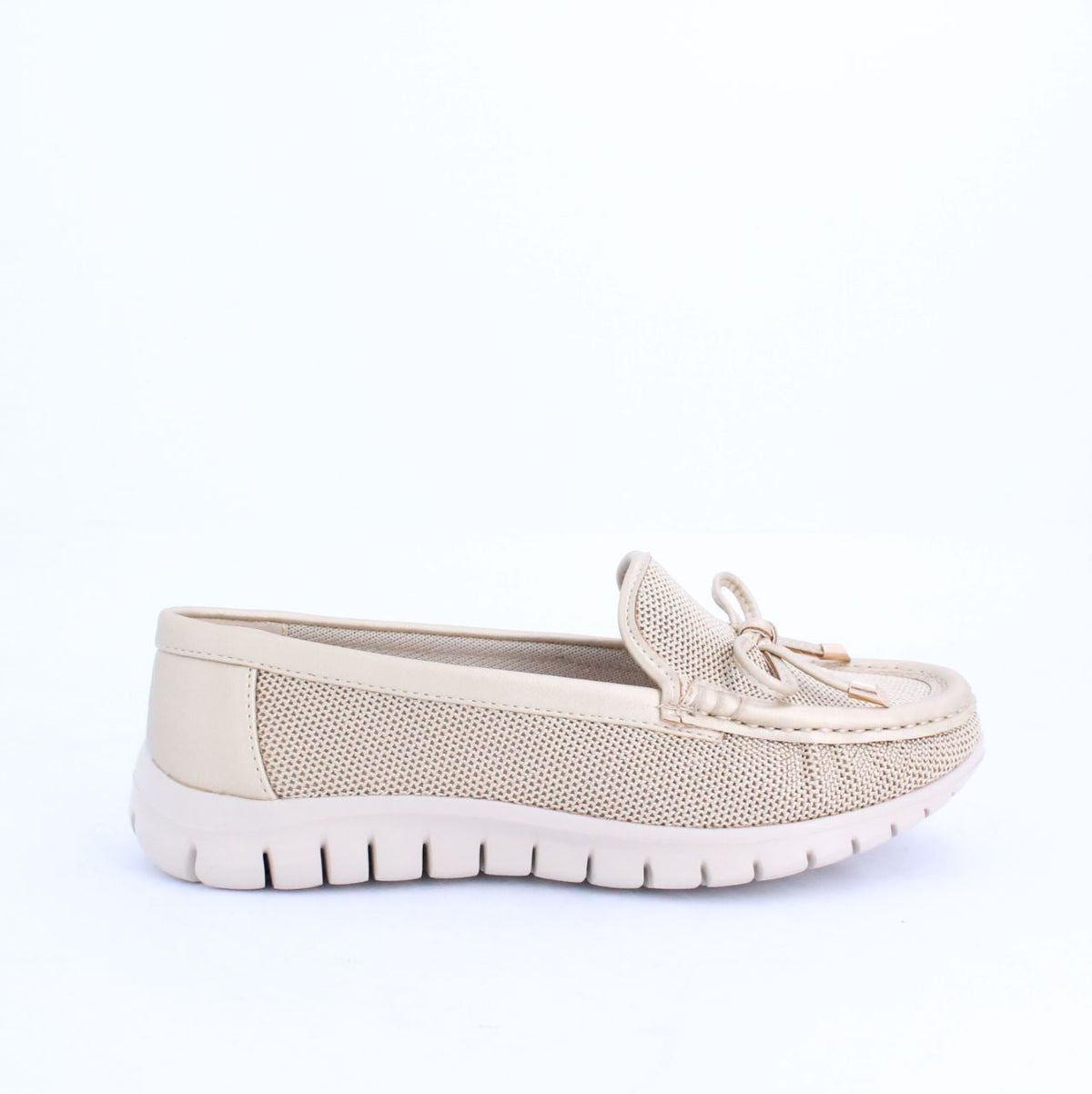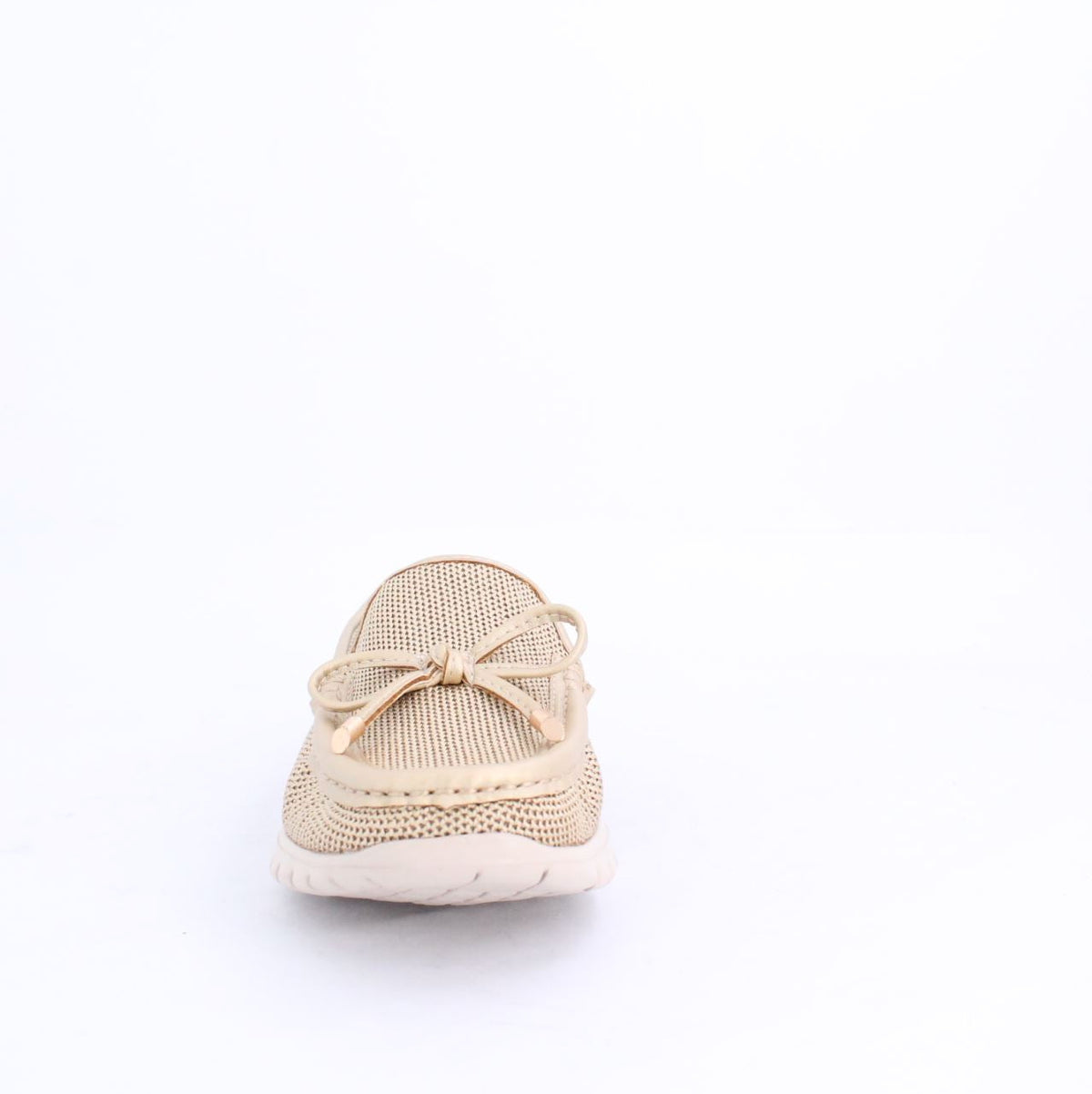 Arella moccasins in a breathable metallic mesh. It has decorative bow, a lightweight ridged sole for comfort, and a padded insole. Perfect for casual or semi-formal wear, its slip-on style ensures easy, all-day use.