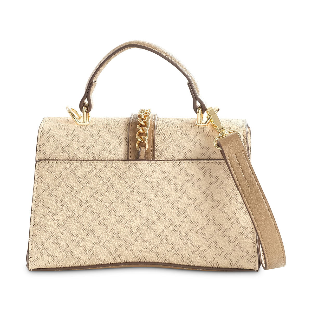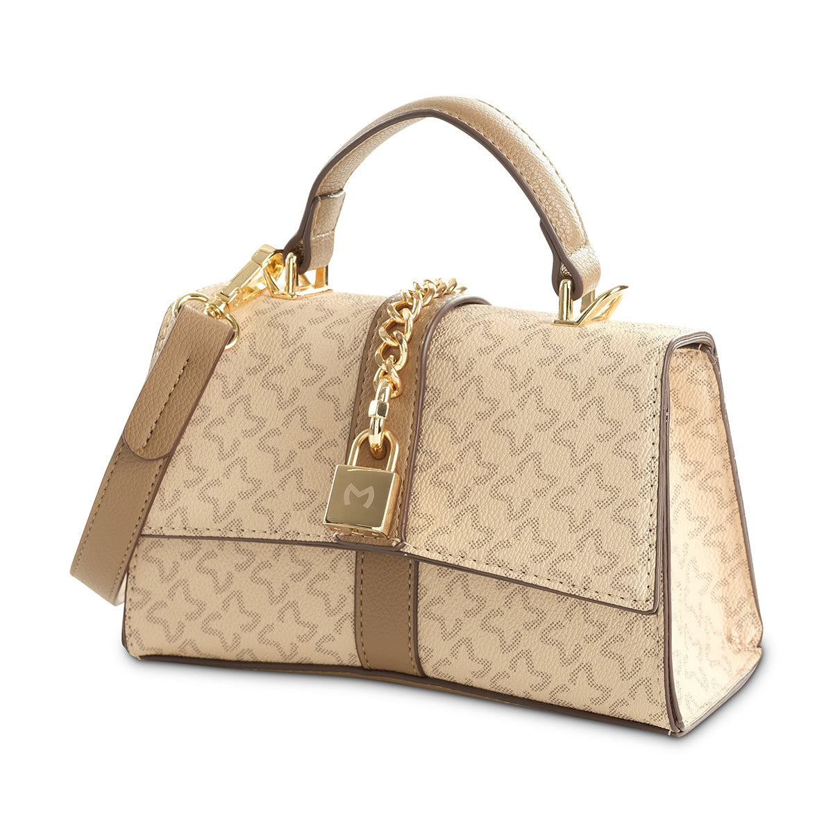 Elevate your ensemble with our sophisticated top-handle bag in a beautiful light beige monogram. This structured piece features a timeless flap closure secured by a prominent gold-tone lock, complemented by a chic chunky chain detail. Carry it gracefully by its top handle for a refined and luxurious look.