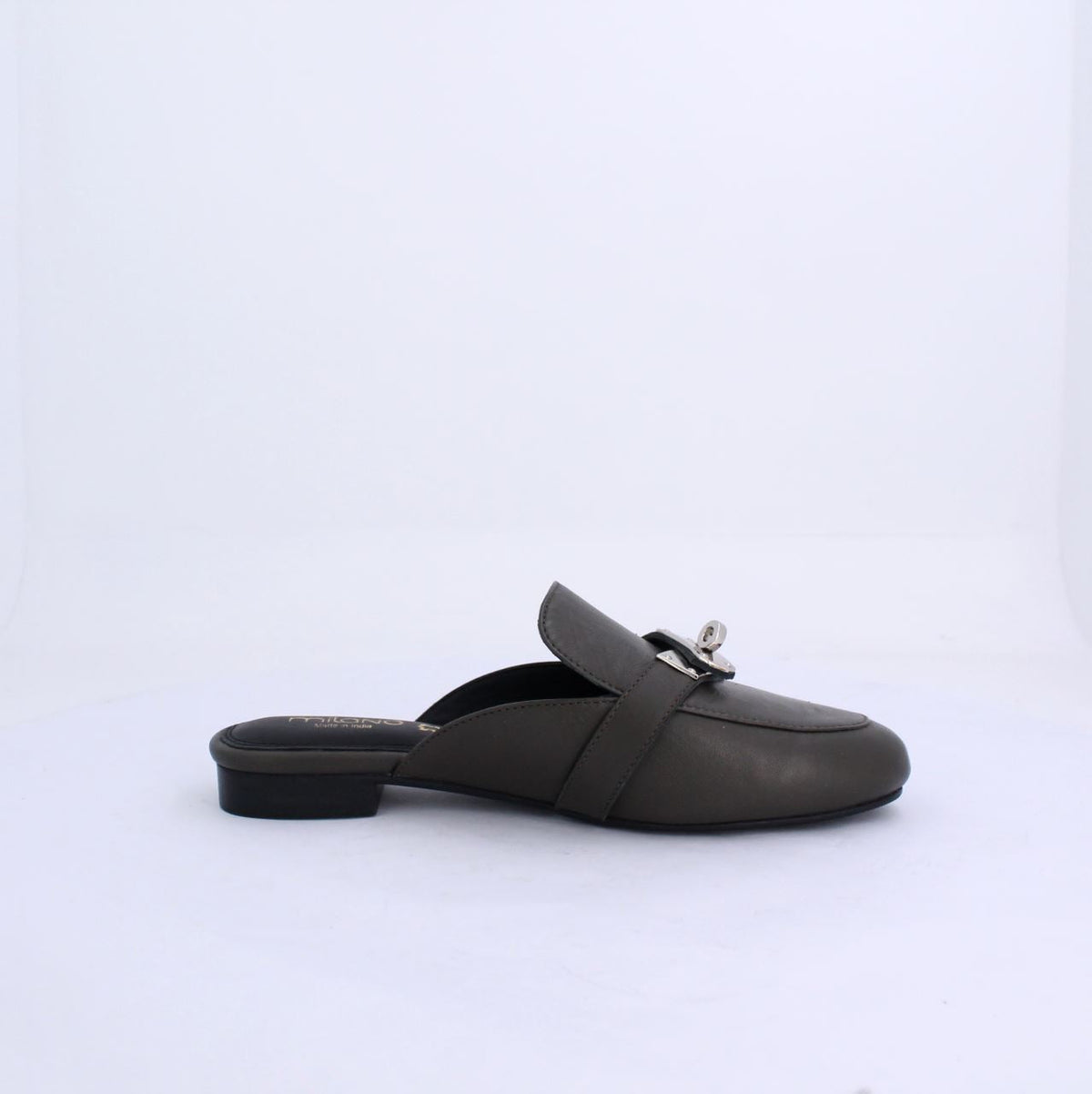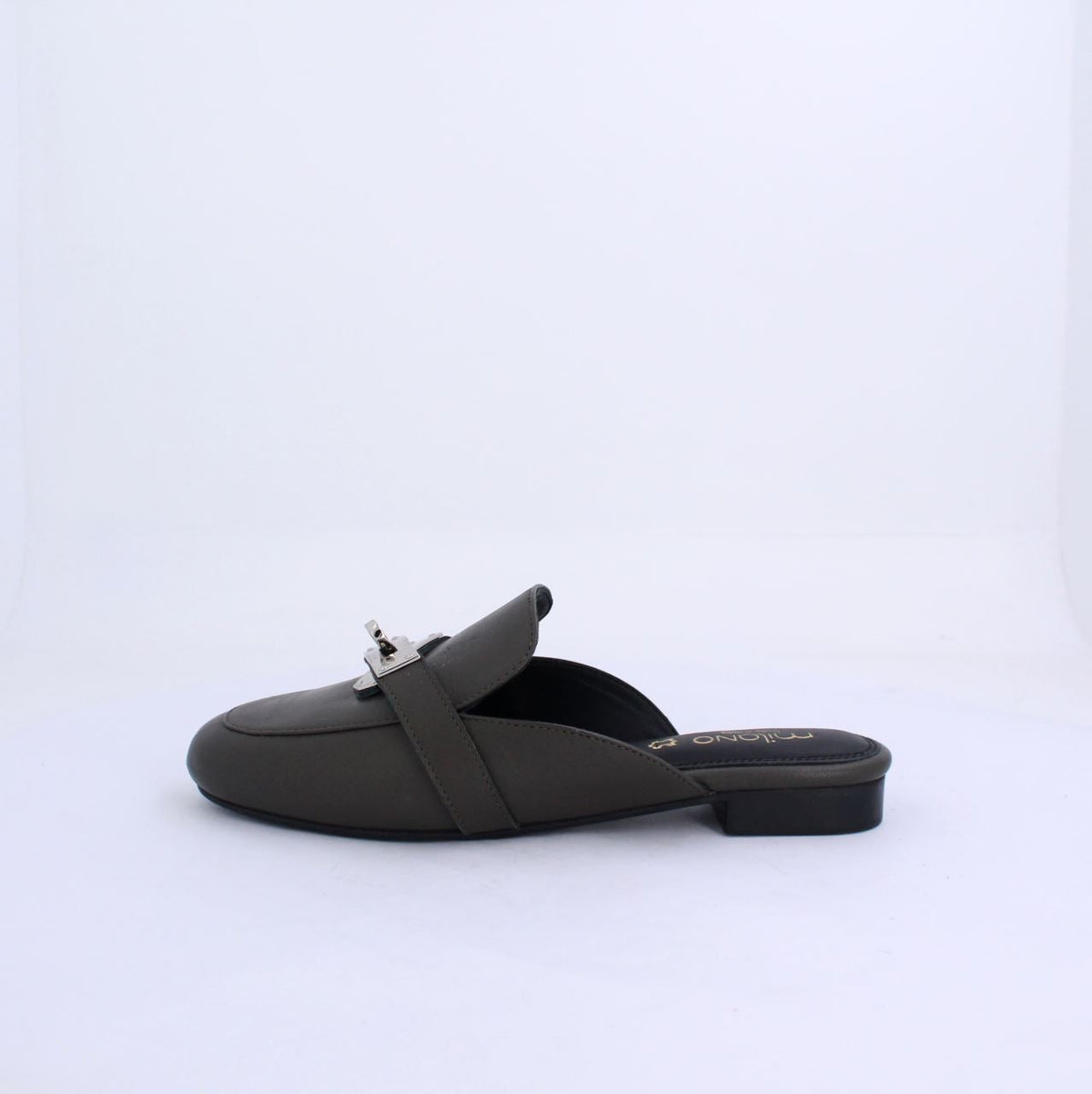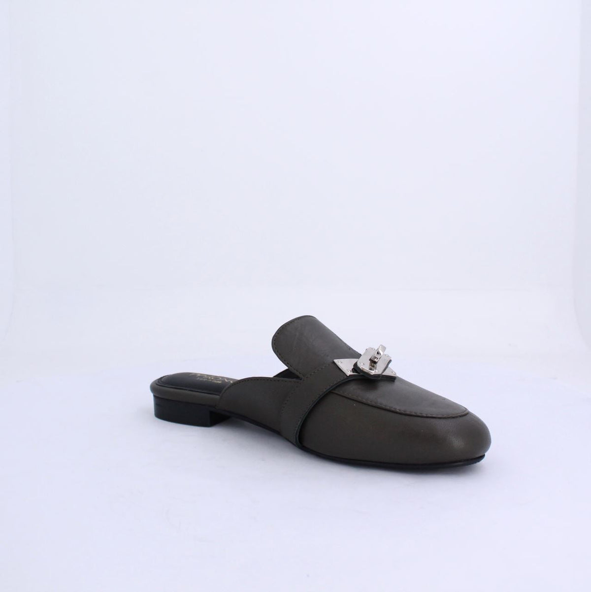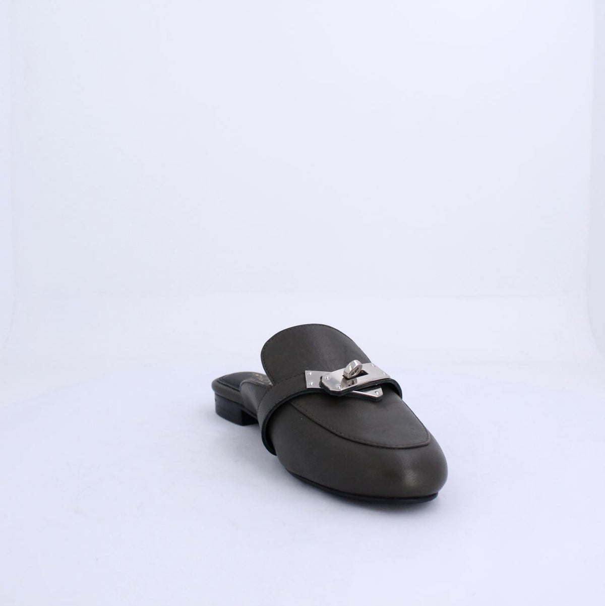 A dark green mule-style loafer. It has a sleek, minimalist design with a closed toe and an open back, making it easy to slip on. The upper part features a decorative metal buckle detail, adding a touch of sophistication to its overall look. It has a low, flat heel and crafted from leather material, suitable for casual or semi-formal wear.