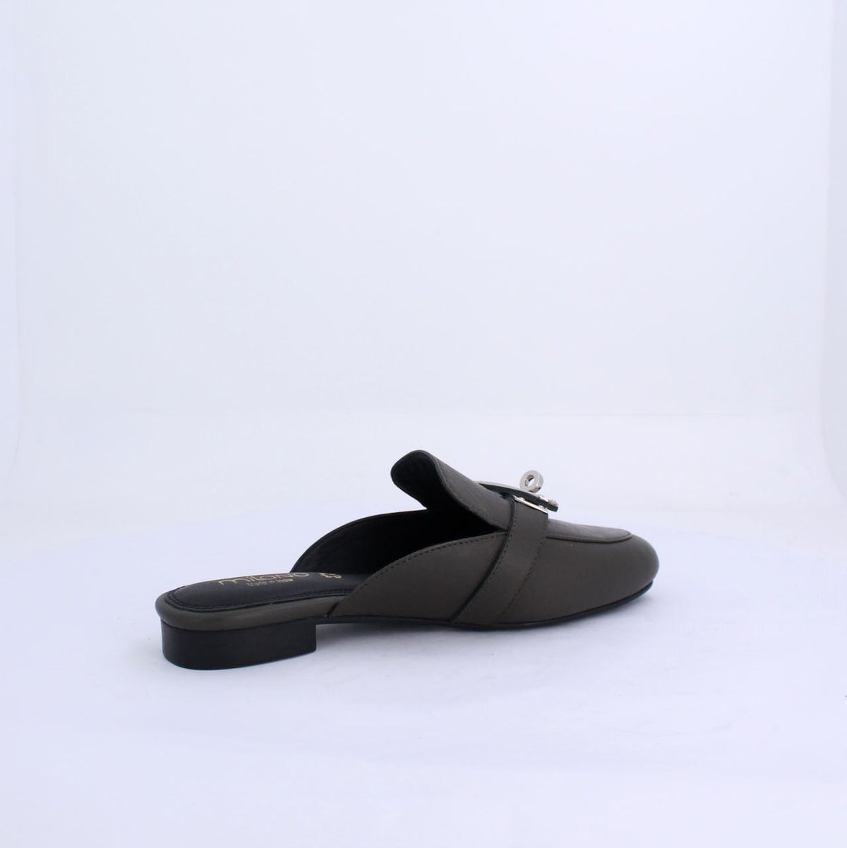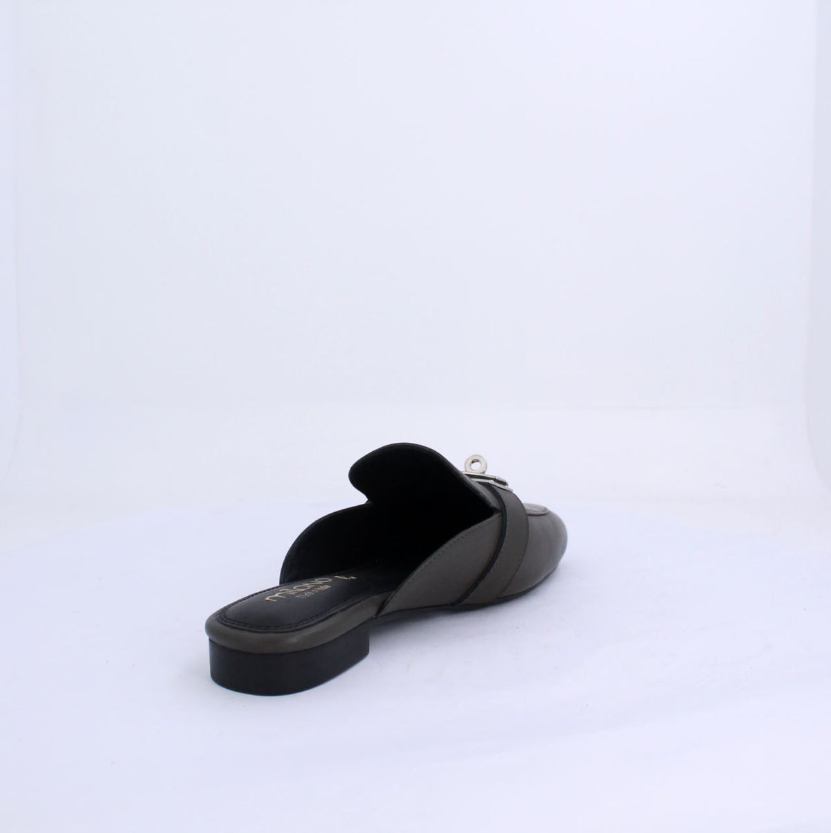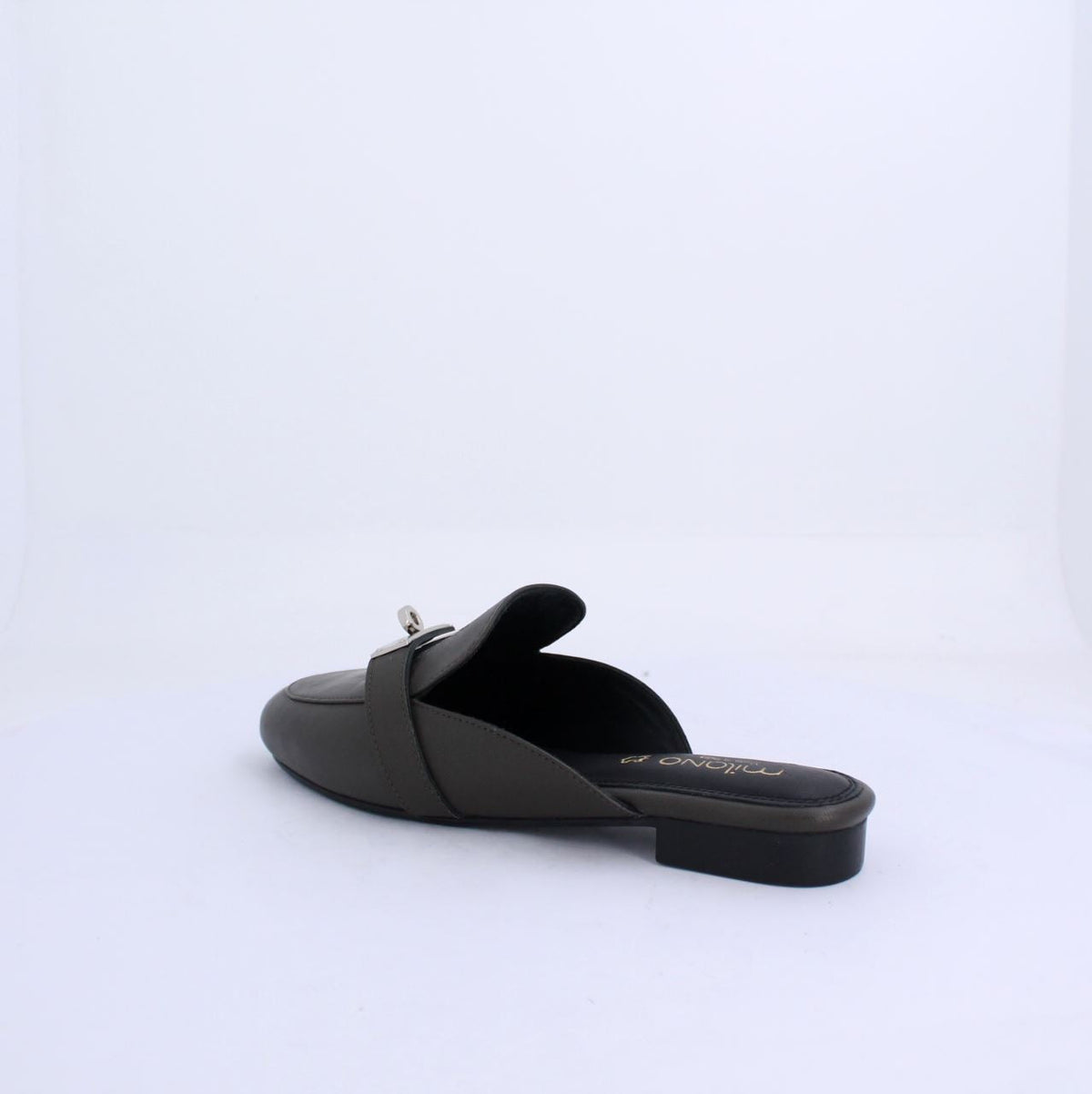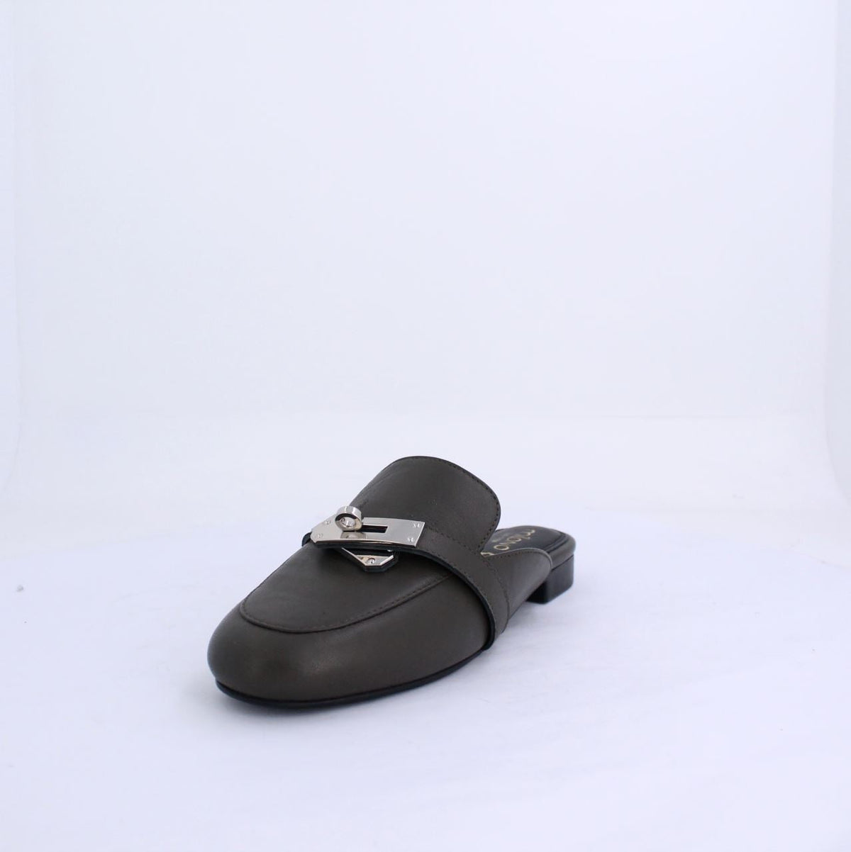 A dark green mule-style loafer. It has a sleek, minimalist design with a closed toe and an open back, making it easy to slip on. The upper part features a decorative metal buckle detail, adding a touch of sophistication to its overall look. It has a low, flat heel and crafted from leather material, suitable for casual or semi-formal wear.