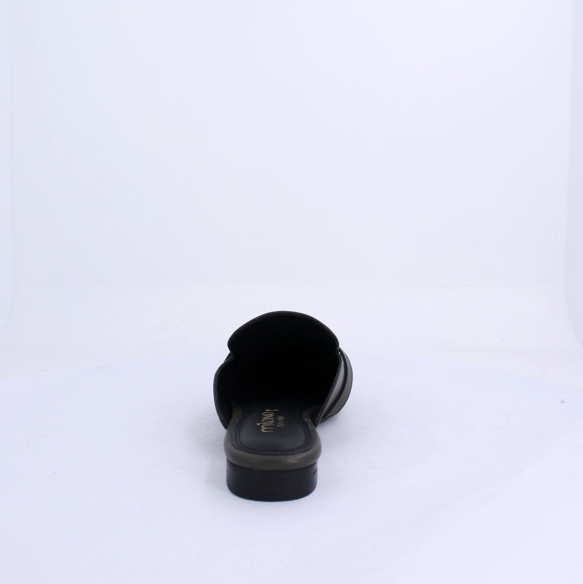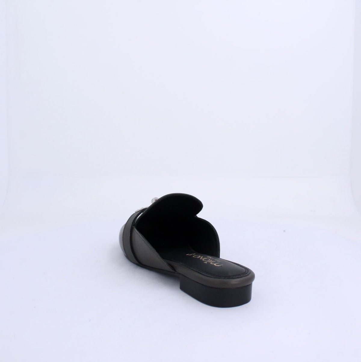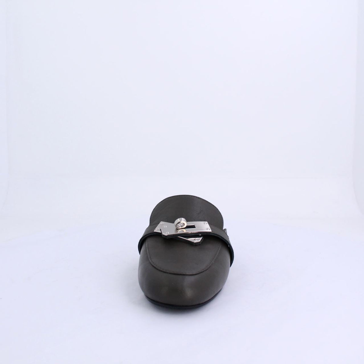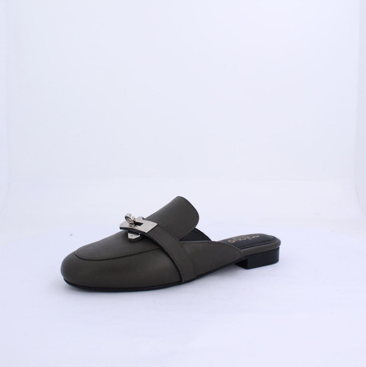 A dark green mule-style loafer. It has a sleek, minimalist design with a closed toe and an open back, making it easy to slip on. The upper part features a decorative metal buckle detail, adding a touch of sophistication to its overall look. It has a low, flat heel and crafted from leather material, suitable for casual or semi-formal wear.
