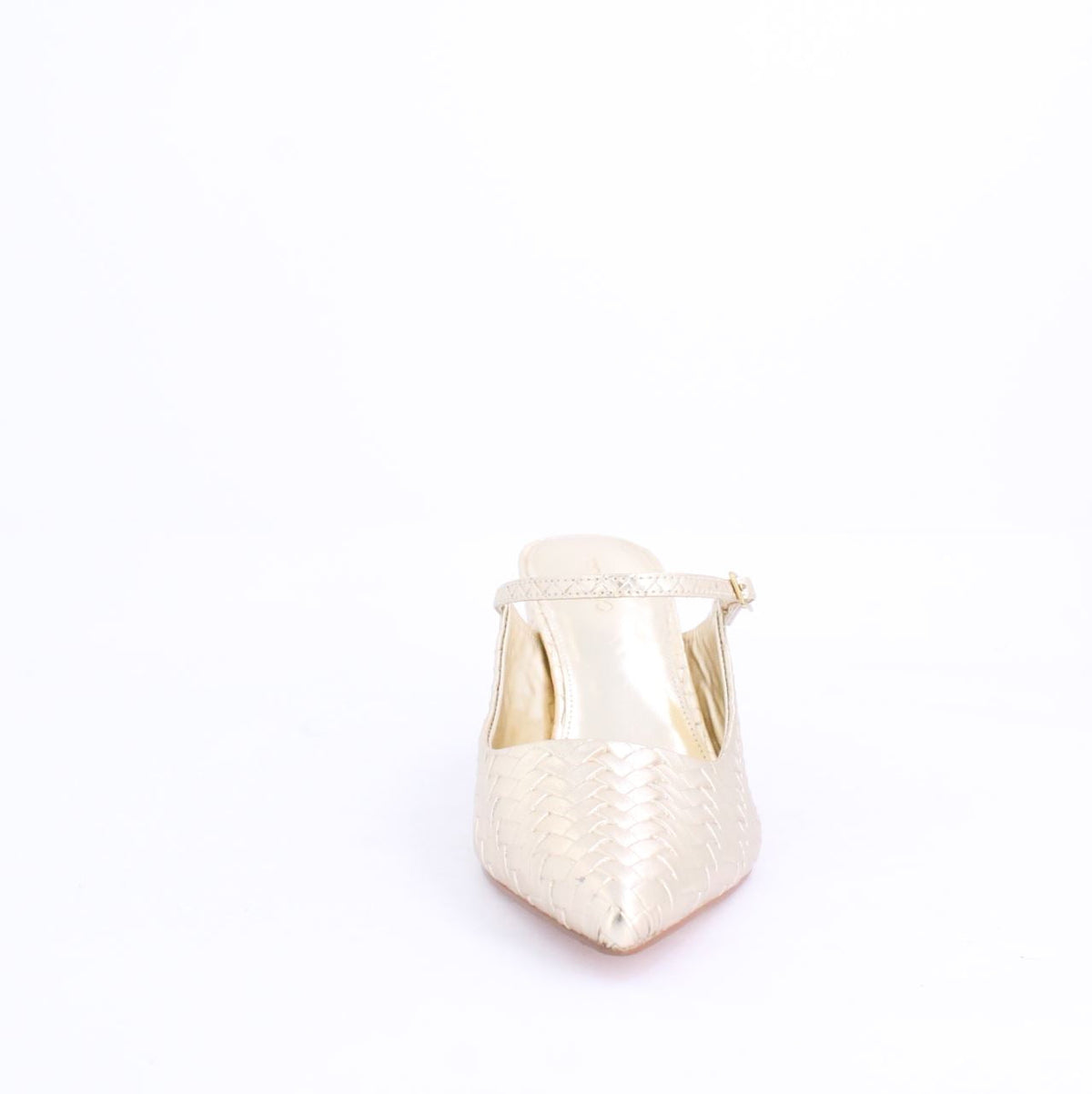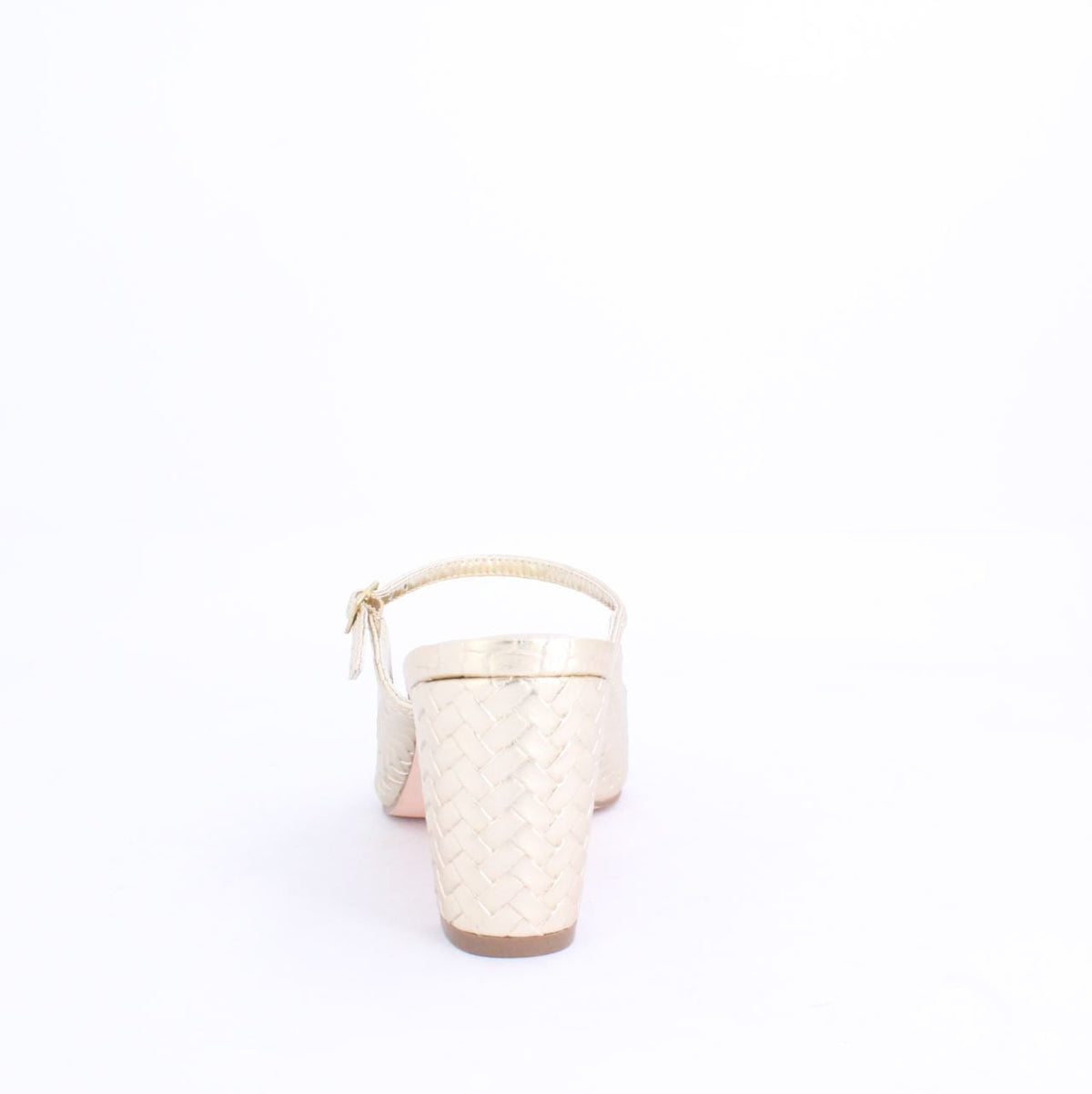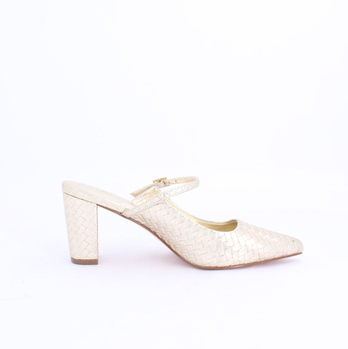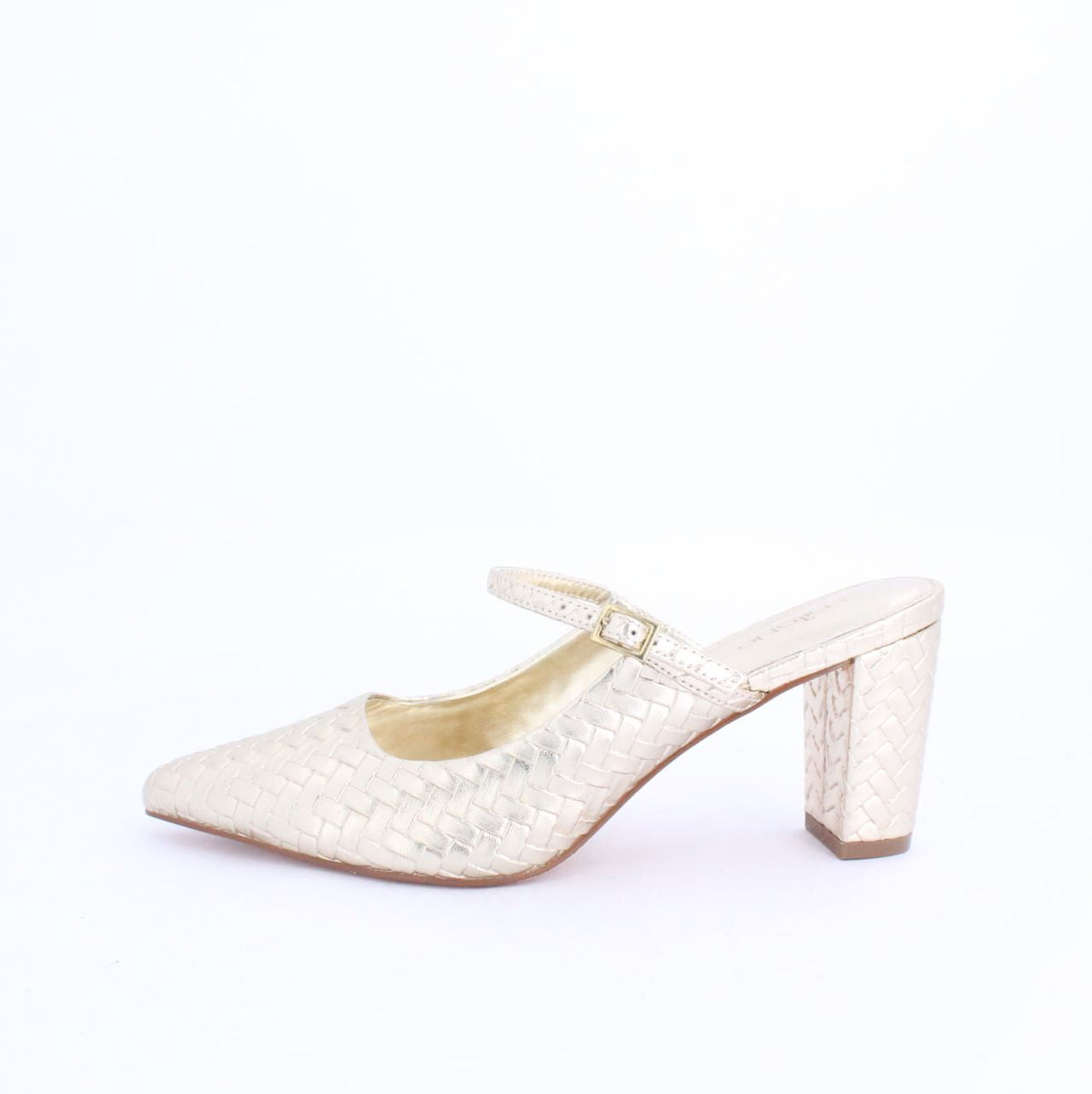 The Brossa Mule in metallic gold finish with a woven texture, a pointed toe, a medium block heel, and an adjustable buckle strap for a secure fit. It is stylish and versatile, ideal for formal and semi-formal occasions, offering both comfort and stability for prolonged wear while pairing well with dresses or tailored outfits.