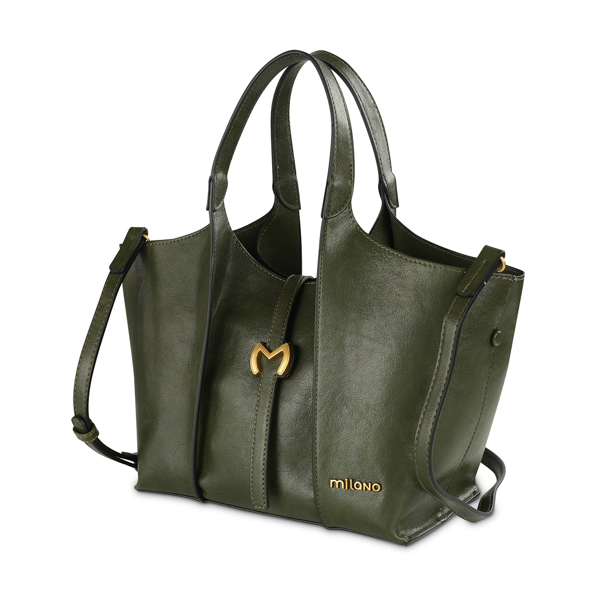 Make a sophisticated statement with our structured khaki tote bag. Its clean lines and subtle texture are beautifully enhanced by a prominent gold-tone 'M' hardware detail and a chic 'Milano' logo. Featuring a comfortable top handle and a versatile detachable strap, this bag is a stylish and functional choice for any occasio