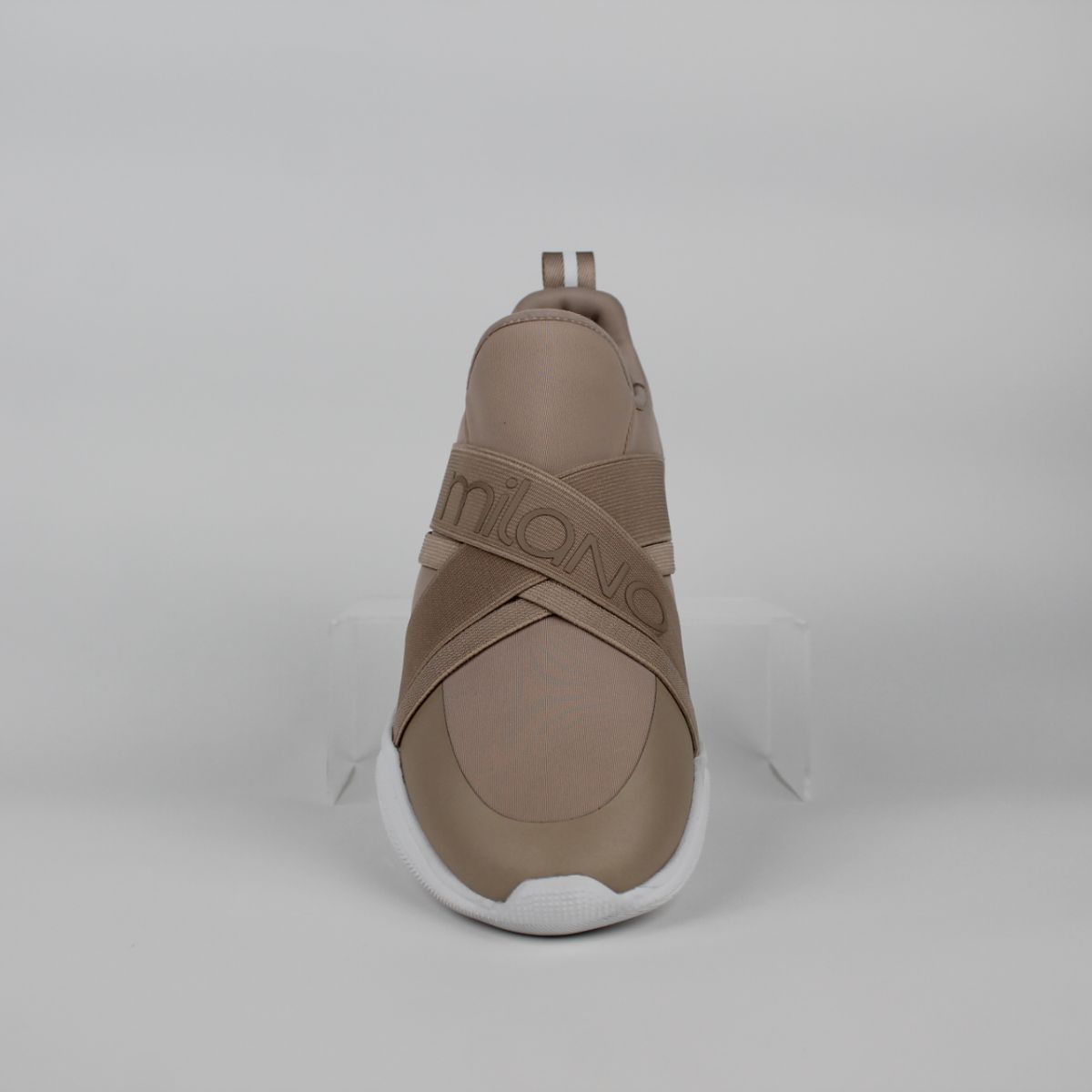 New colorway of the style Dabria, effortlessly stylish and comfortable. These slip-on sneakers feature a sock-like fit and a sleek, multi-strap design with "Milano" statement" across the vamp. The lightweight white sculpted sole provides a modern, athletic look, while the neutral beige tone ensures versatility for everyday wear.