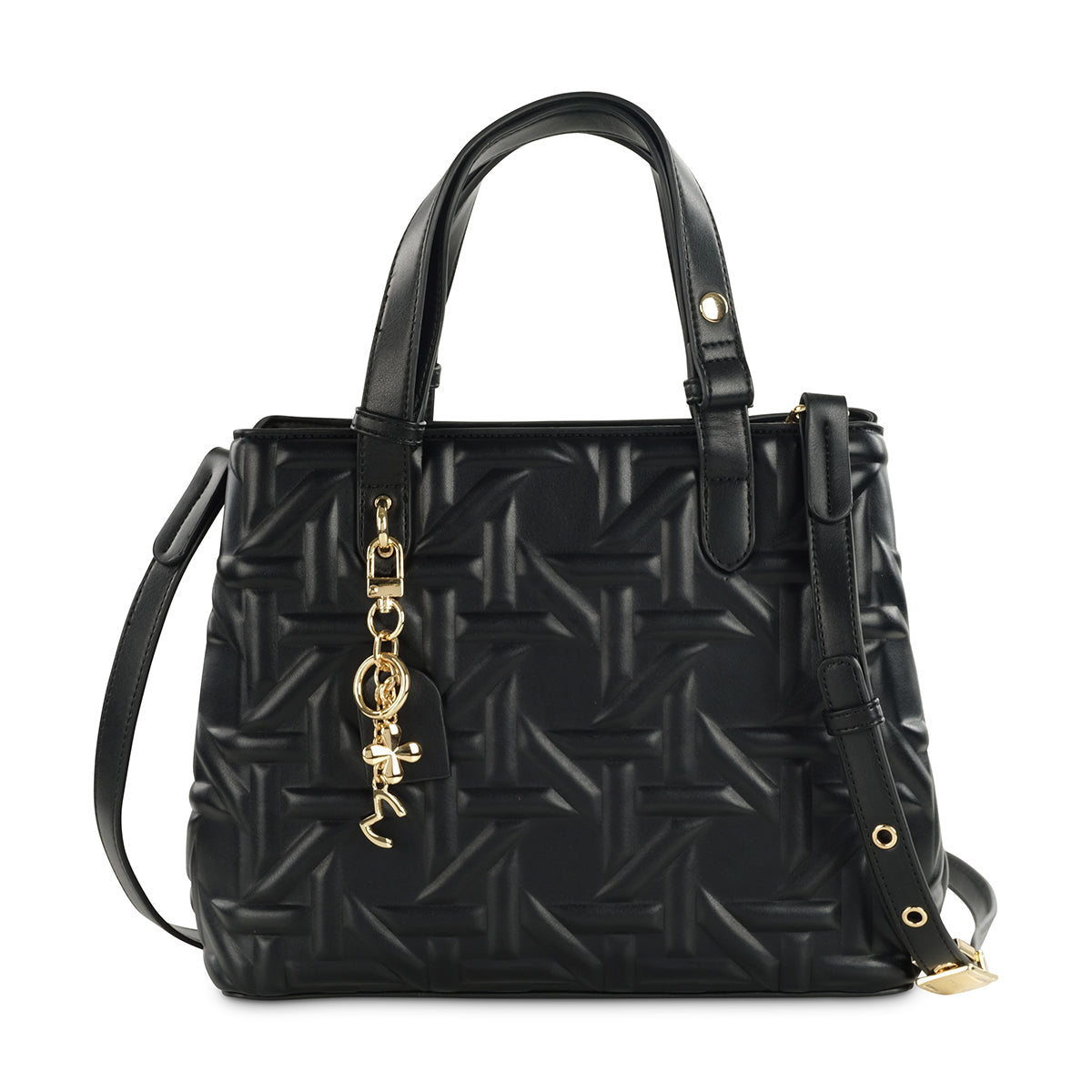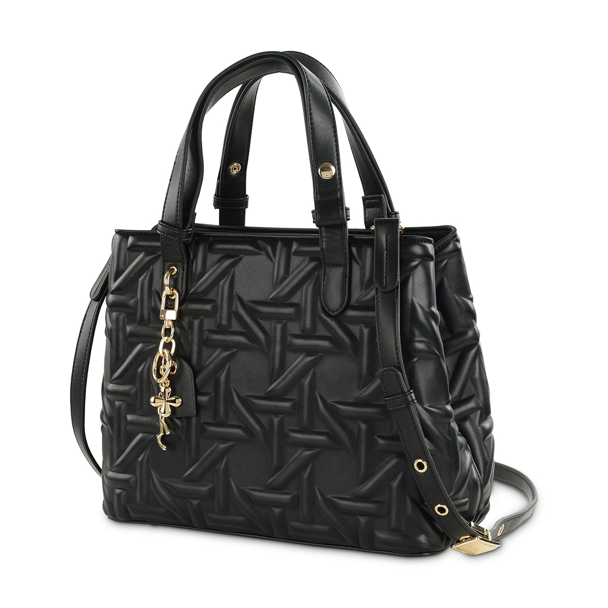 Elevate your everyday with our sophisticated black tote and matching pouch set. Both pieces feature a unique debossed pattern that adds subtle texture and modern style. The spacious tote comes with elegant top handles and a charming gold-tone key detail, while the coordinating zipped pouch offers versatile organization, perfect for keeping essentials close at hand.