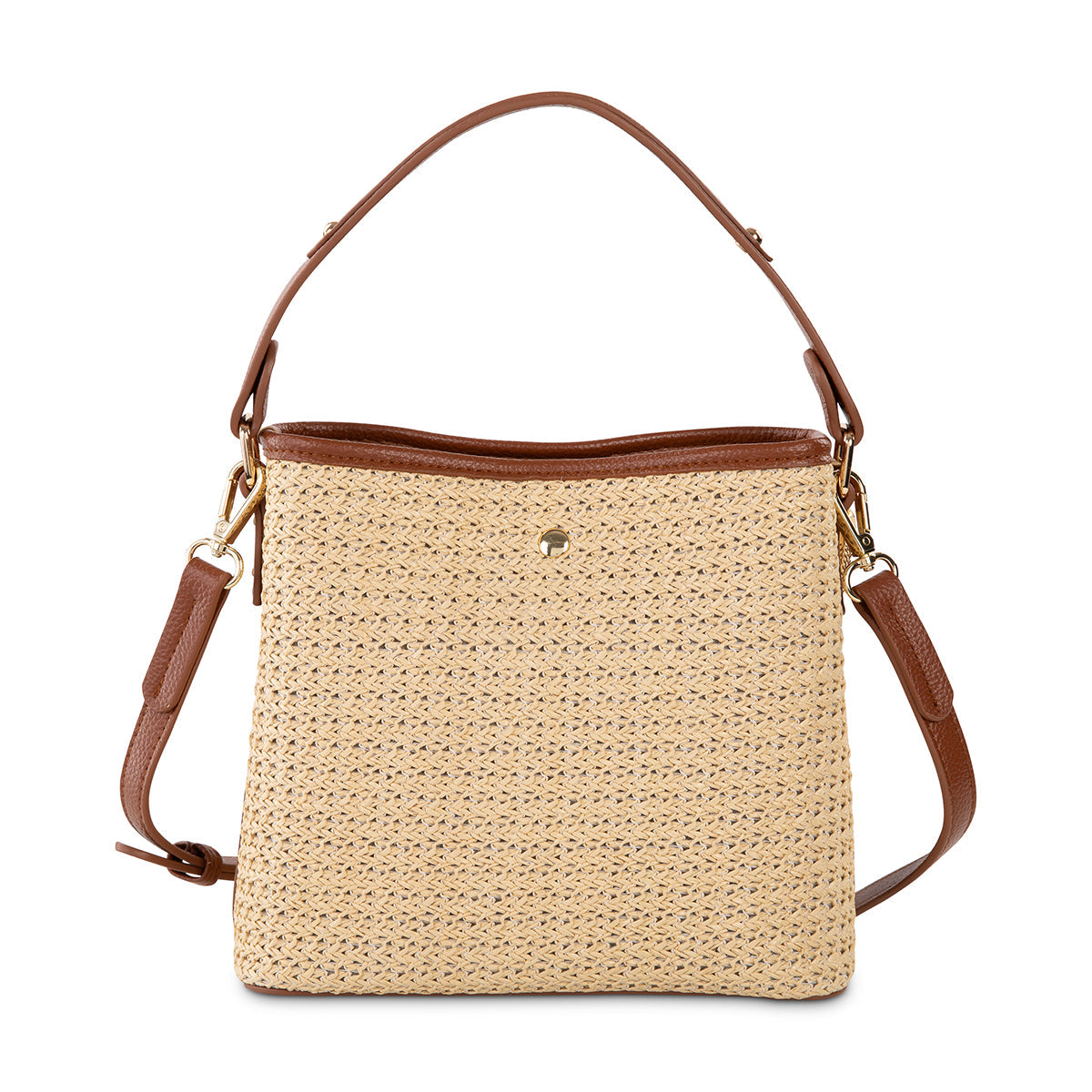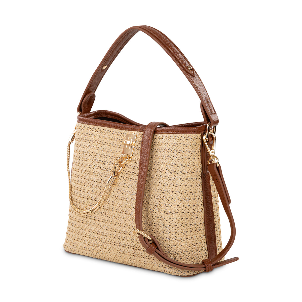 Embrace a relaxed yet refined style with this woven tote bag. Featuring a natural, textured weave complemented by rich leather accents, it's perfect for adding a touch of casual elegance to your look. The unique front clasp detail and optional chain strap offer both style and versatility, making it an ideal companion for everyday adventures.