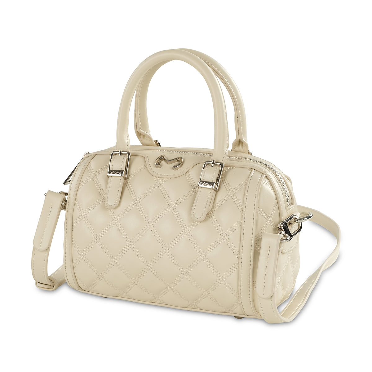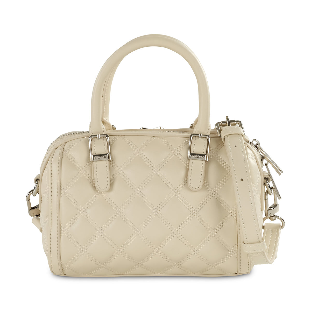 Introducing our charming cream quilted mini bag, a perfect blend of elegance and versatility. This compact satchel features chic top handles, a convenient double-zip closure, and a detachable strap for effortless crossbody or shoulder wear. The classic diamond quilting and polished silver-tone hardware add a touch of timeless sophistication to any outfit.