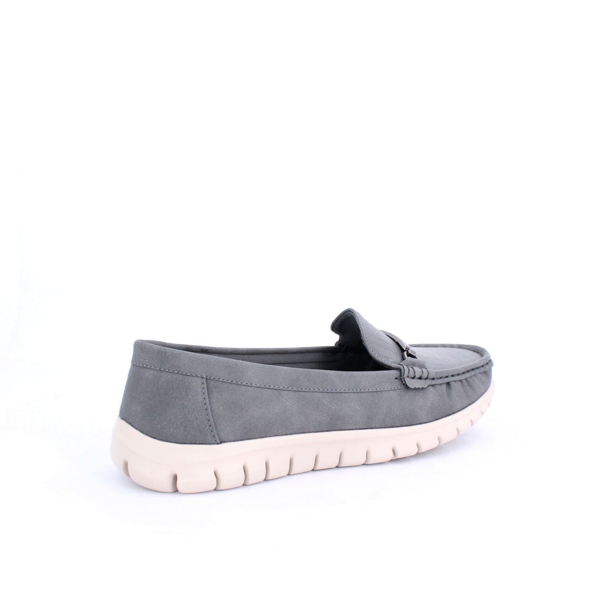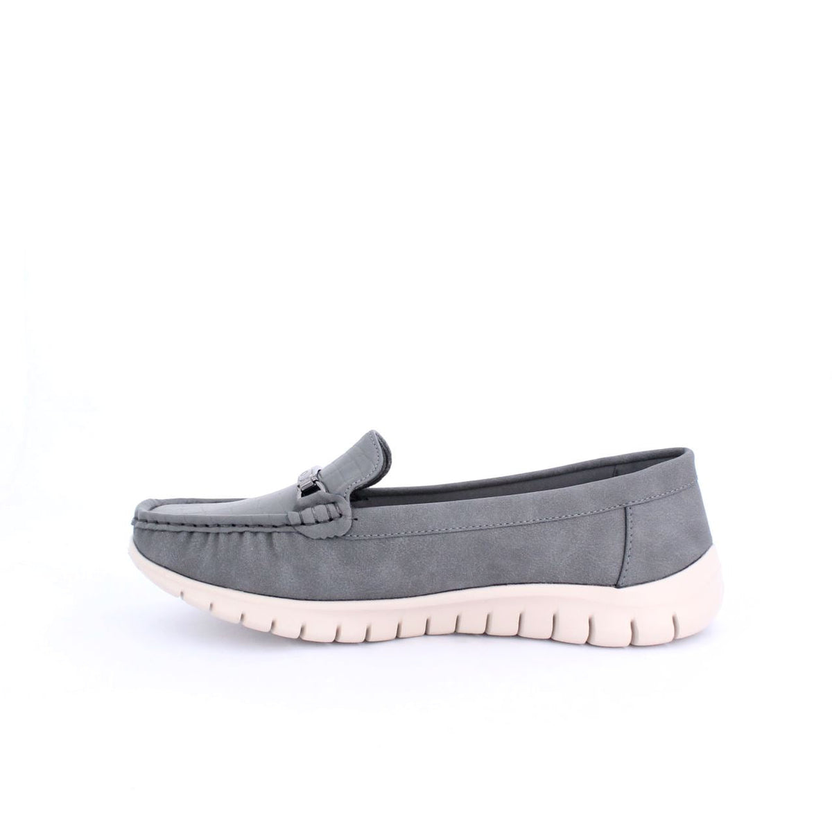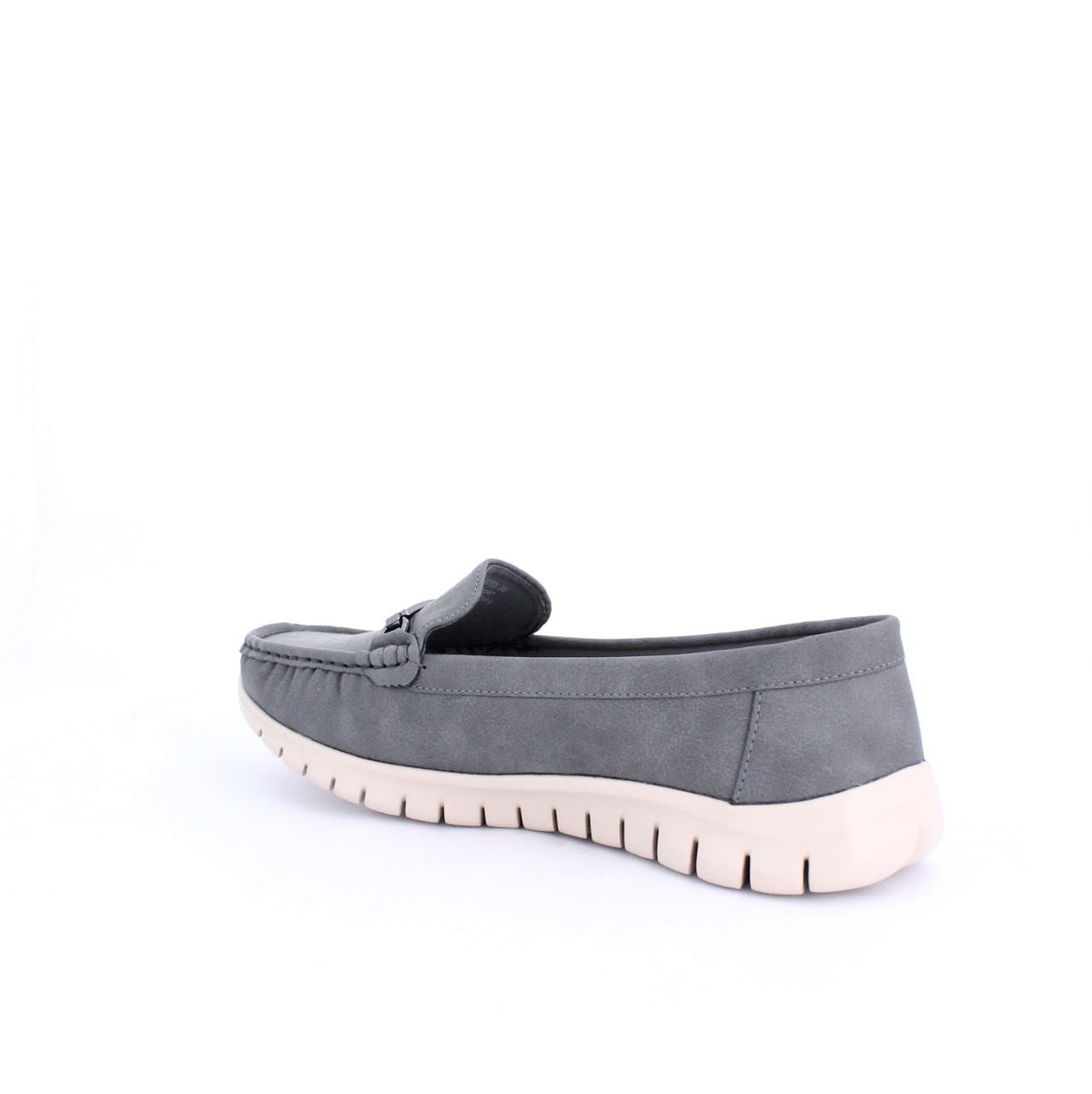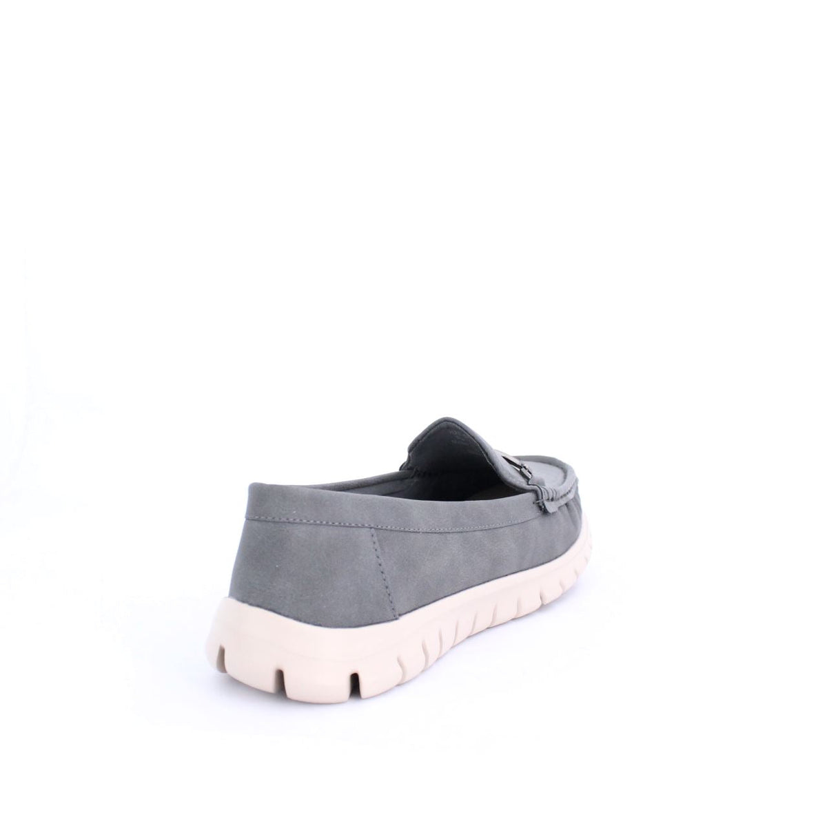 A casual loafer-style shoe with a flexible and comfortable design. The shoe features a moccasin-style stitched upper and a small decorative bit on the top. The sole is a contrasting white rubber material, with grooves along the sides and bottom for added flexibility and grip. The soft upper is made of sustainable material gives the shoe a relaxed yet stylish look, making it ideal for casual, everyday wear.