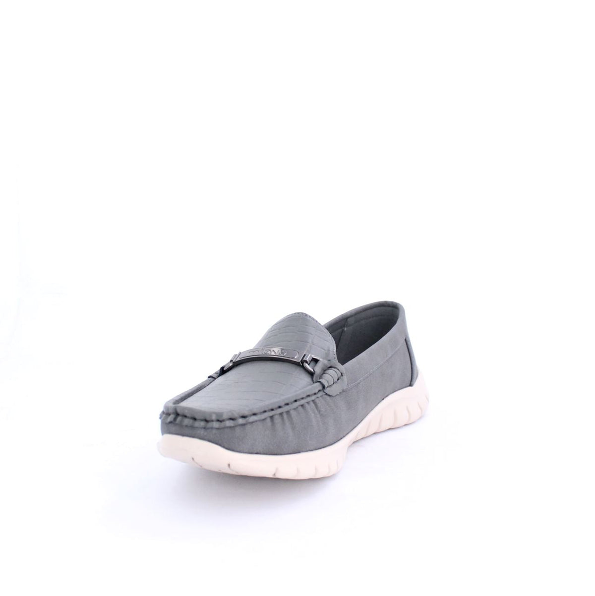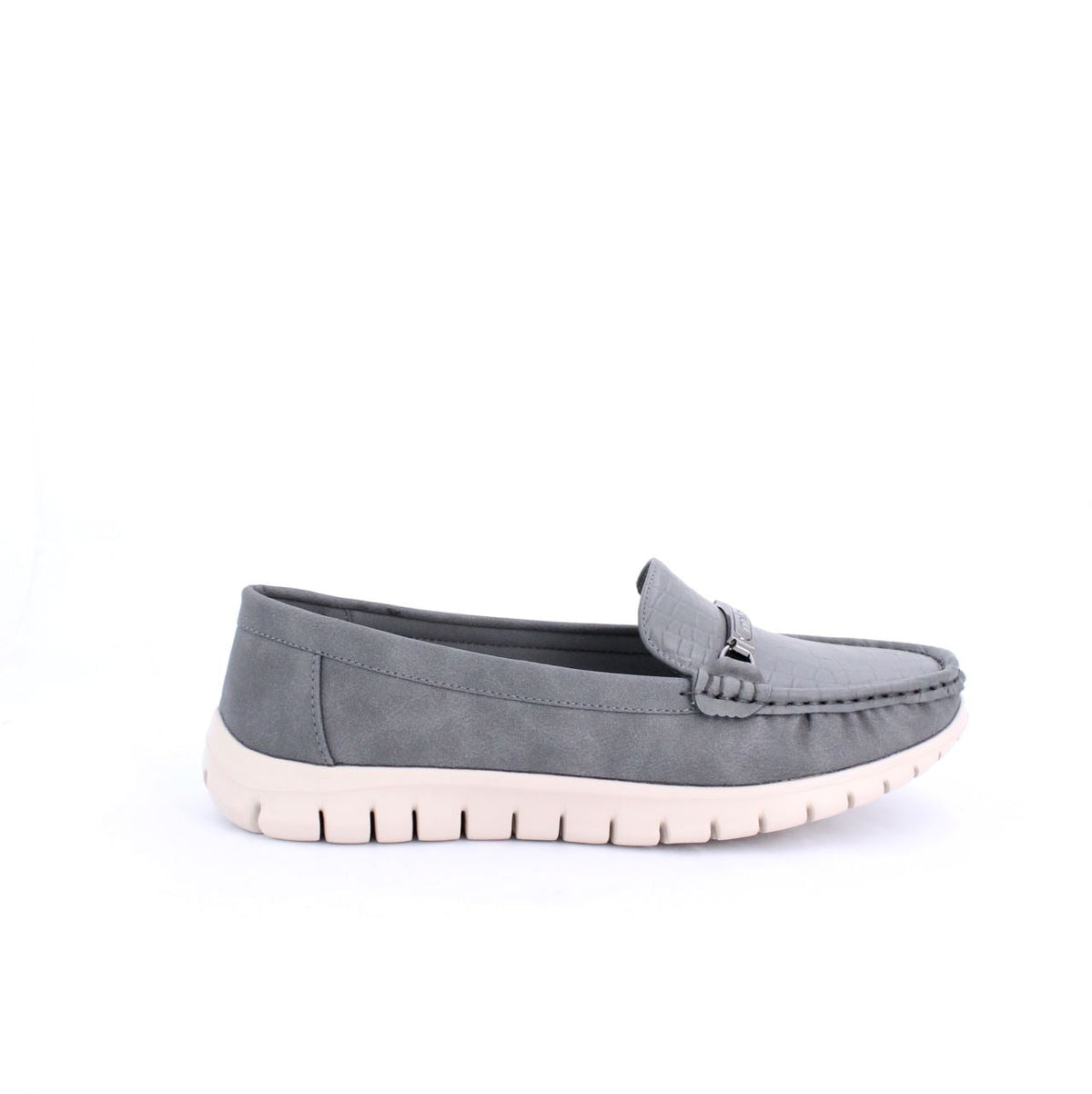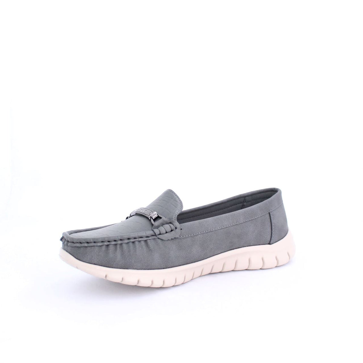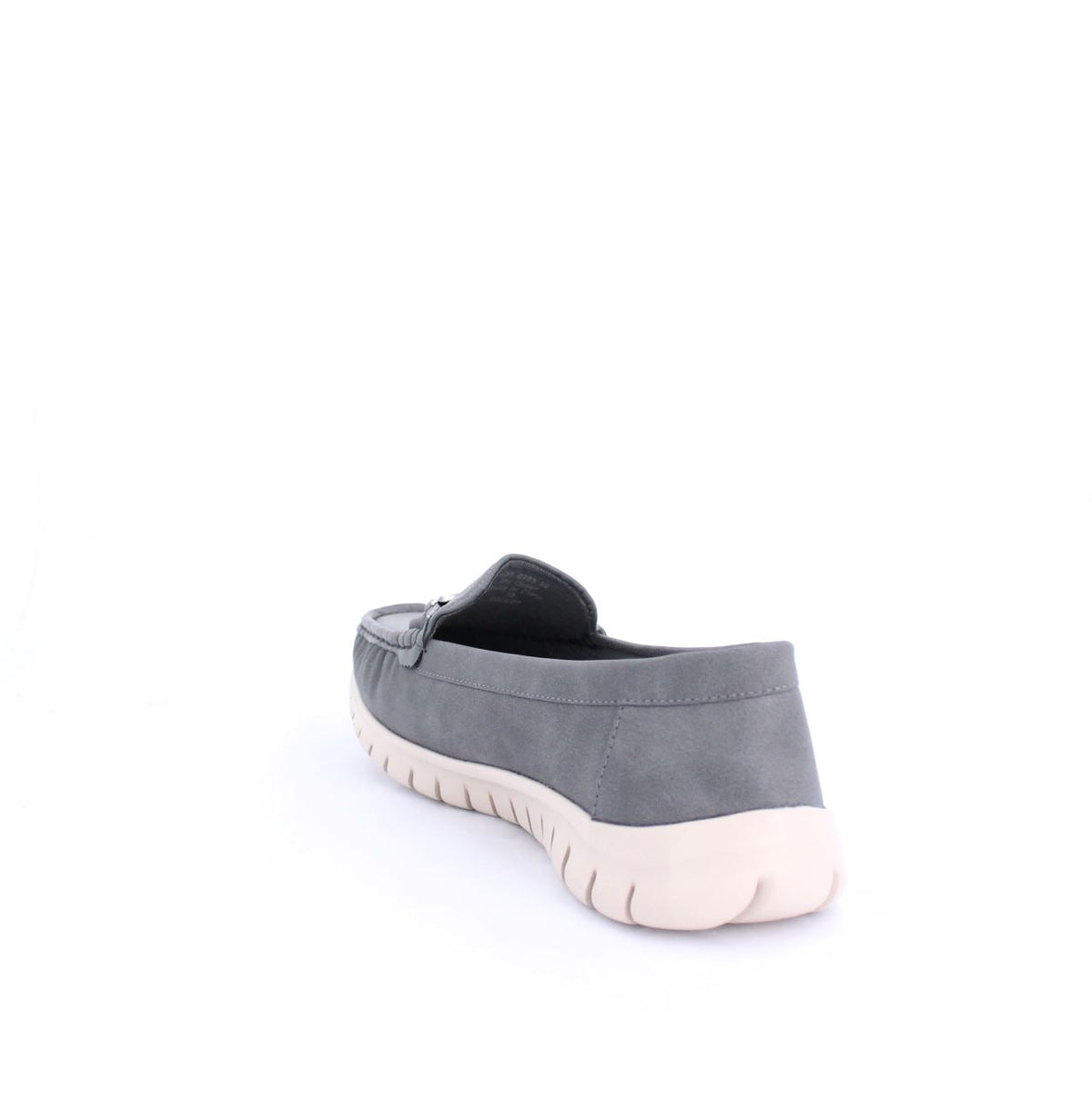 A casual loafer-style shoe with a flexible and comfortable design. The shoe features a moccasin-style stitched upper and a small decorative bit on the top. The sole is a contrasting white rubber material, with grooves along the sides and bottom for added flexibility and grip. The soft upper is made of sustainable material gives the shoe a relaxed yet stylish look, making it ideal for casual, everyday wear.