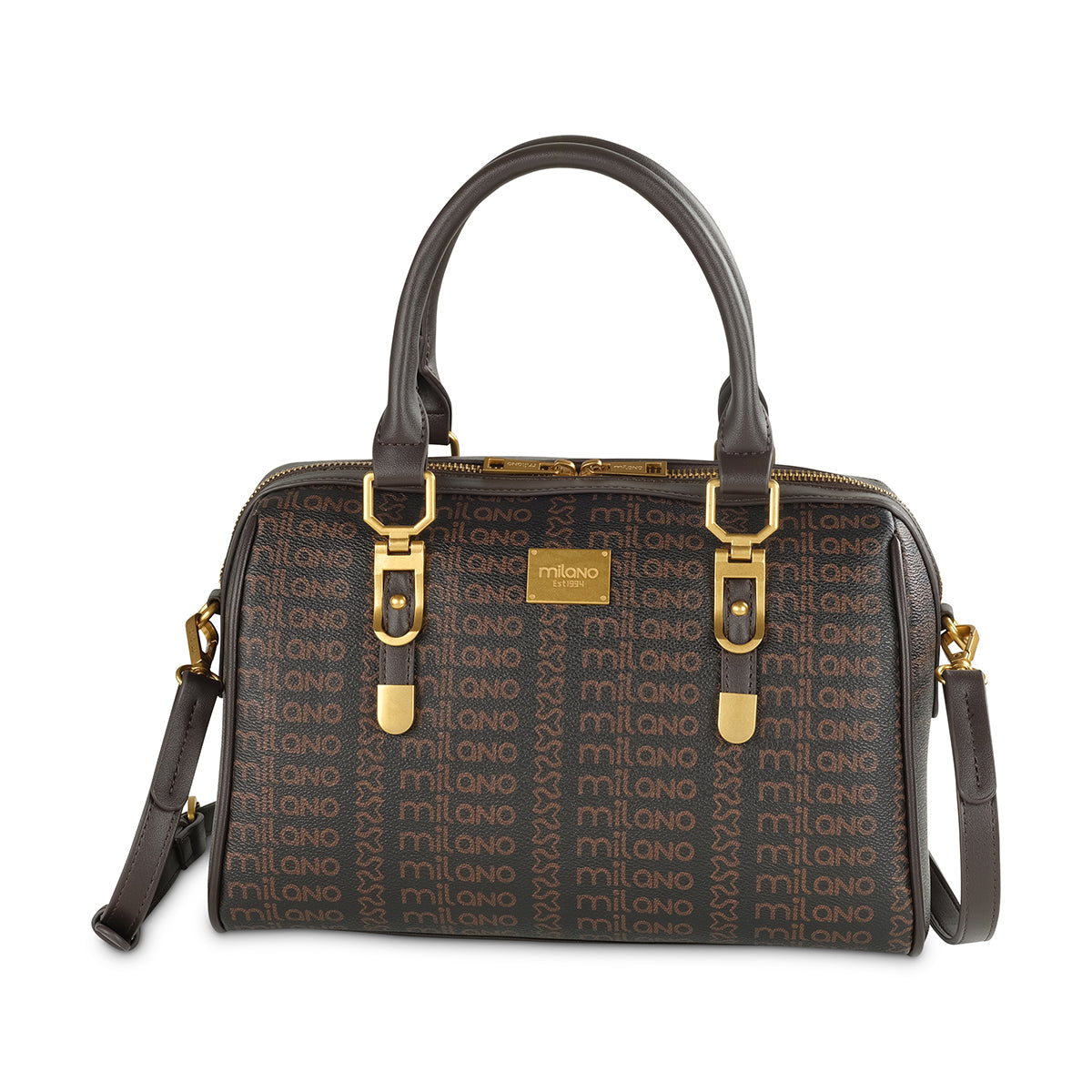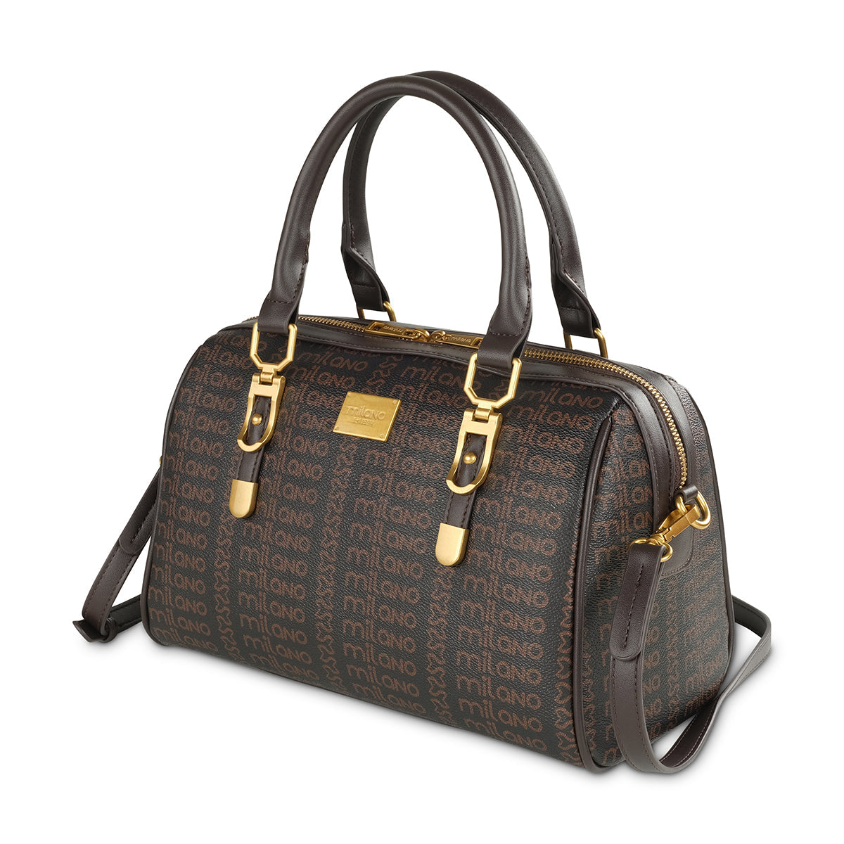 This Brown Milano monogram barrel bag comes with a twin set of premium handles and brass hardware, including our signature Milano branded plate. With zip closure, internal compartments and an additional long strap to be worn across the body as well as a cute grab bag.