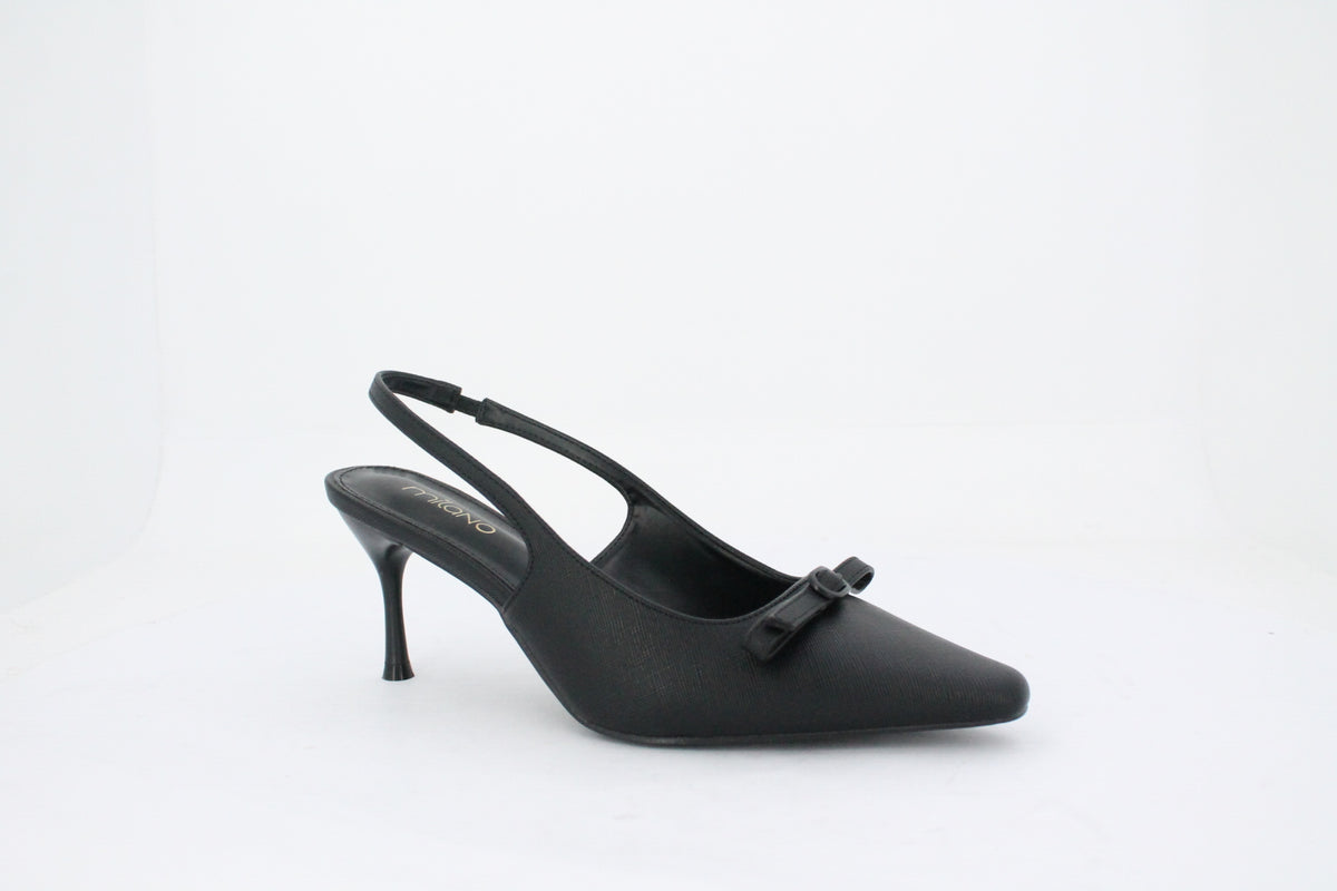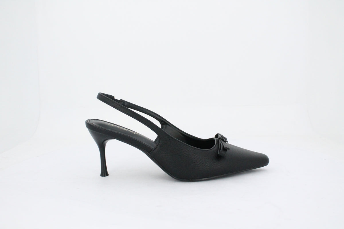 Elevate your ensemble with the sophisticated Frayda Stiletto slingbacks. Crafted in a chic saffiano material. These slingbacks feature a classic sligtly chiseled toe and a delicate bow accent for a touch of feminine grace. The elegant stiletto heel offers a refined lift, perfect for any occasion. It comes with a matching bag for a coordinated look.