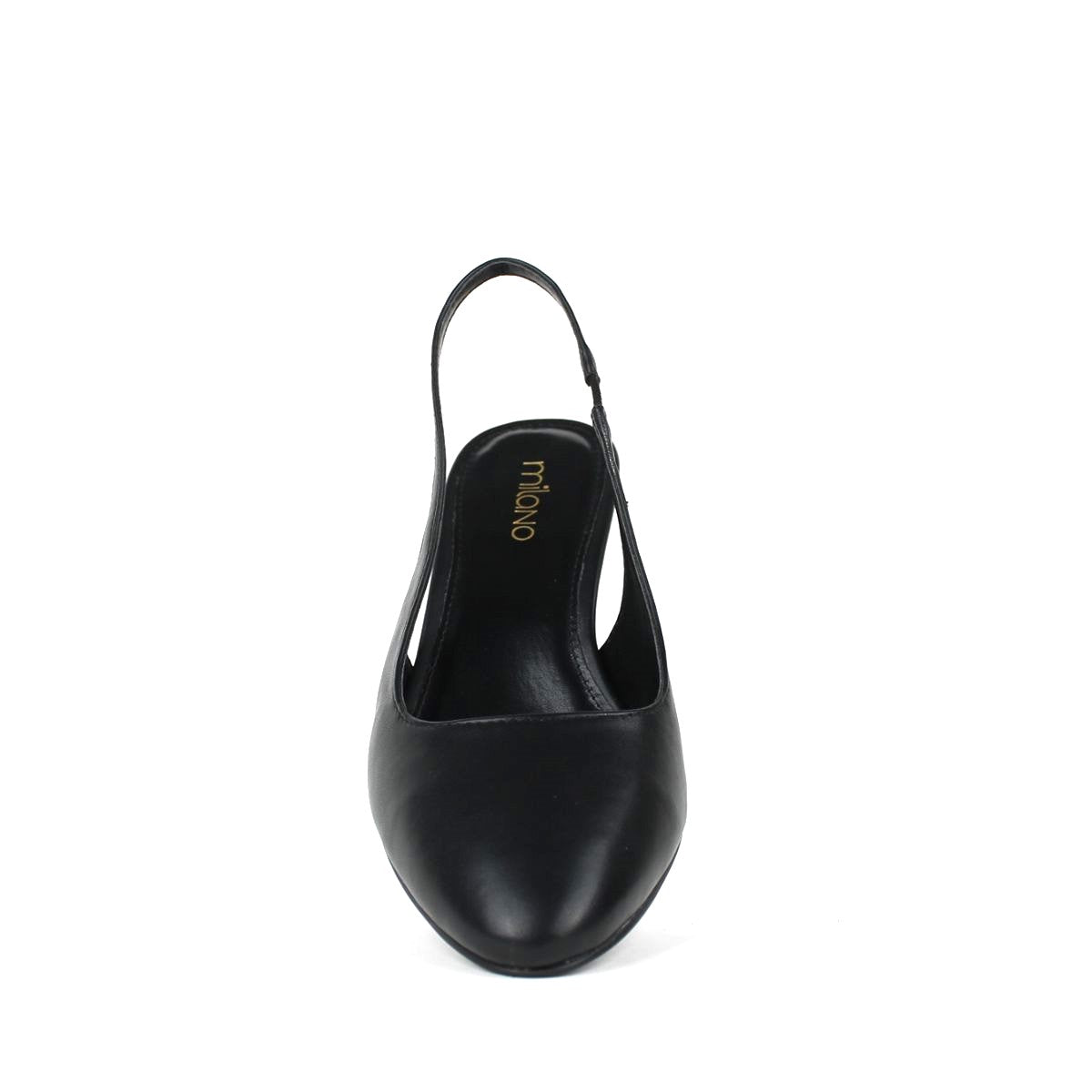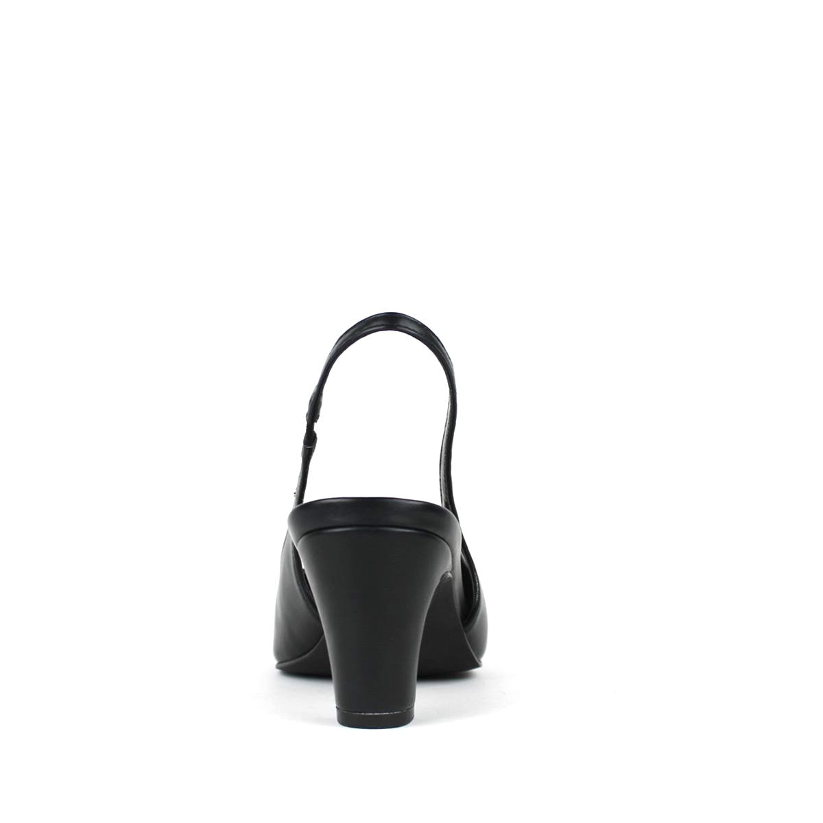 Iya slingback pumps. The shoes feature a smooth, black leather-like upper and a classic almond toe. They are designed with a sturdy, flared block heel for stability. An adjustable slingback strap provides a secure and comfortable fit. Perfect choice for a variety of occasions