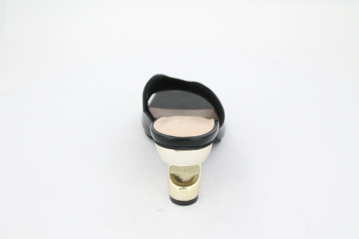 Step out in style with these Karmen Heel Mules. Crafted from smooth black leather like finished, these mules feature a unique, sculptural gold-tone heel and sole that elevates any look. The open back and square toe add a modern touch, making them a statement piece for any fashion-forward wardrobe.